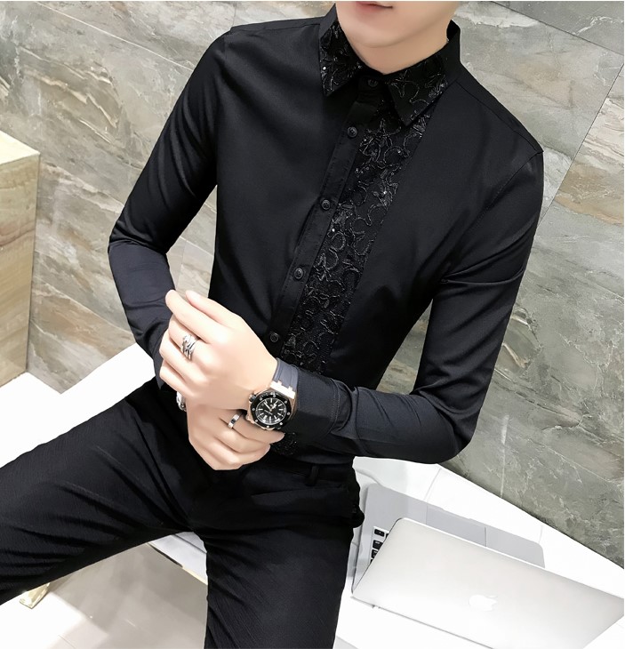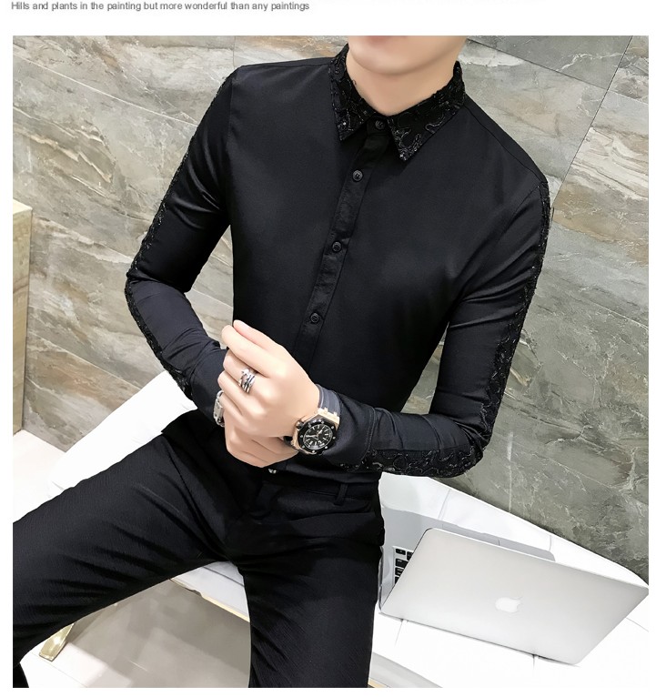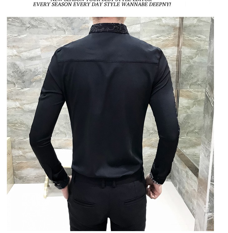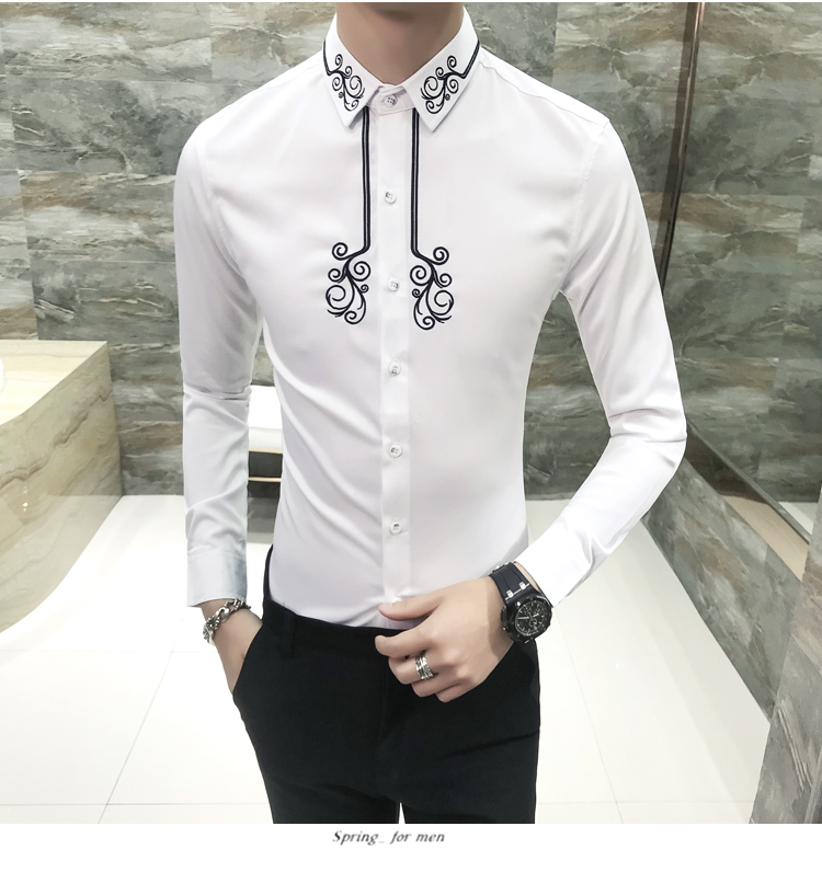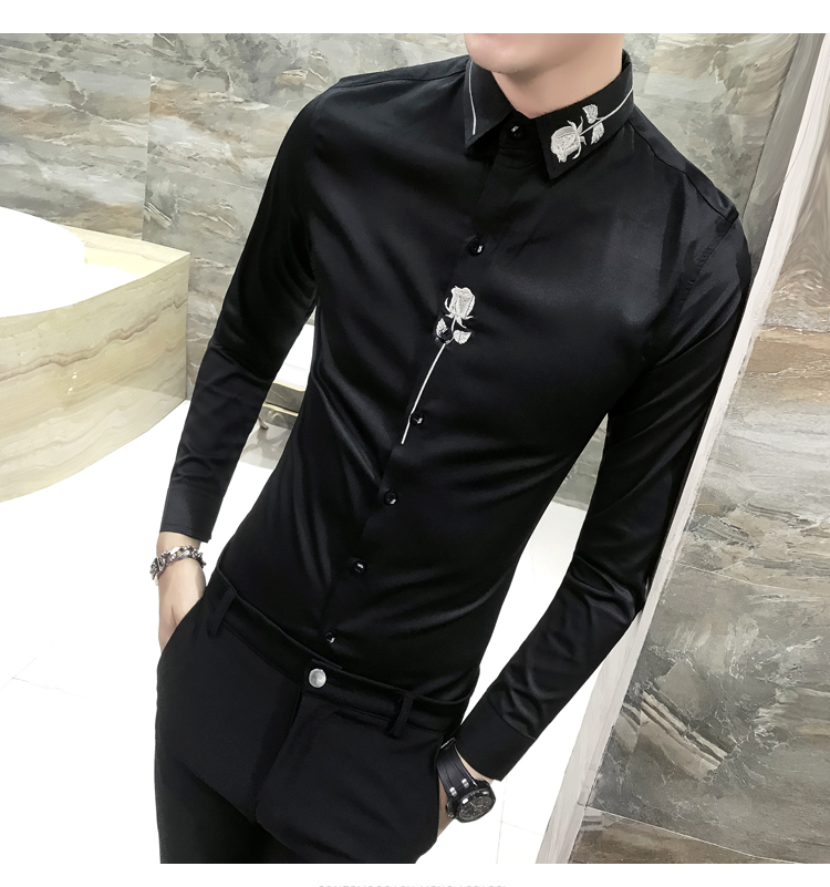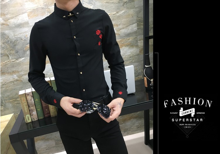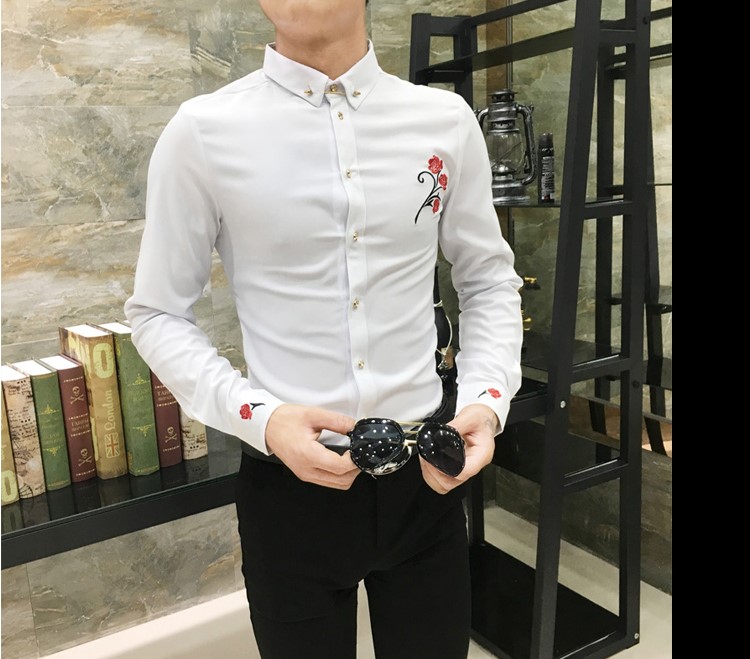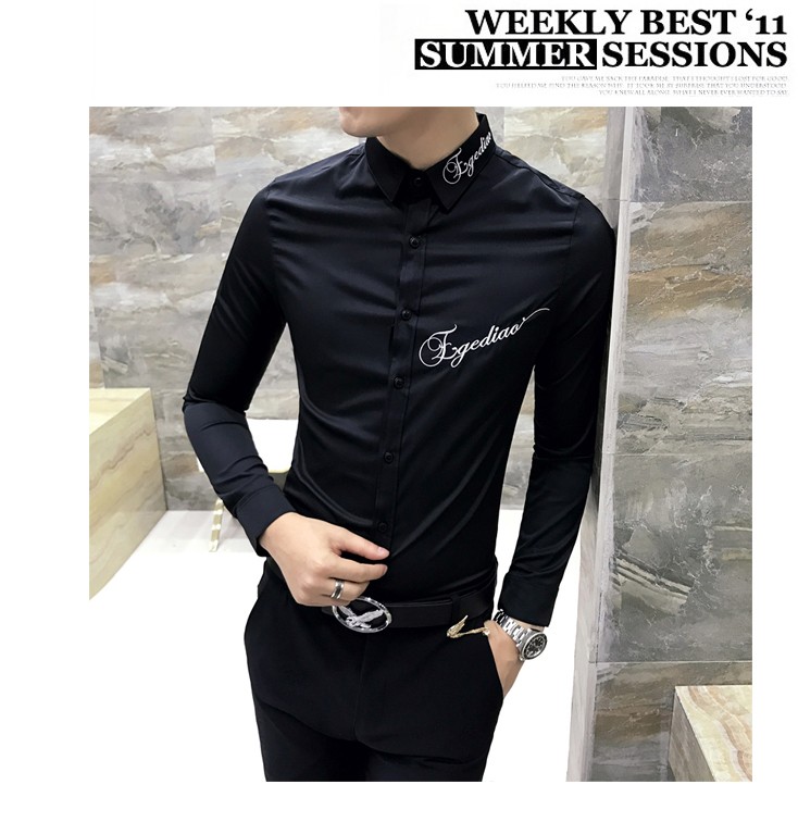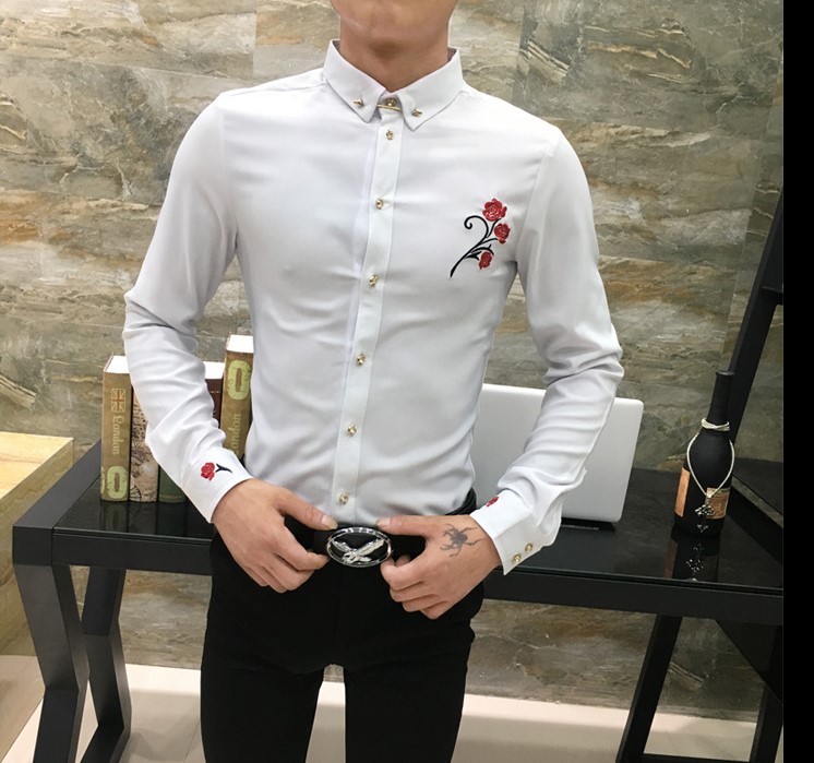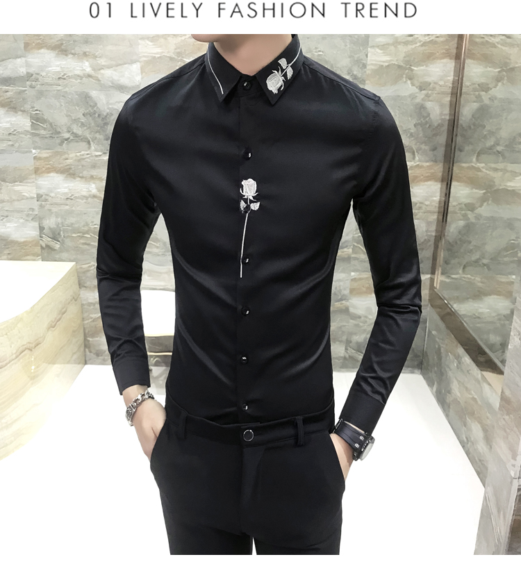 2019秋冬季保暖襯衫潮男韓版個性繡花長袖帥氣發型師修身加絨襯衣1入
