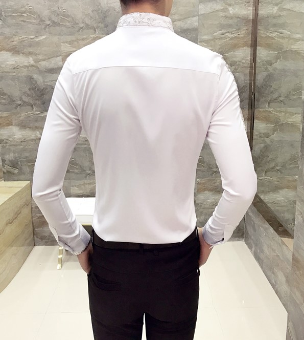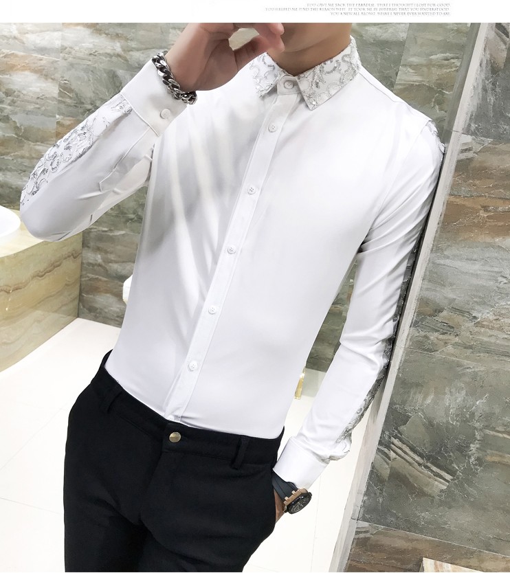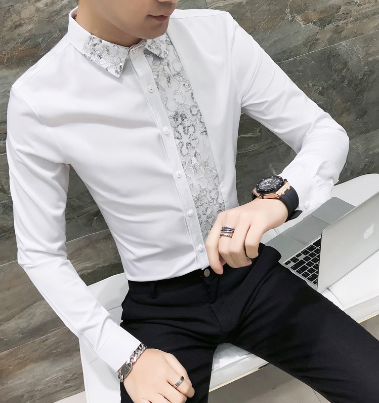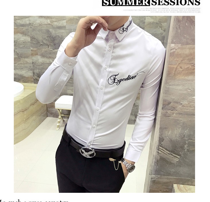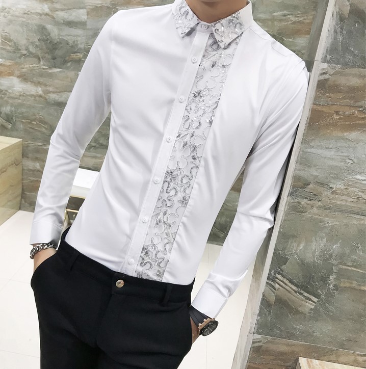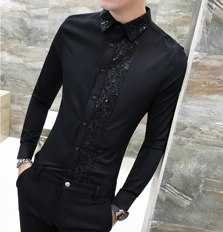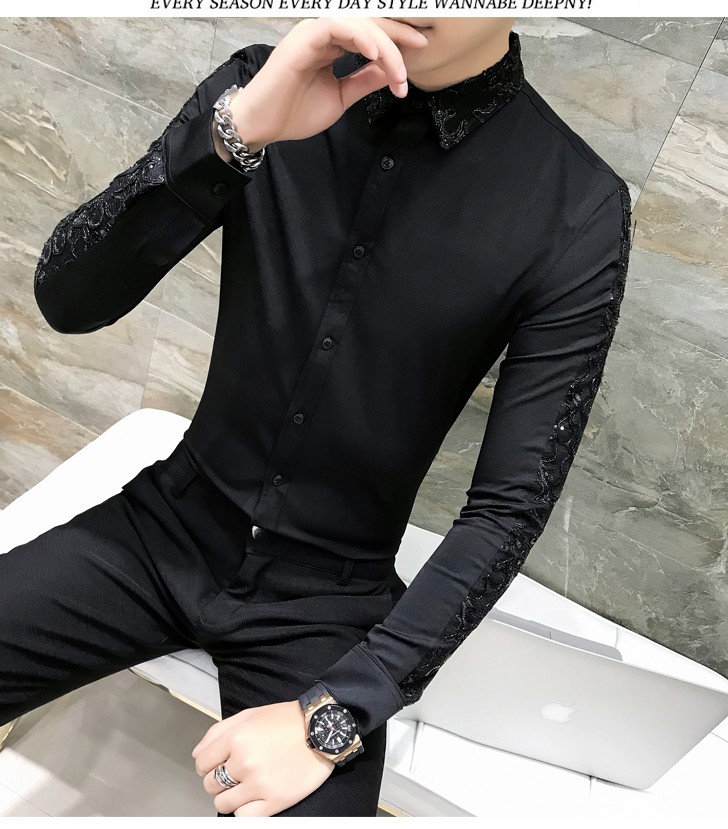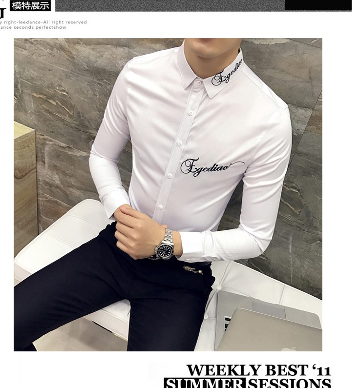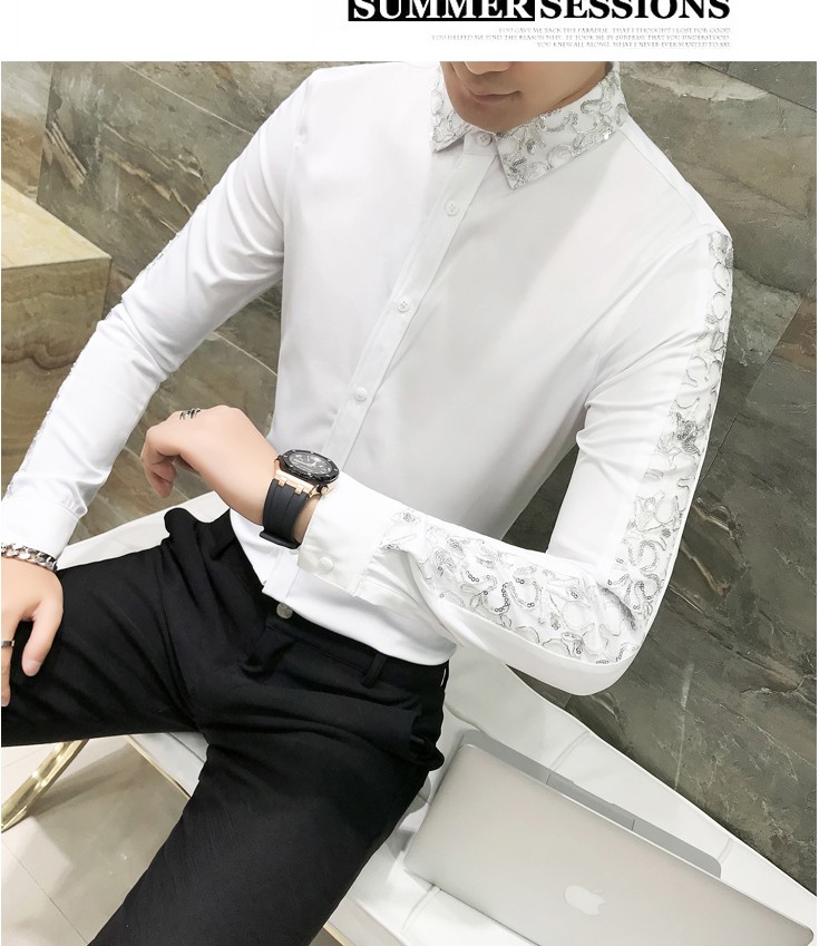2019秋冬季保暖襯衫潮男韓版個性繡花長袖帥氣發型師修身加絨襯衣1入