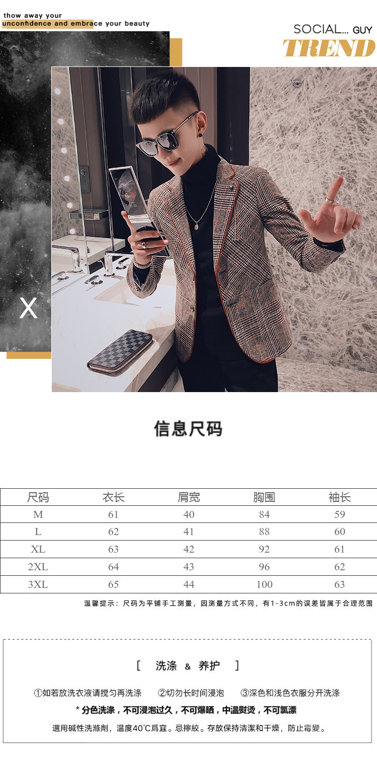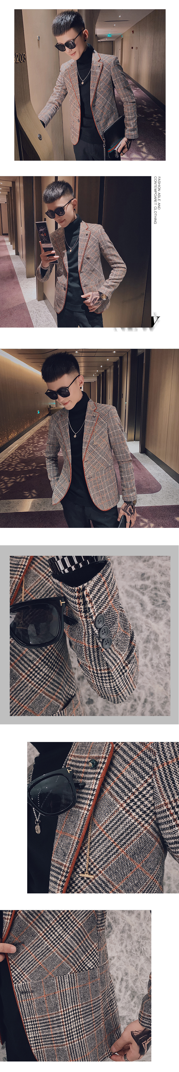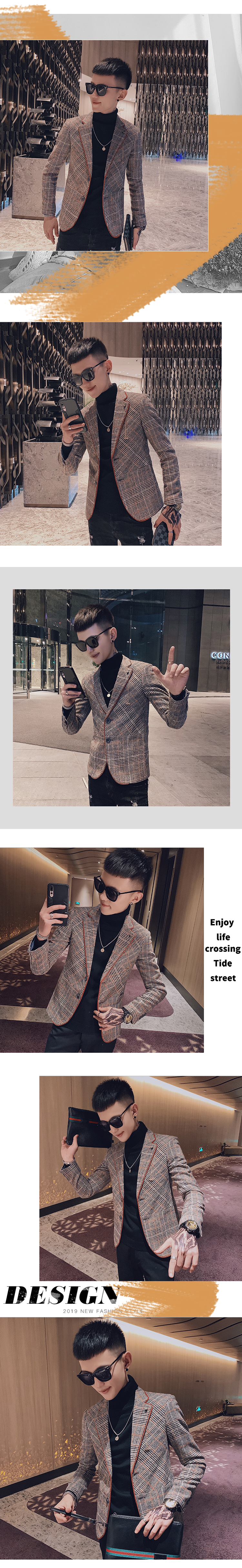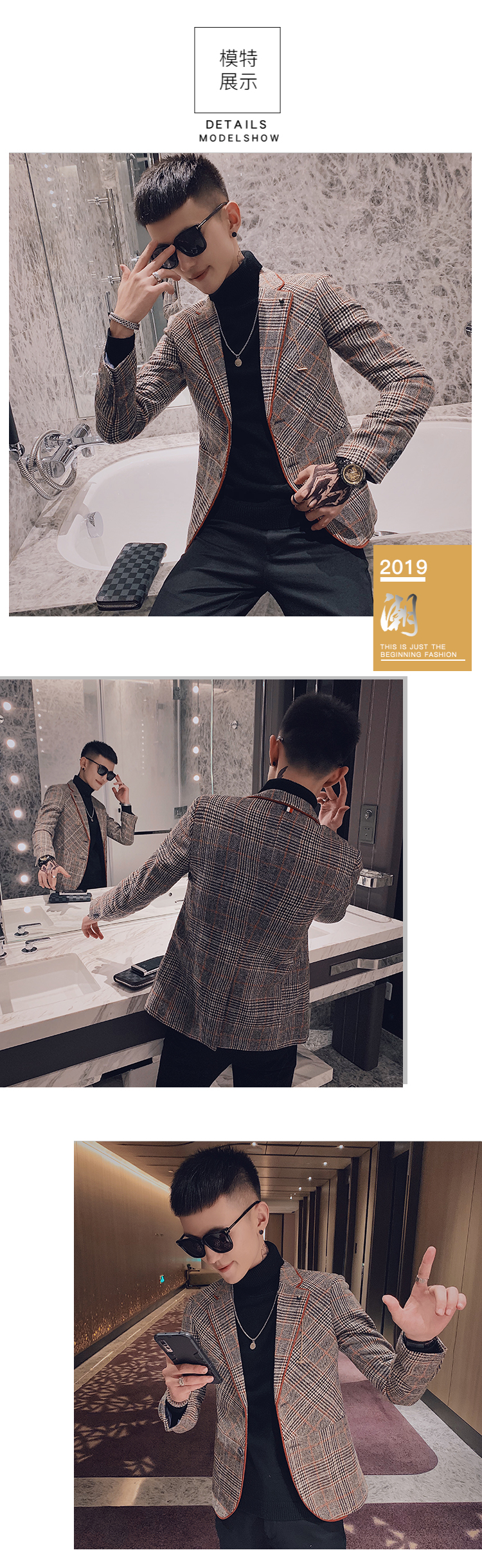 2019秋冬格子小西裝男士韓版休閑單西外套青年網紅帥氣修身西服潮1入