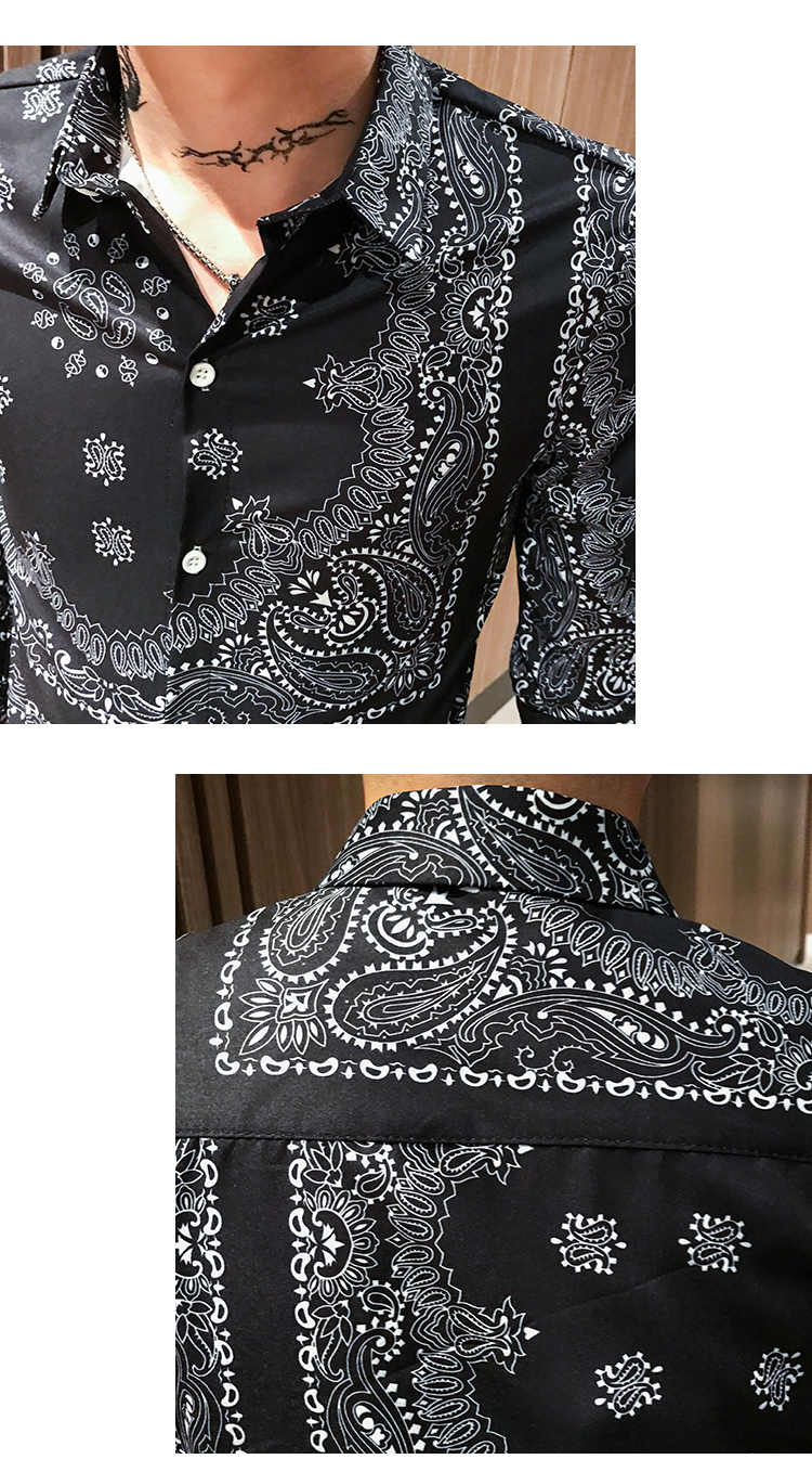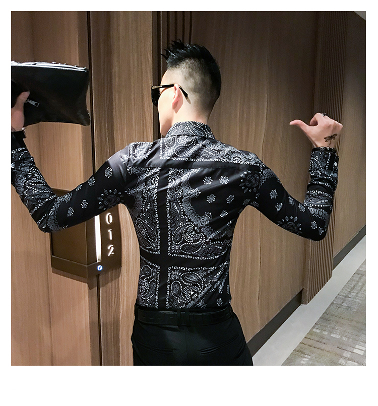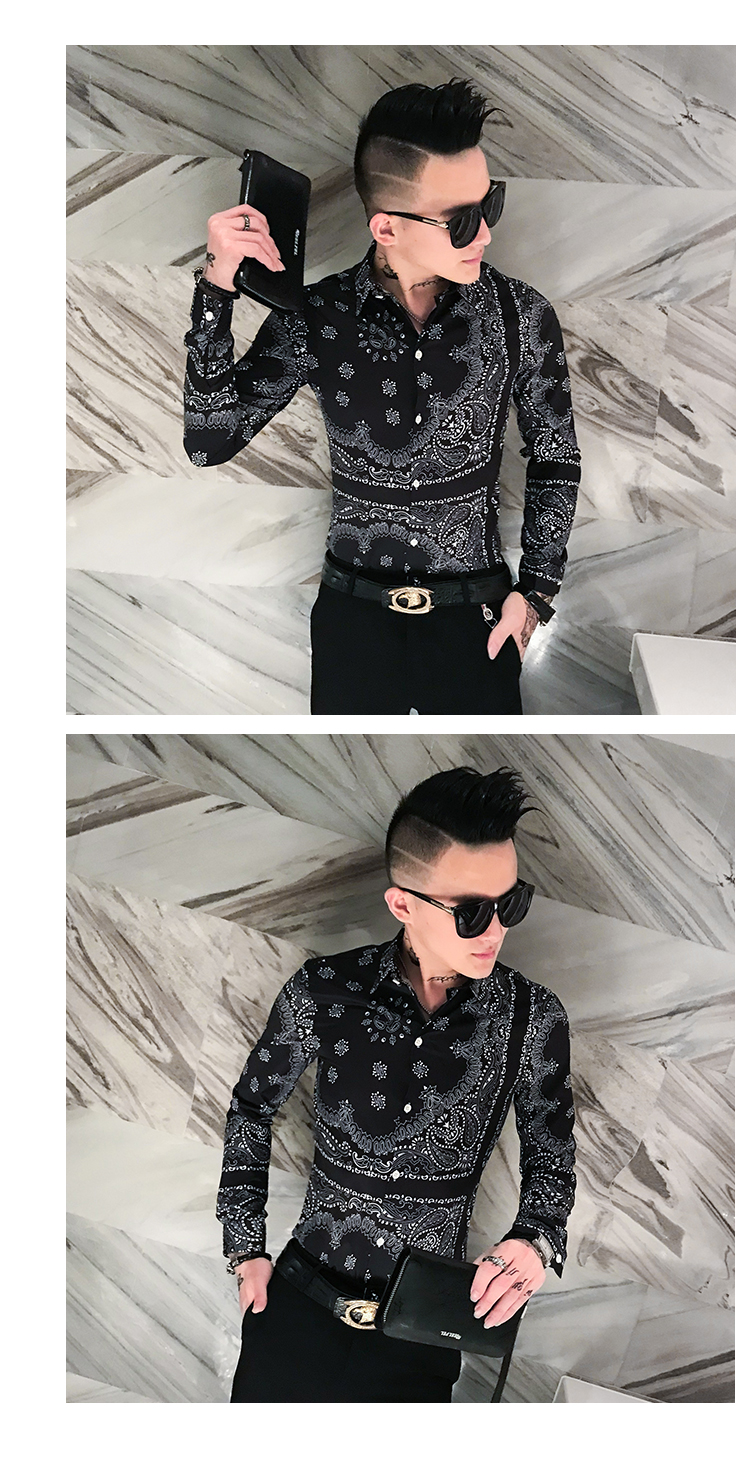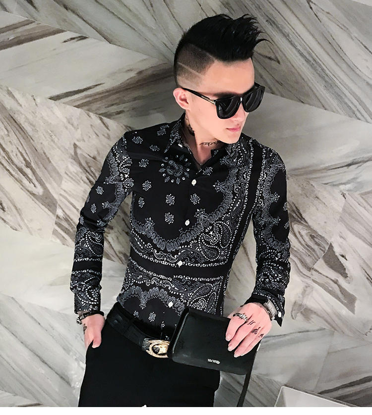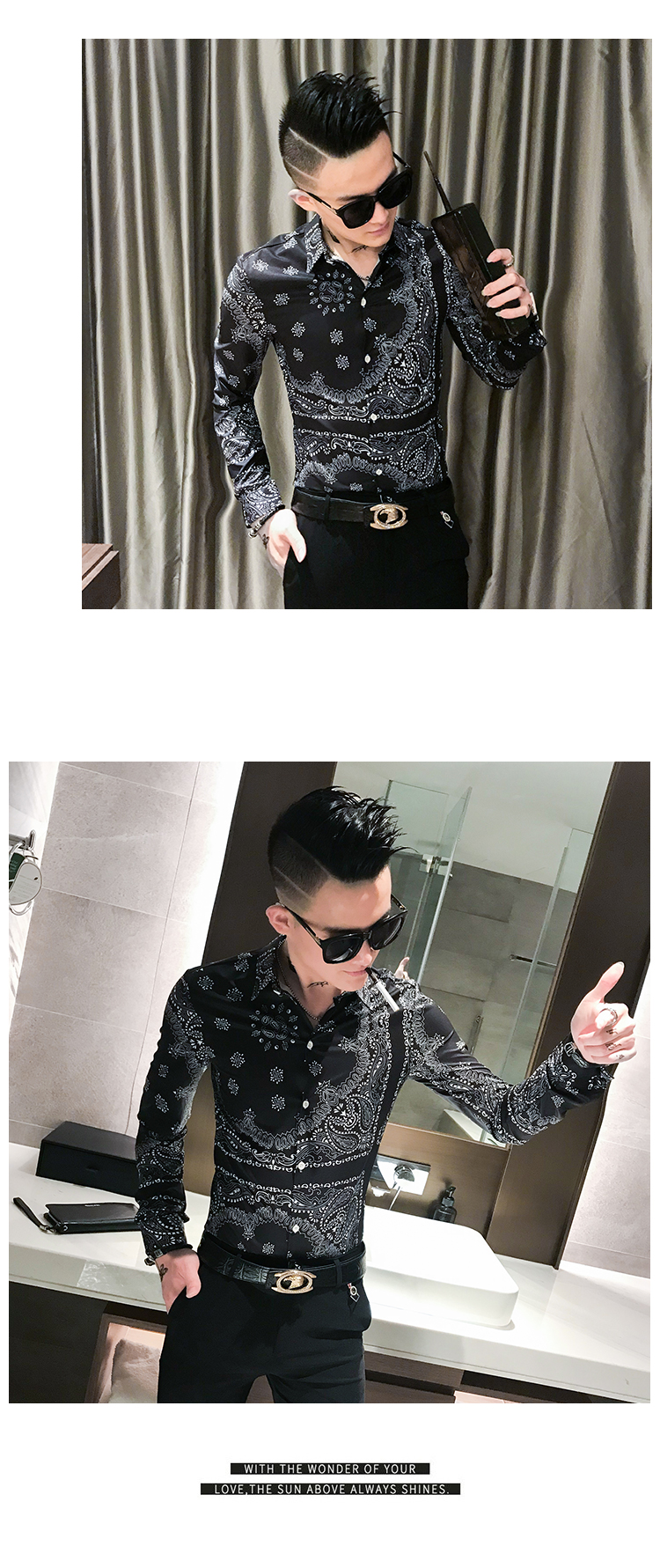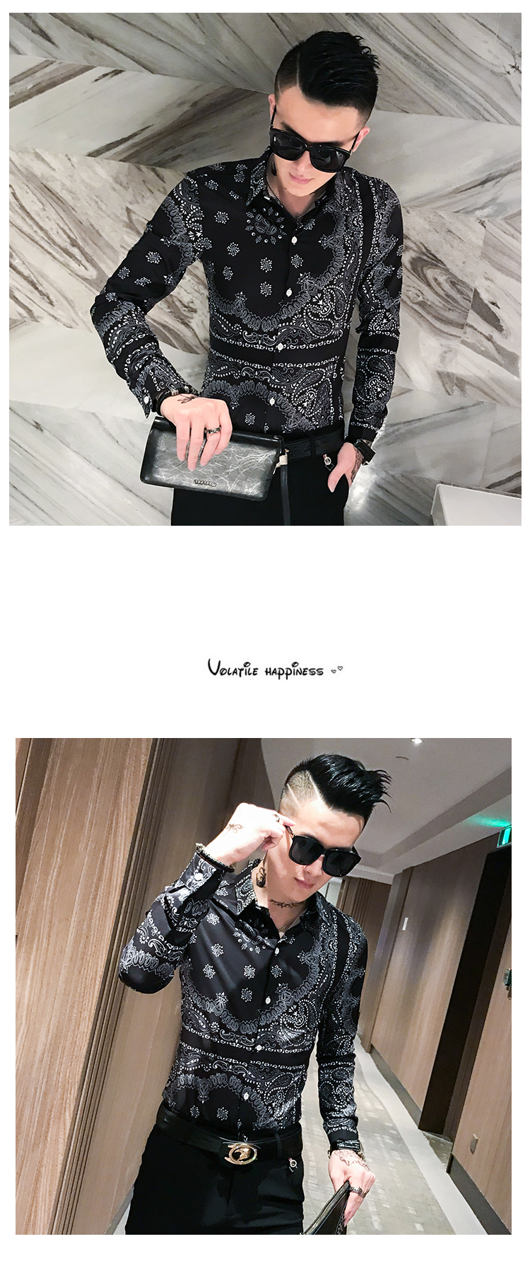 2019新款秋裝男士休閑長袖襯衫發型師韓版修身印花襯衣網紅夜店潮1入