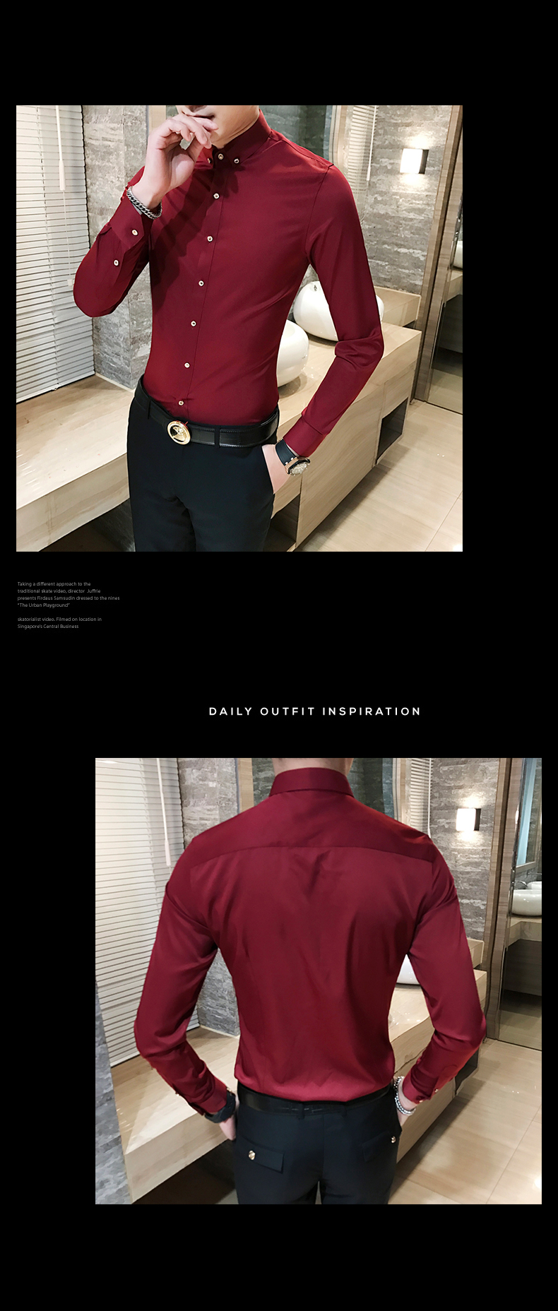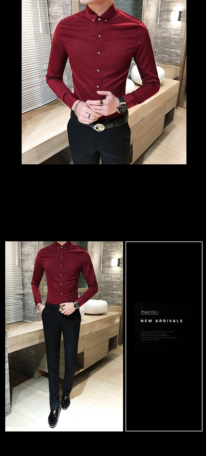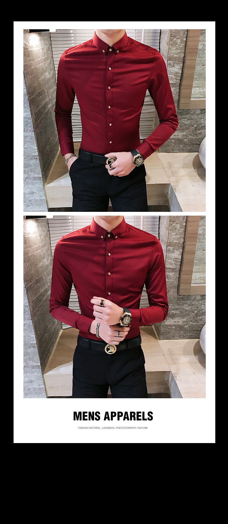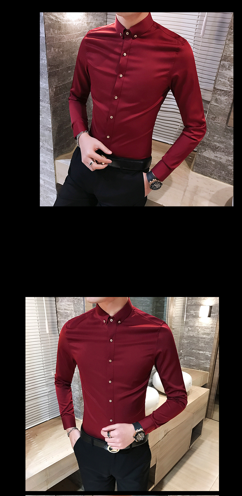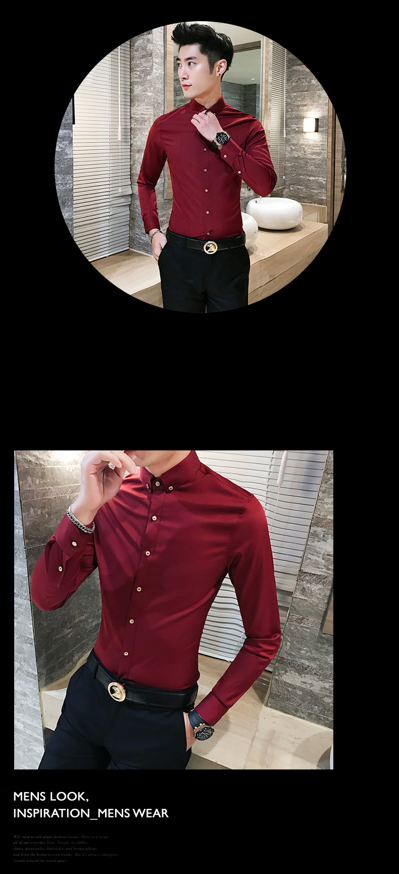 2019秋季新款長袖襯衫男士商務休閑純色立領襯衣男韓版修身酒紅色1入