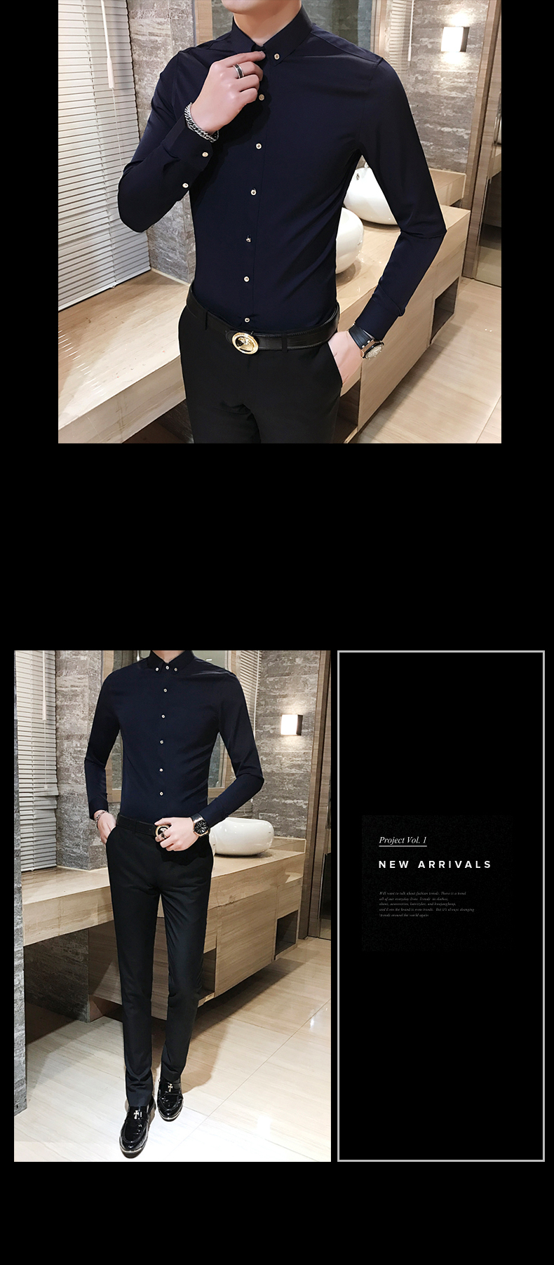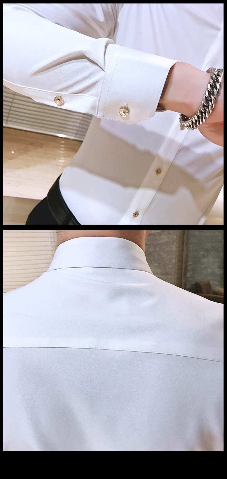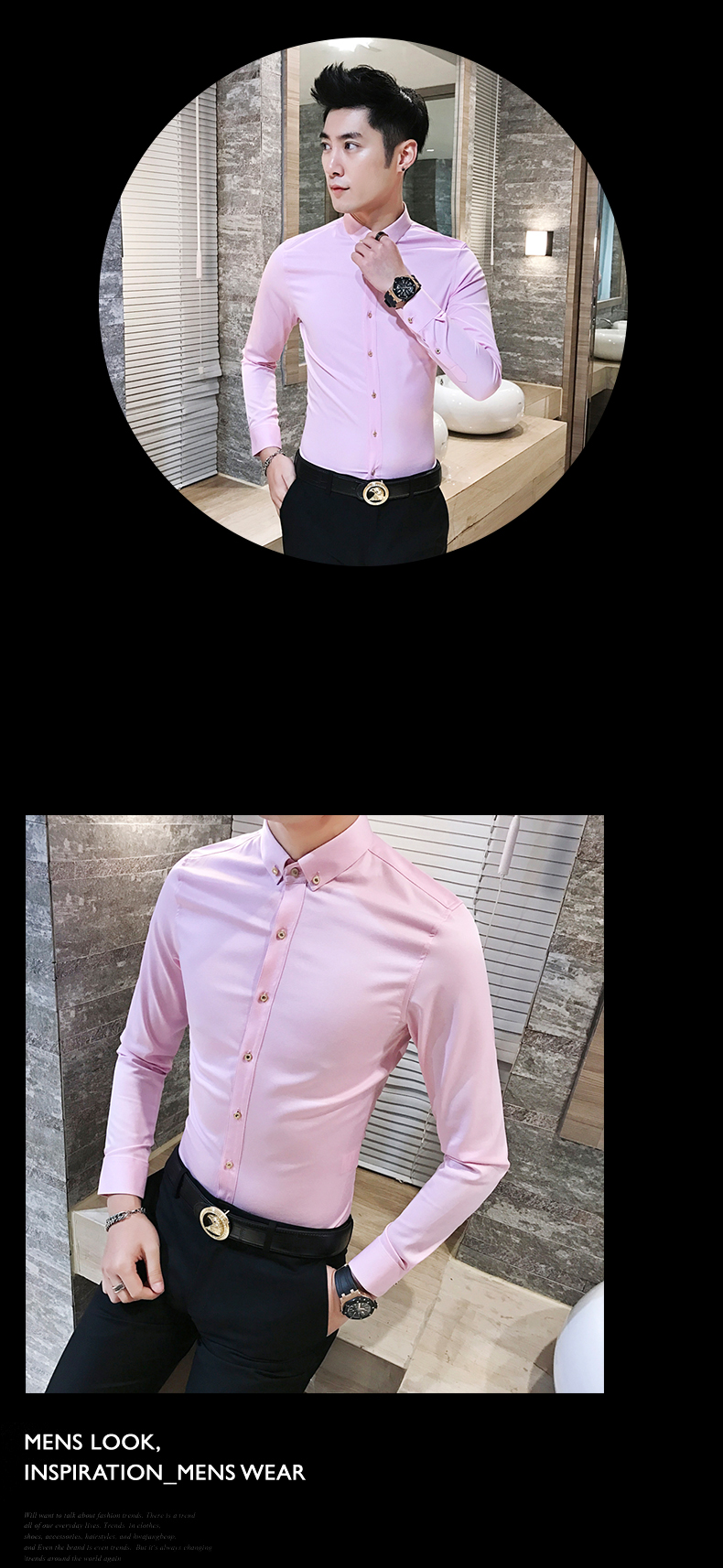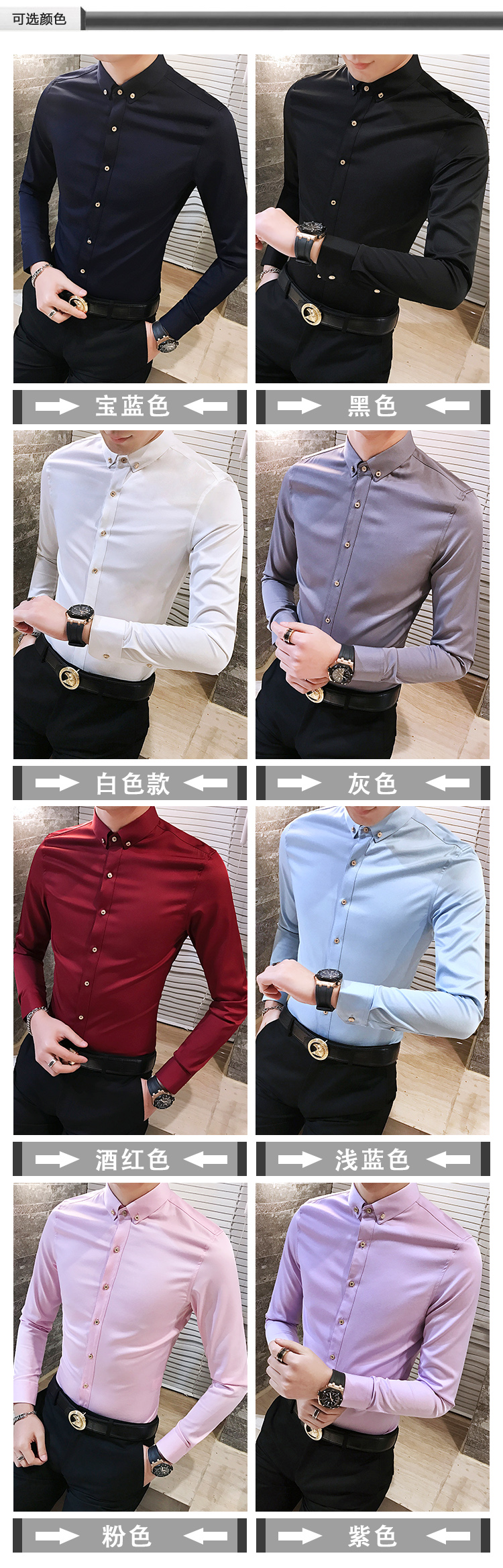 2019秋季新款長袖襯衫男士商務休閑純色立領襯衣男韓版修身酒紅色1入
