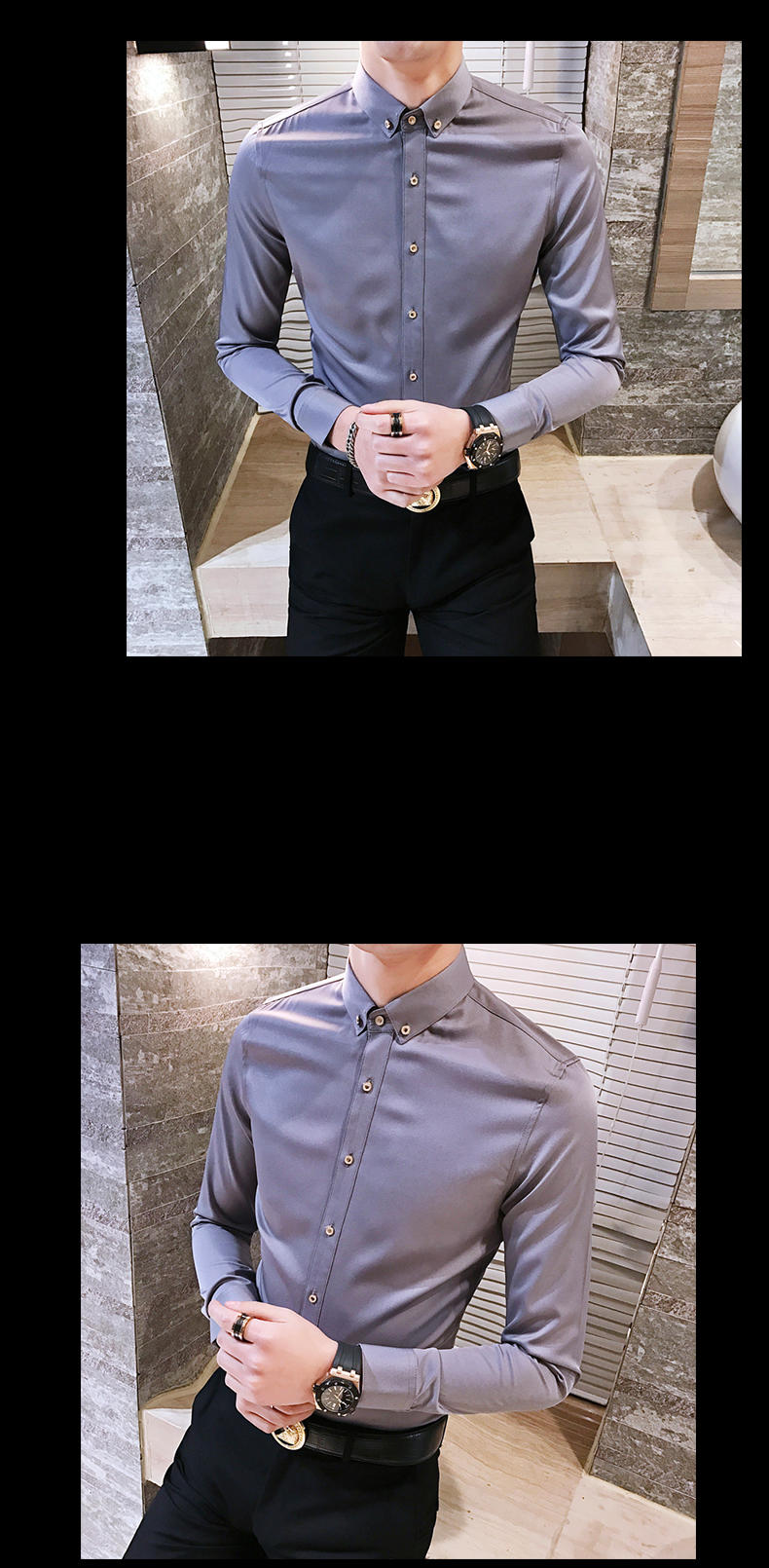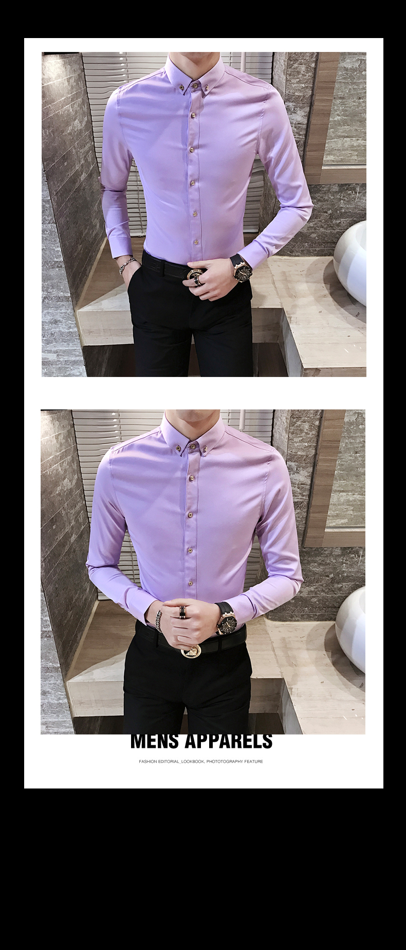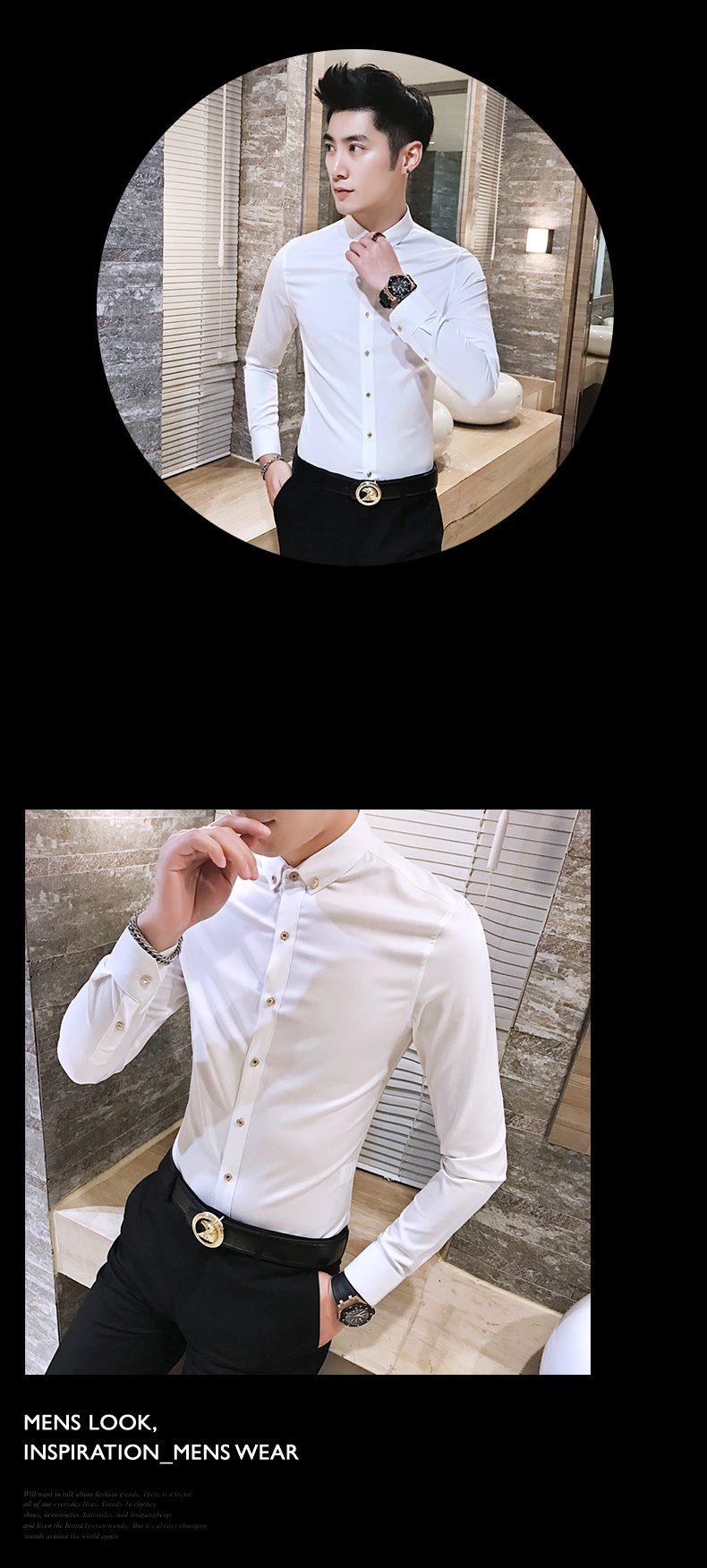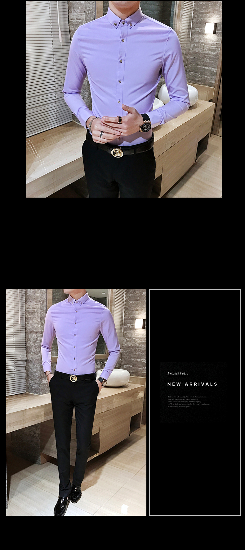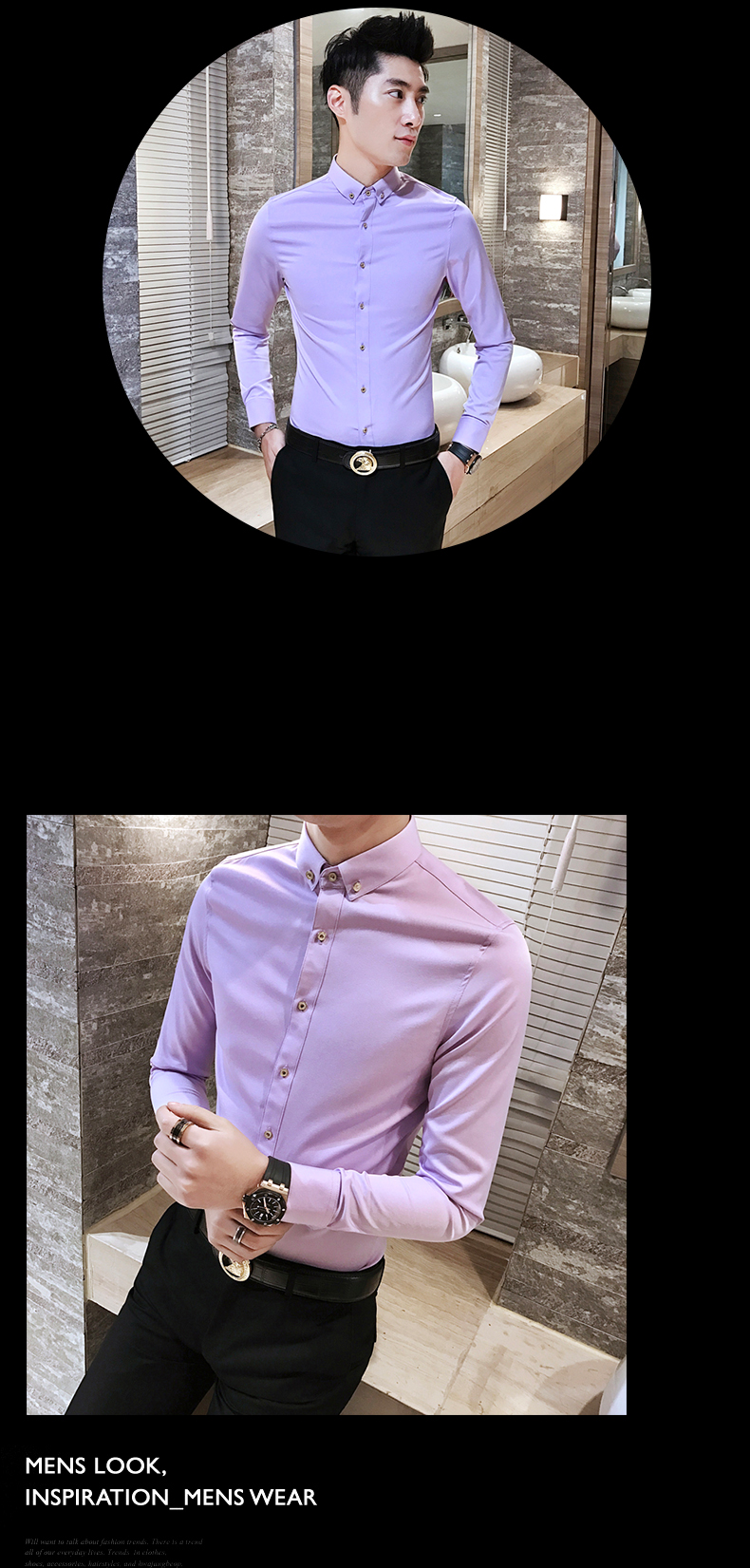 2019秋季新款長袖襯衫男士商務休閑純色立領襯衣男韓版修身酒紅色1入