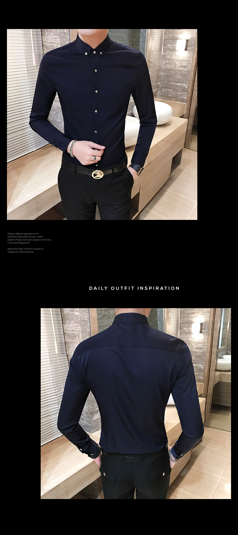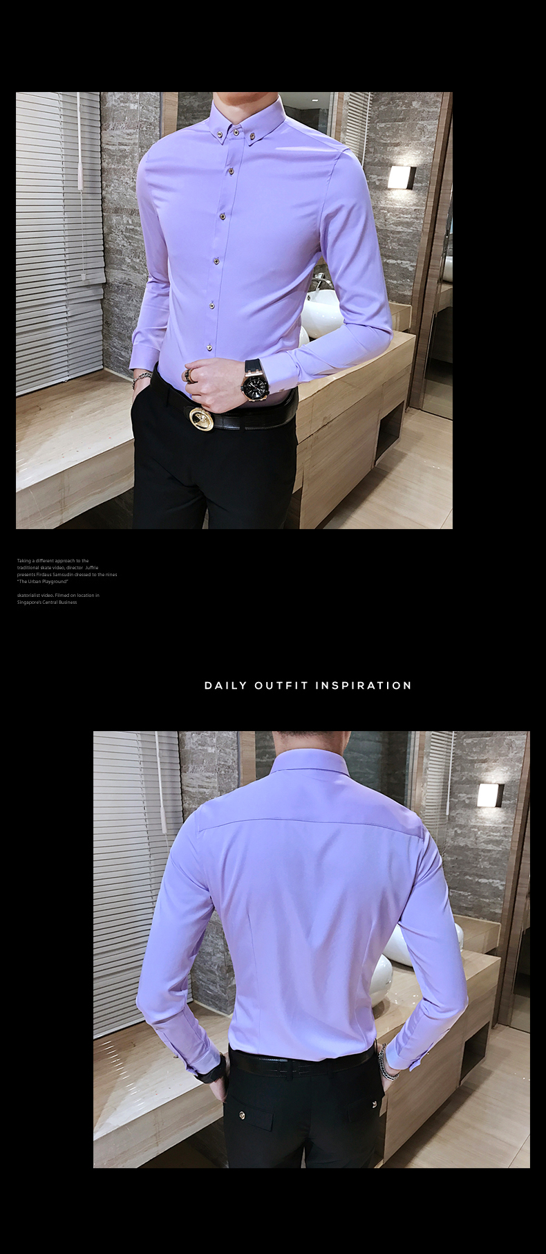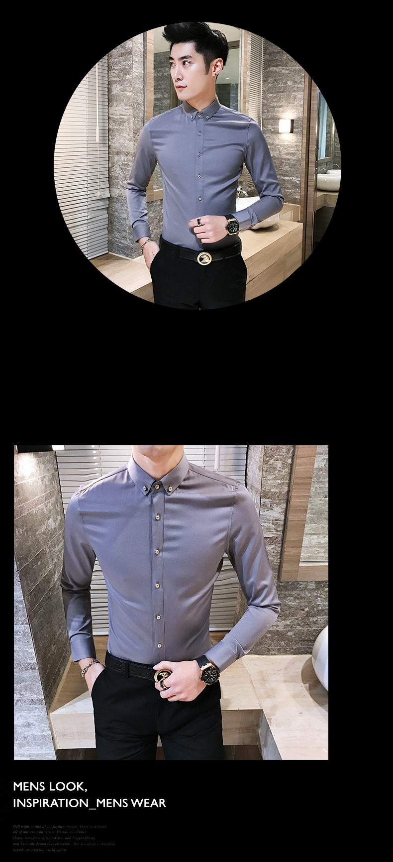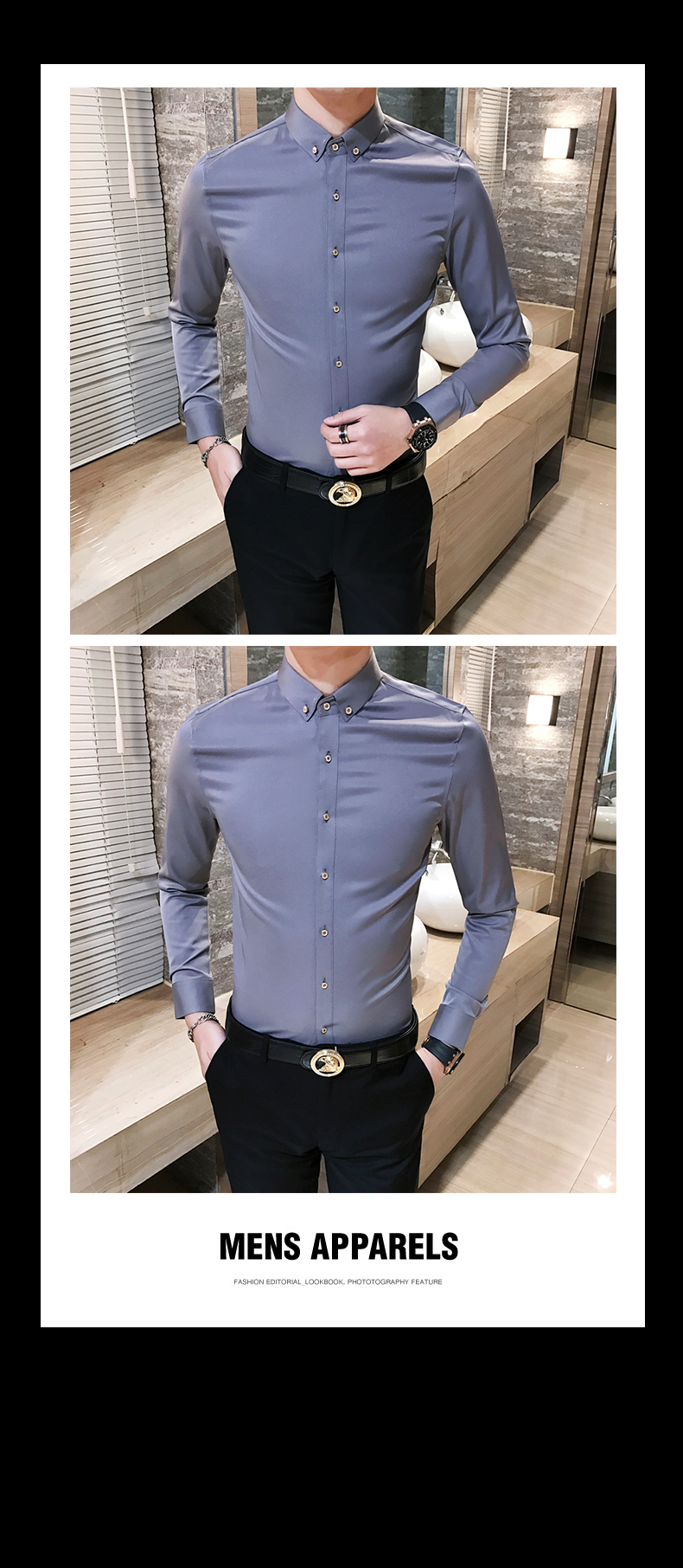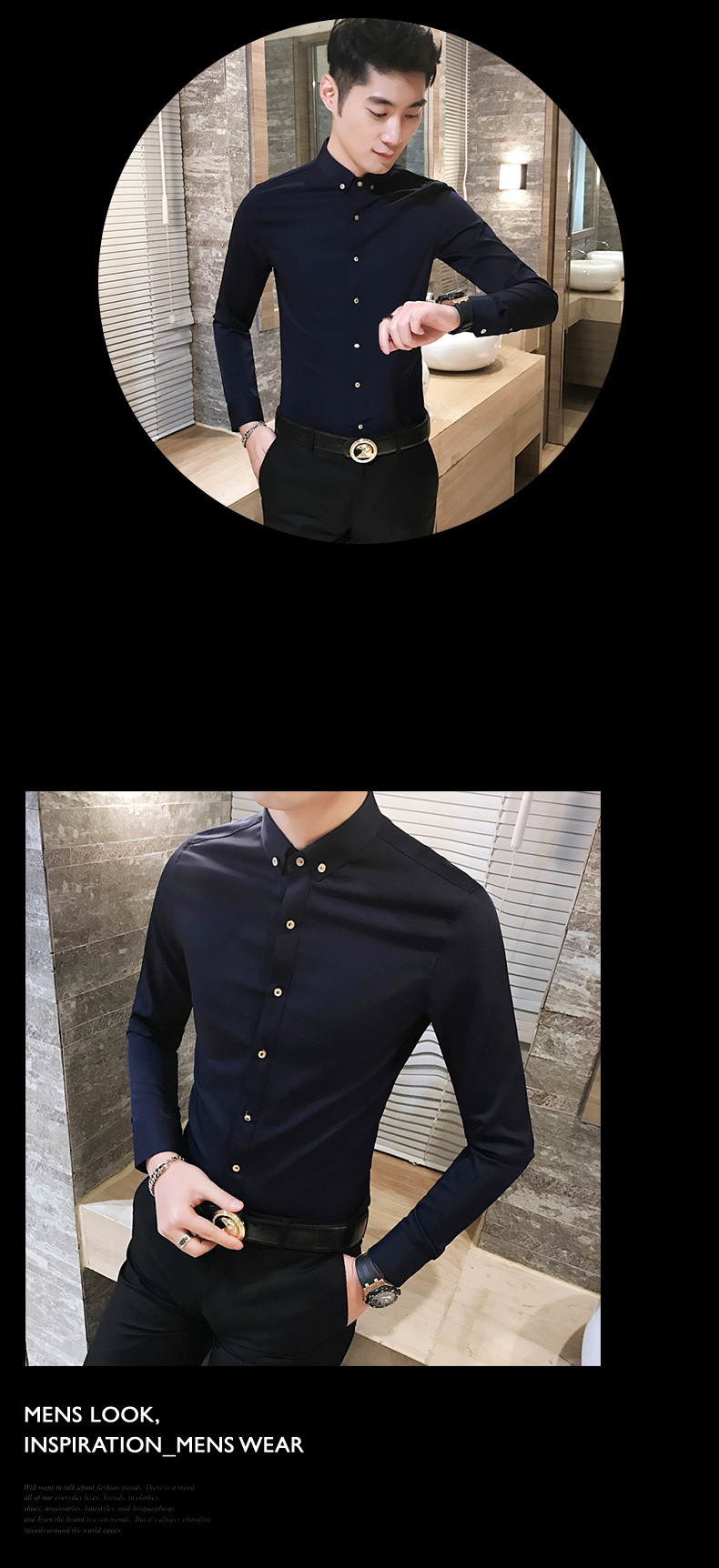 2019秋季新款長袖襯衫男士商務休閑純色立領襯衣男韓版修身酒紅色1入