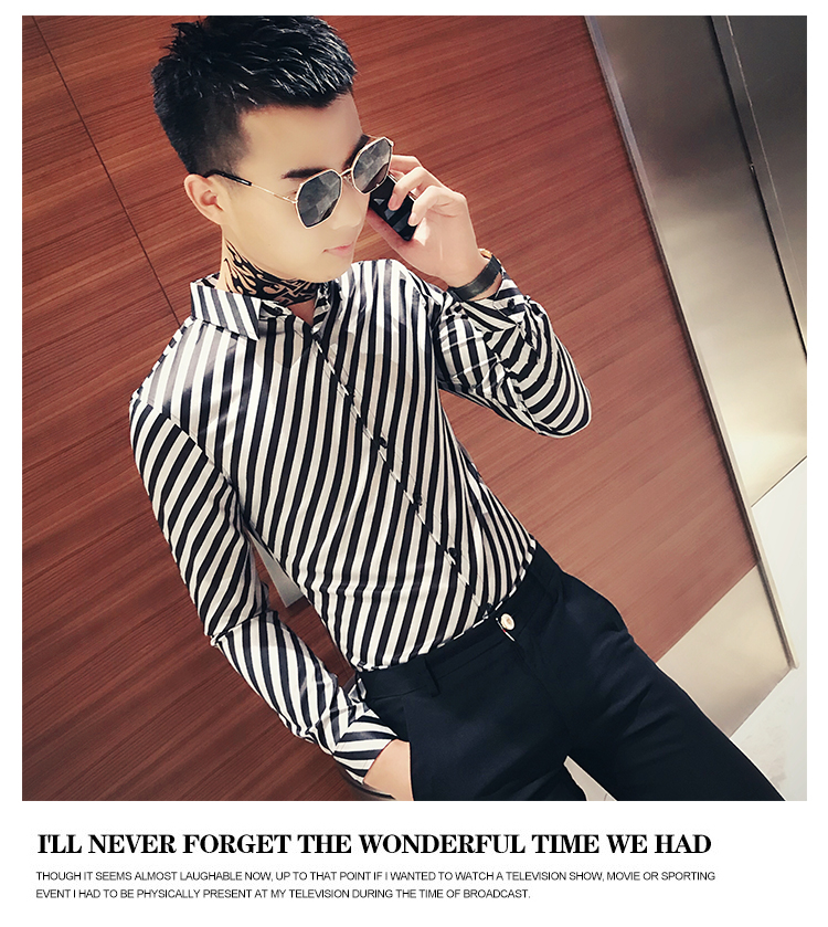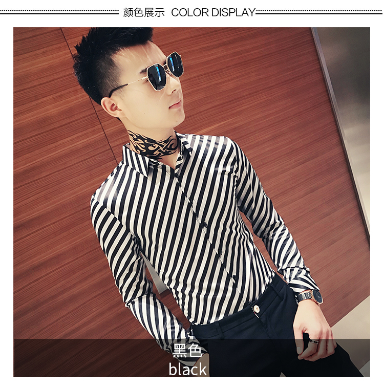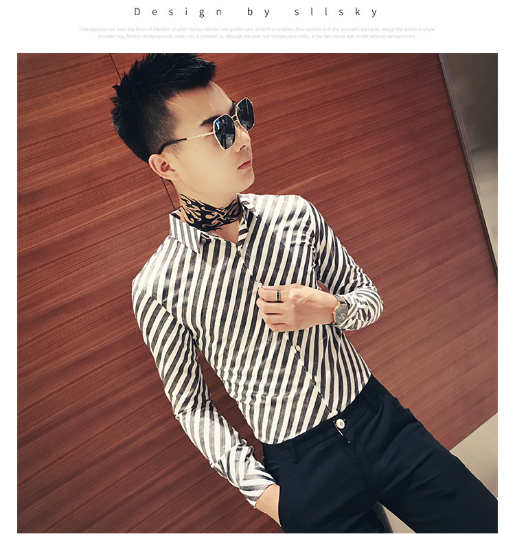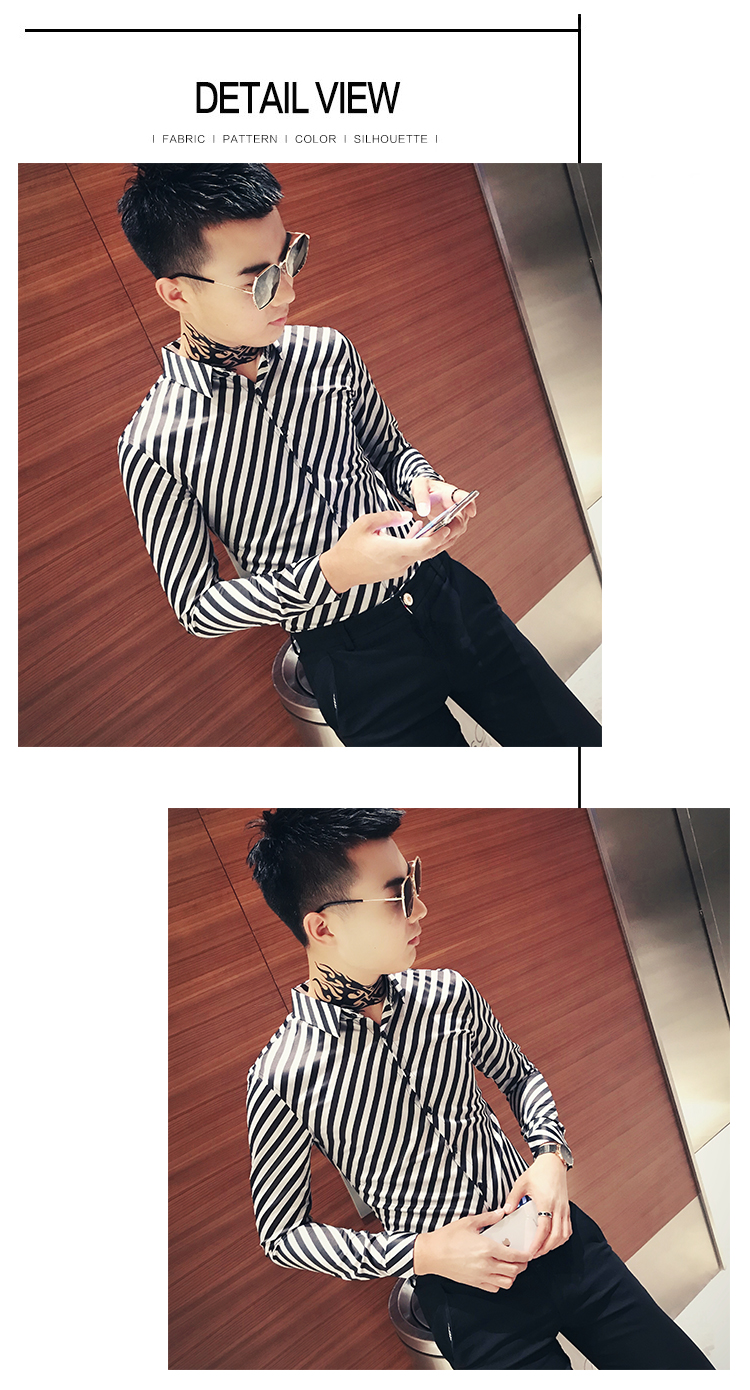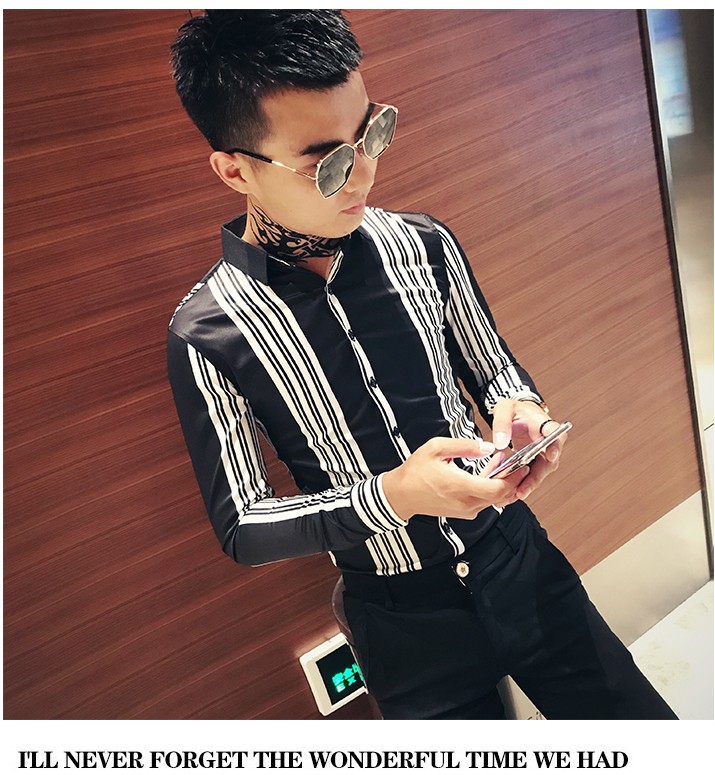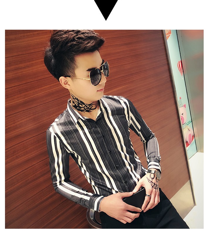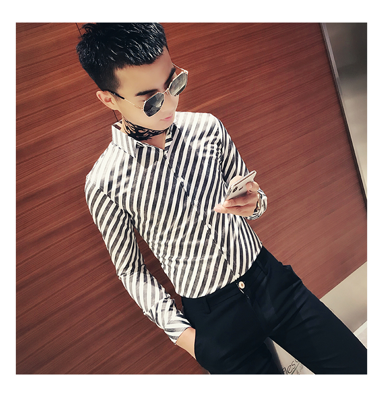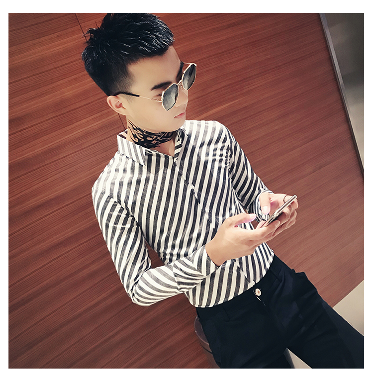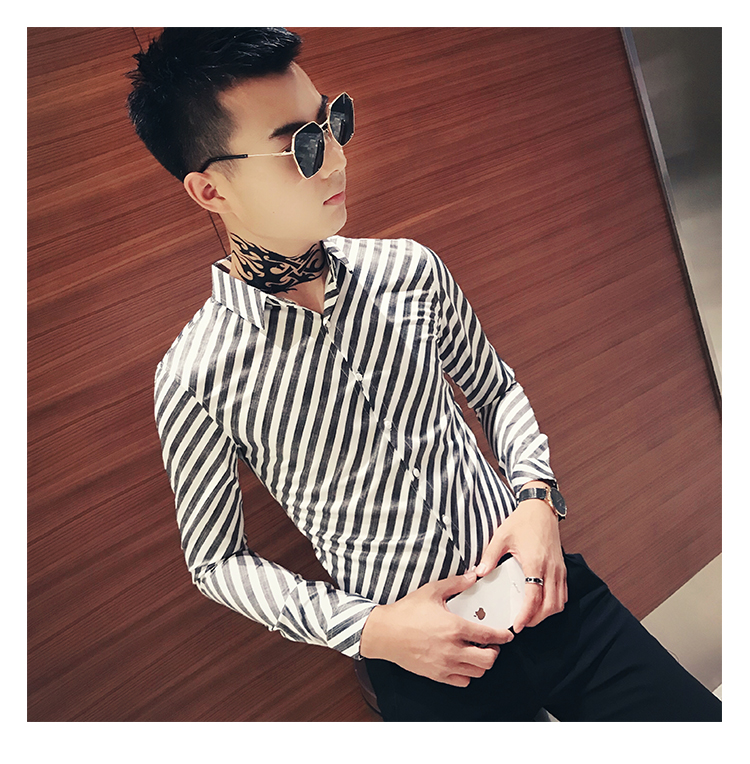 2019秋季修身條紋襯衣社會精神小伙長袖網紅韓版襯衫發型師男裝潮1入