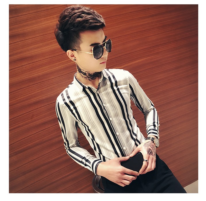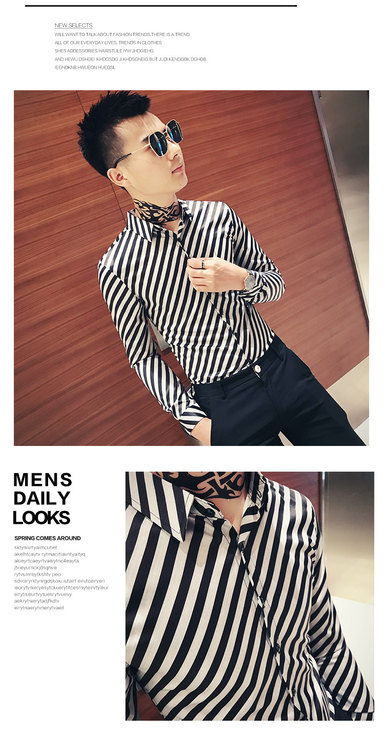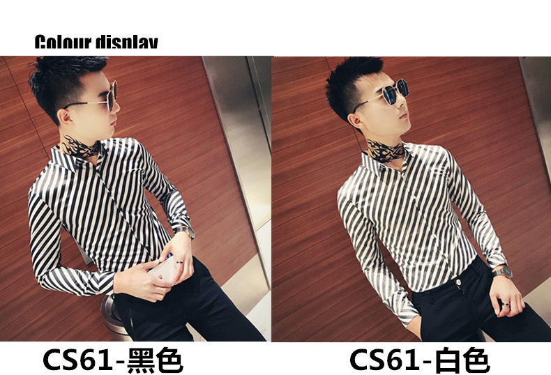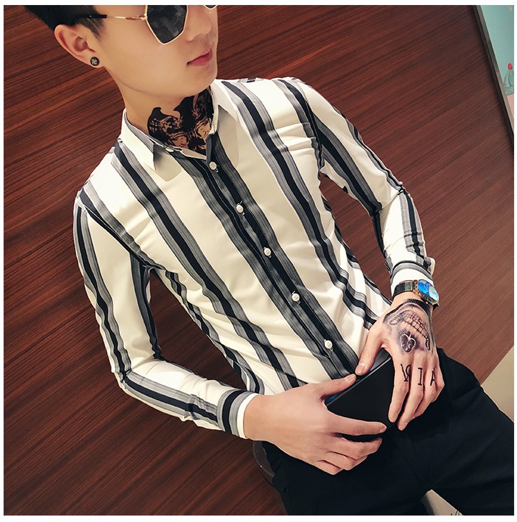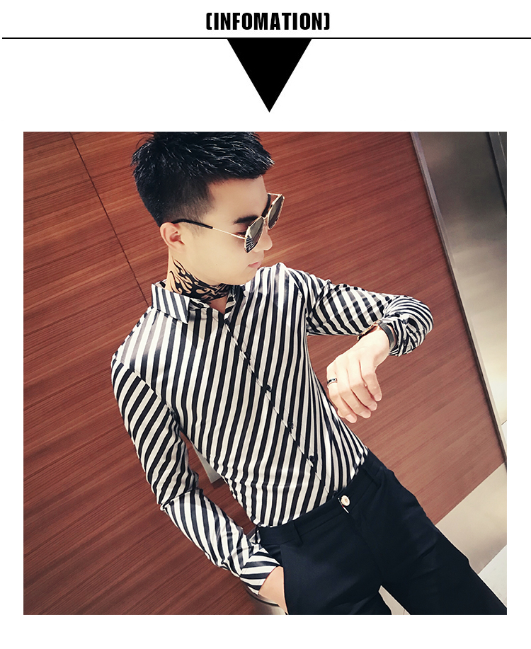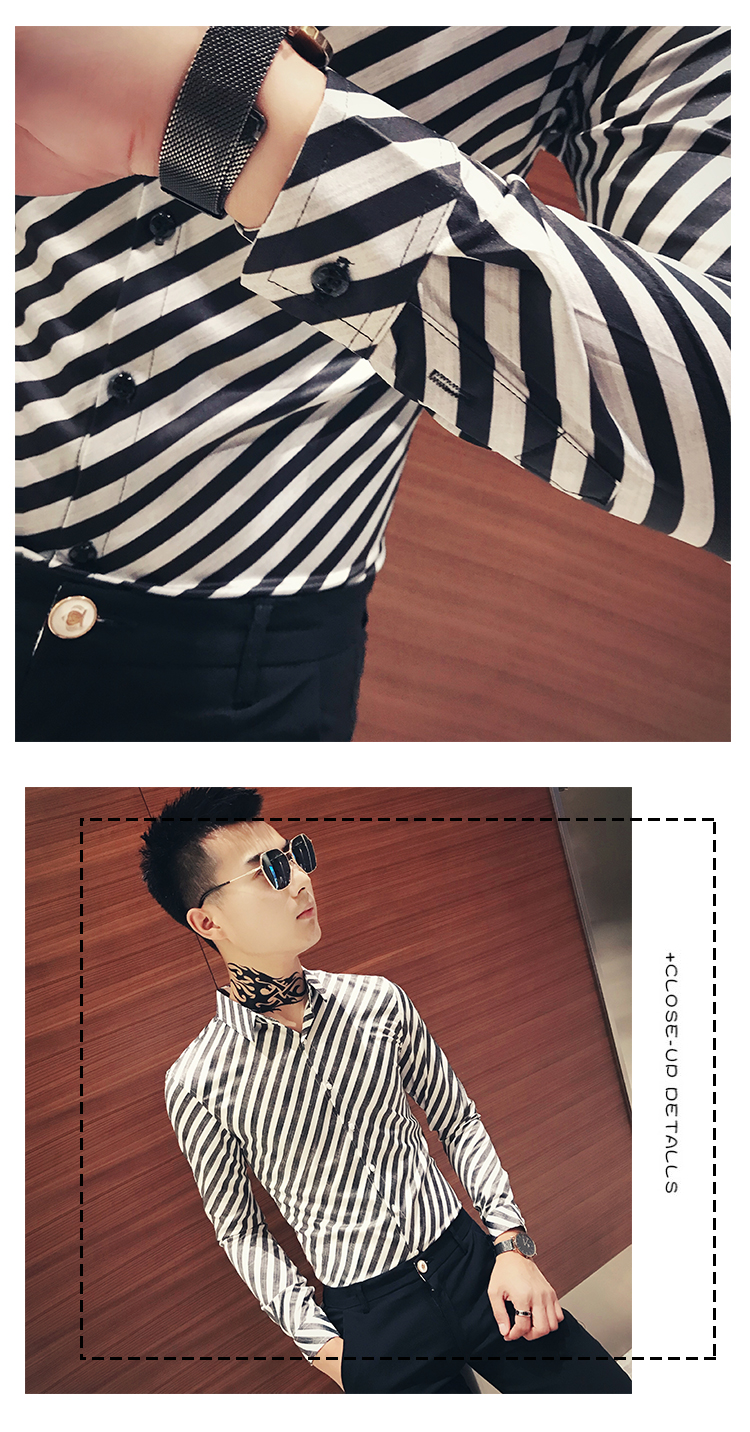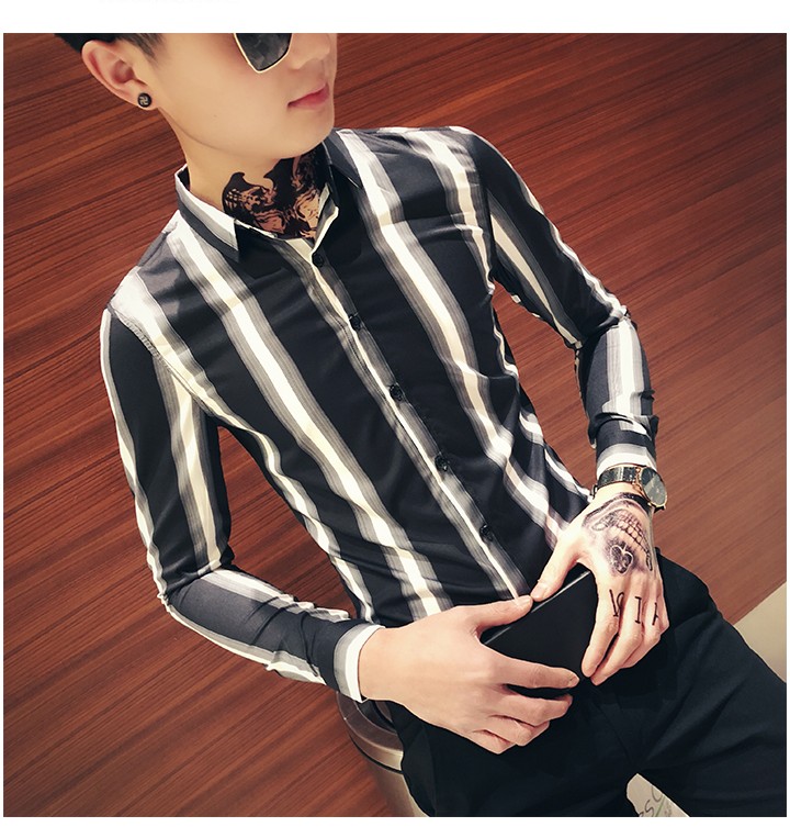 2019秋季修身條紋襯衣社會精神小伙長袖網紅韓版襯衫發型師男裝潮1入
