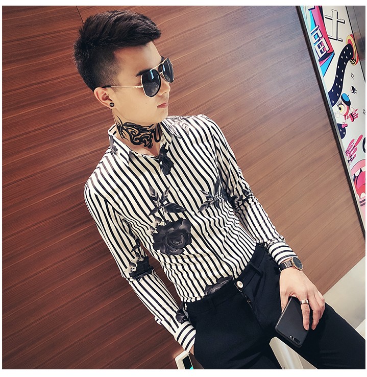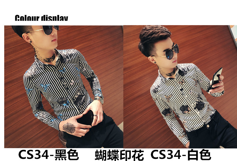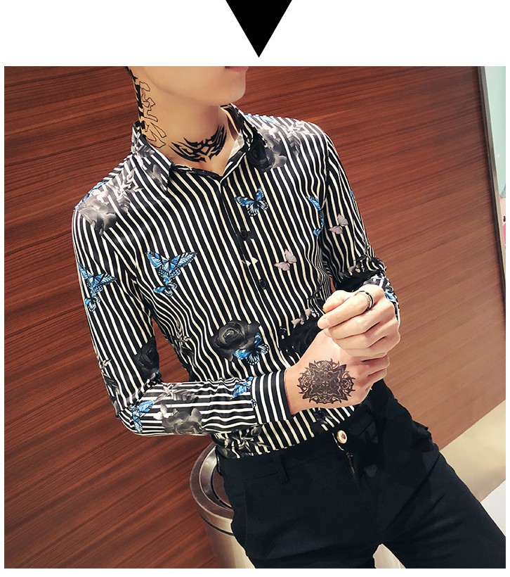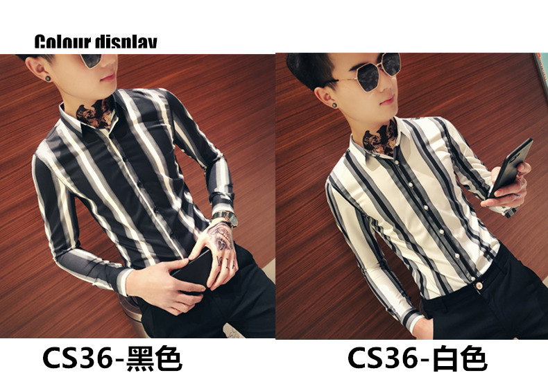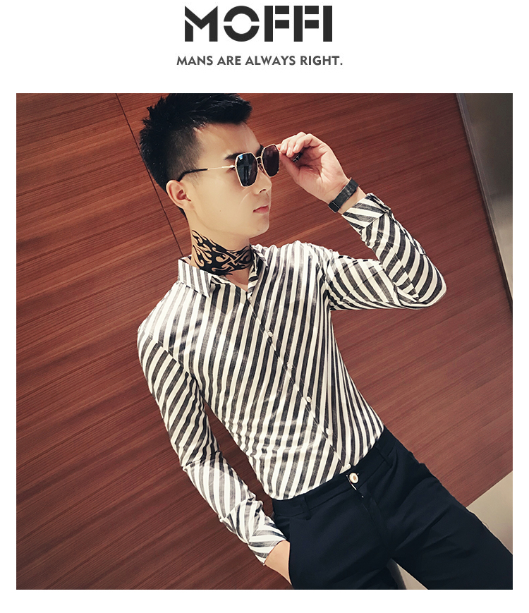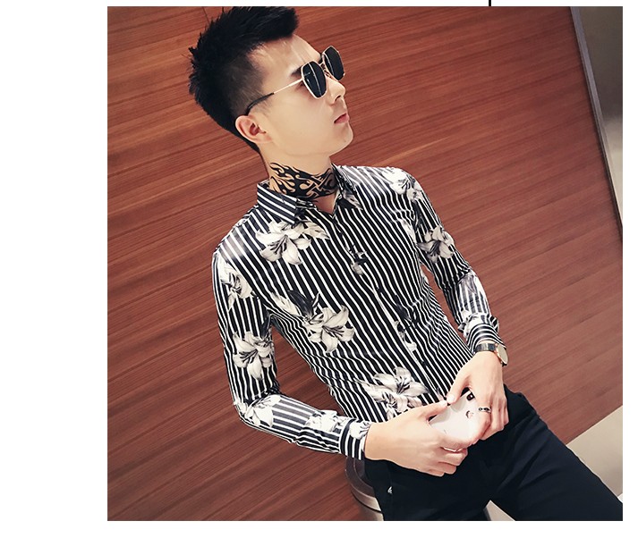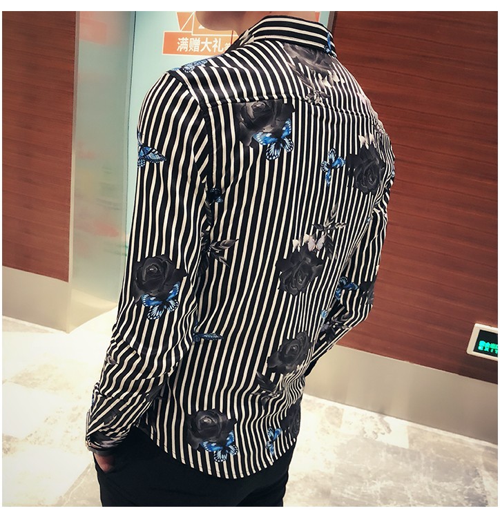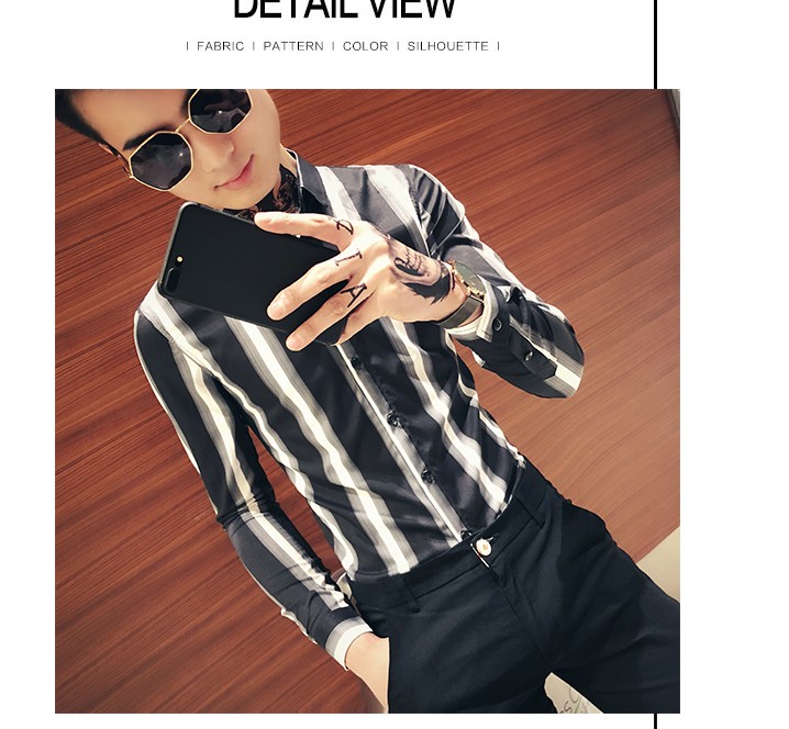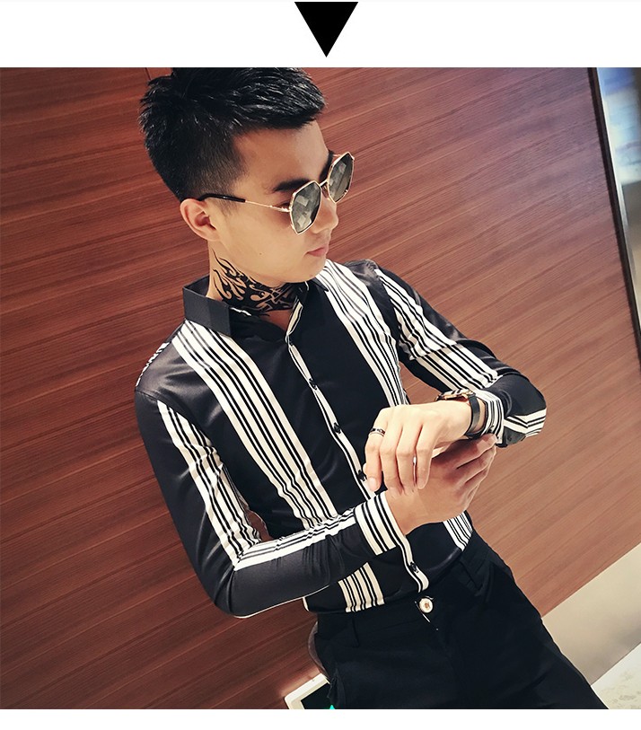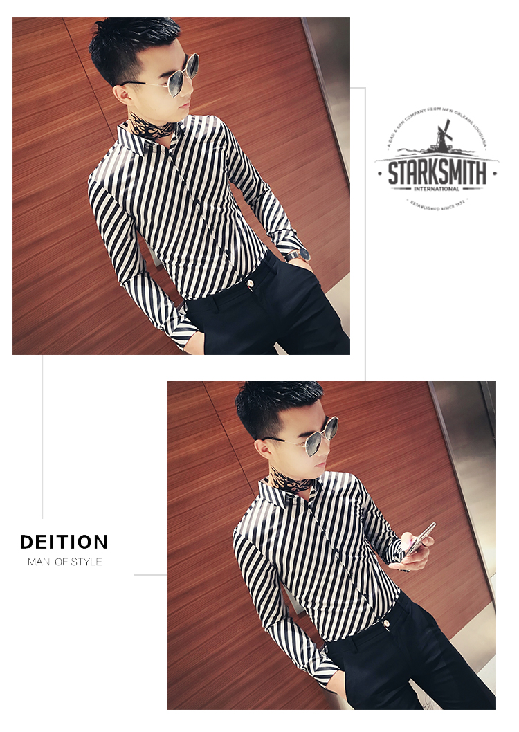2019秋季修身條紋襯衣社會精神小伙長袖網紅韓版襯衫發型師男裝潮1入