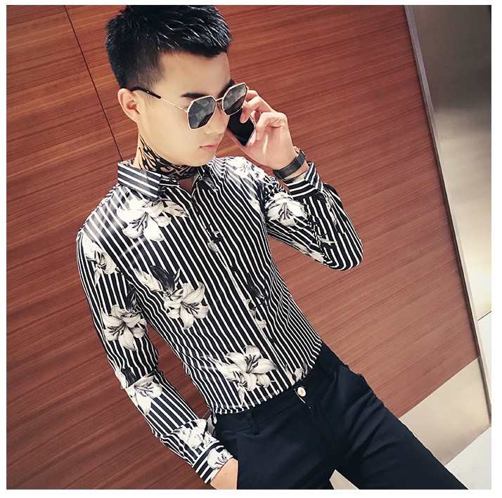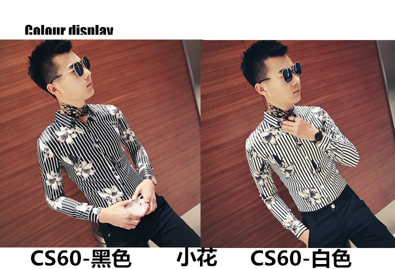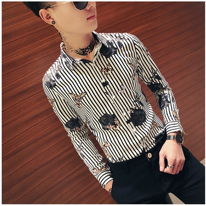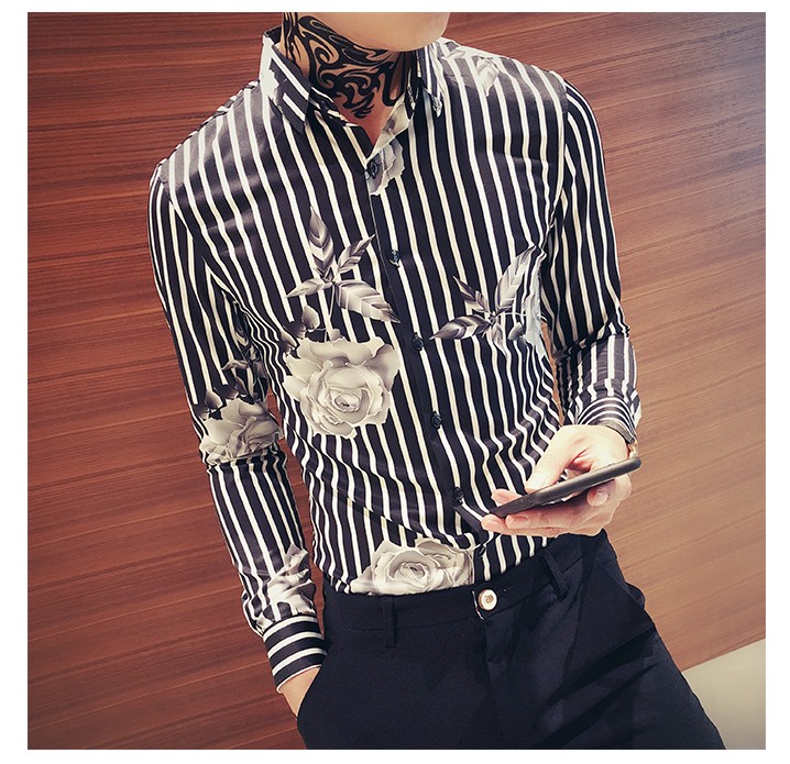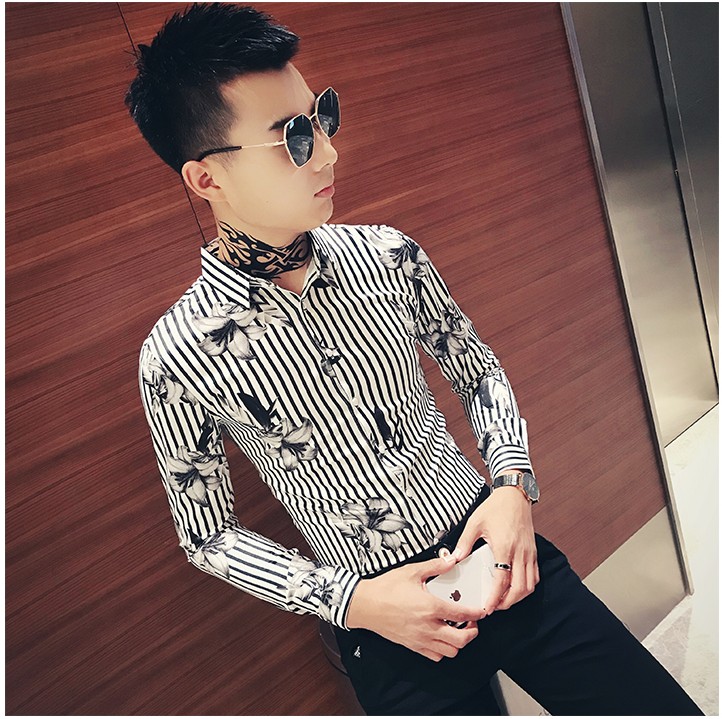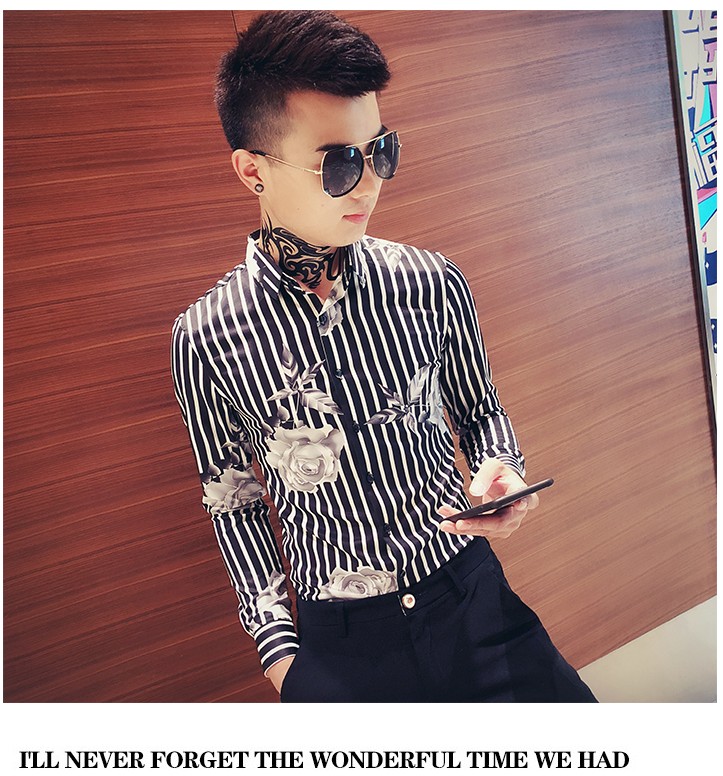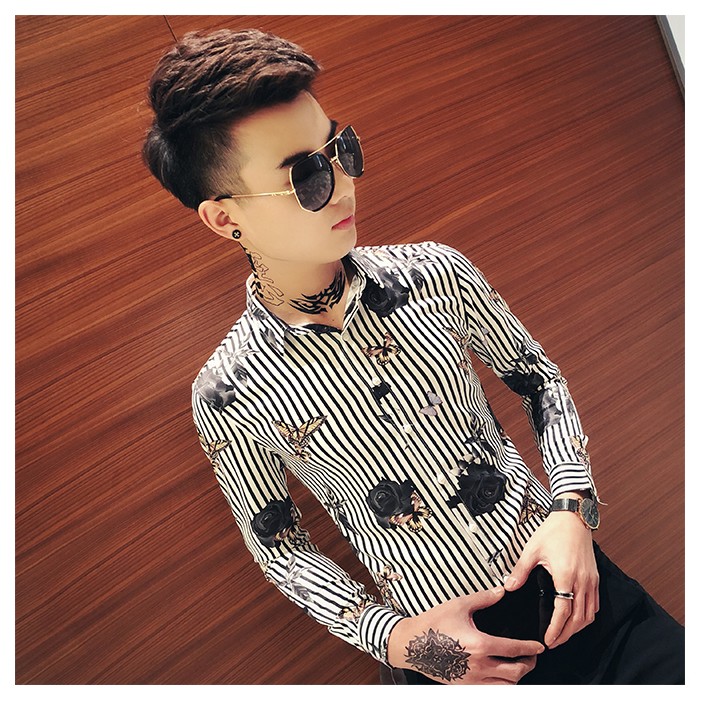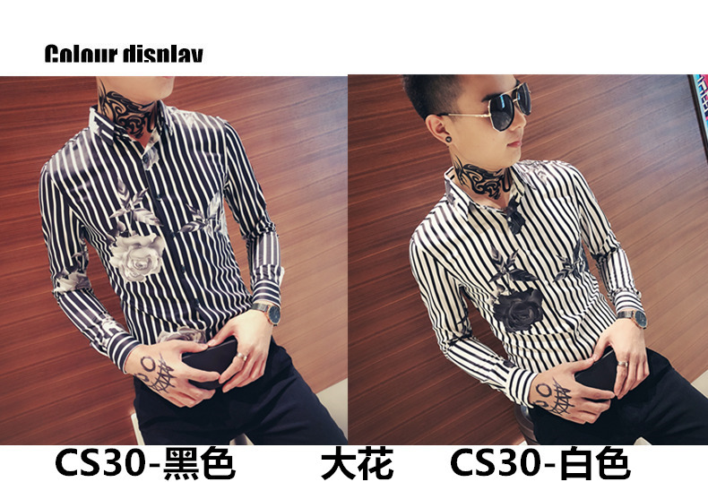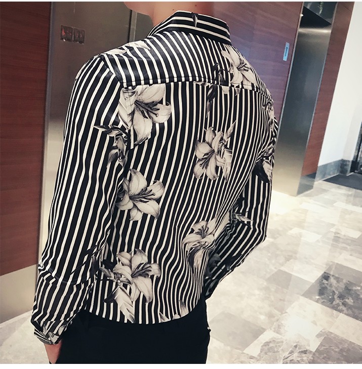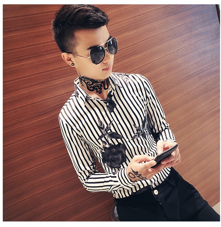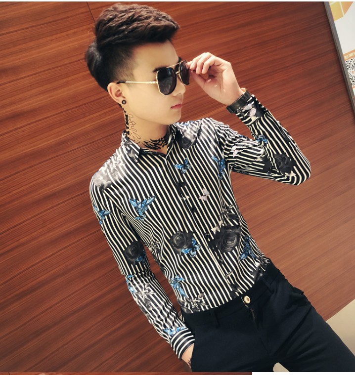 2019秋季修身條紋襯衣社會精神小伙長袖網紅韓版襯衫發型師男裝潮1入