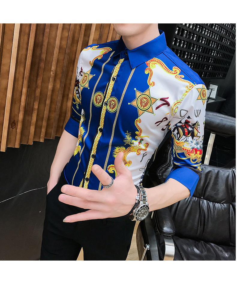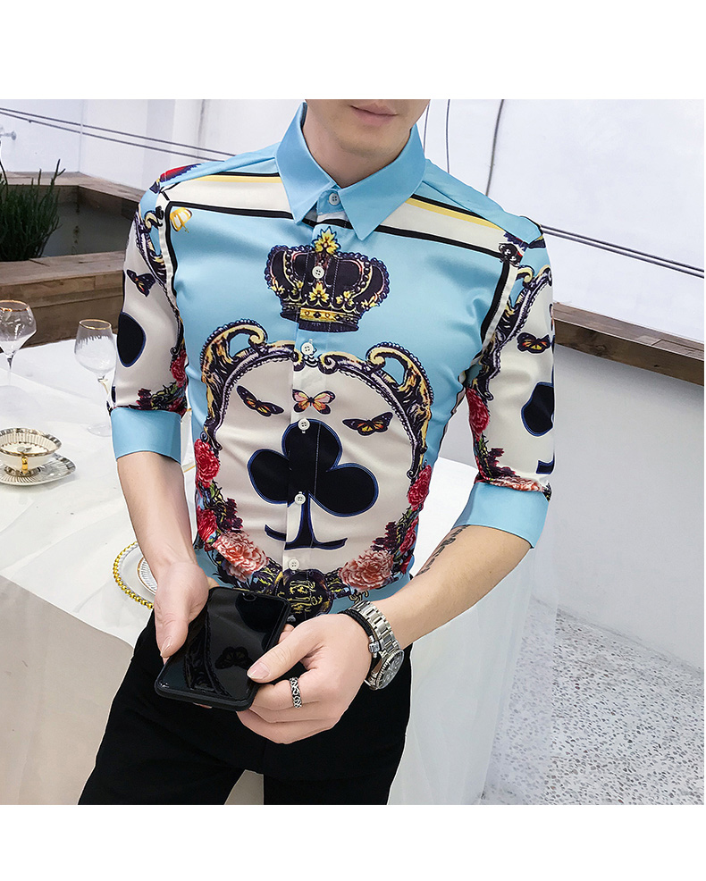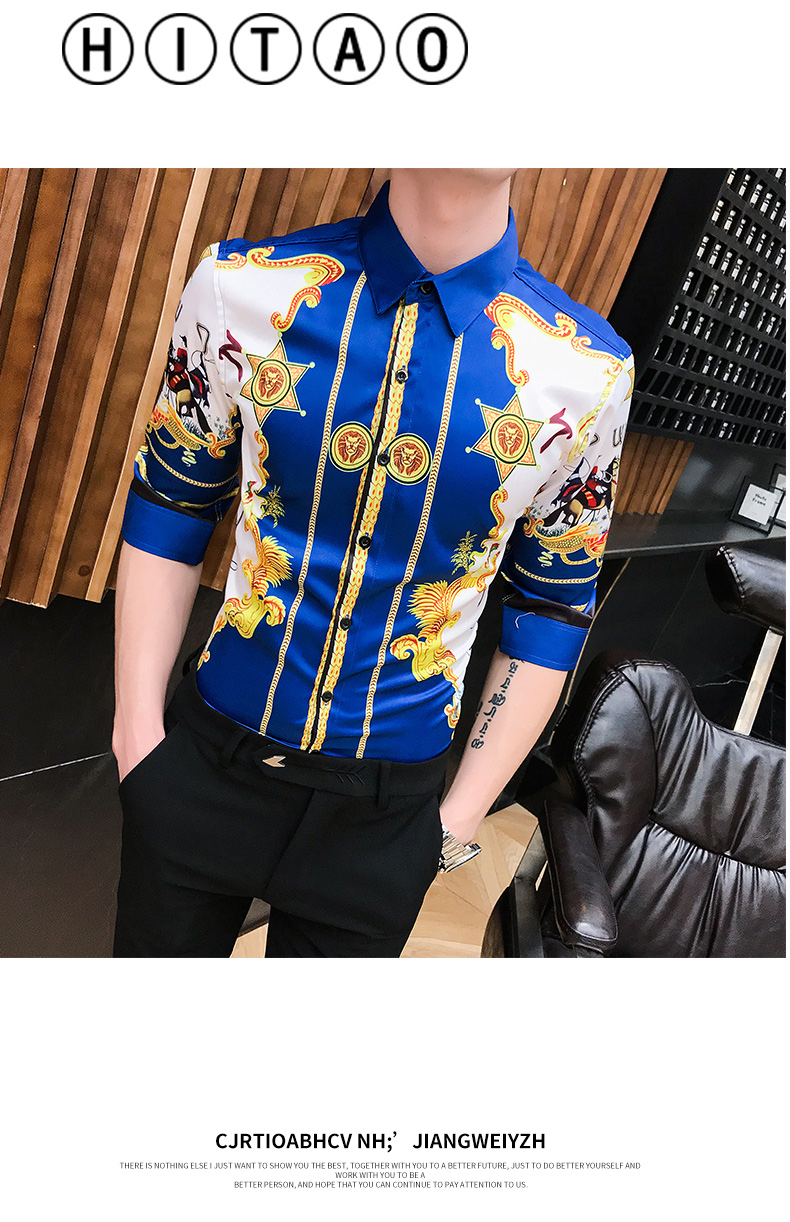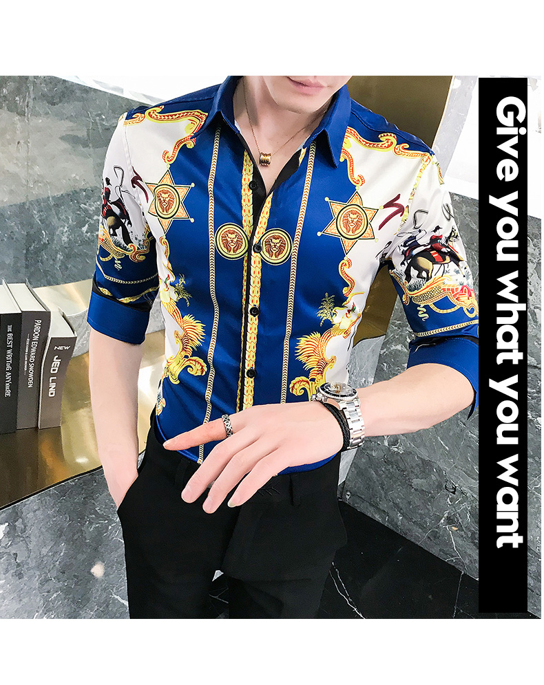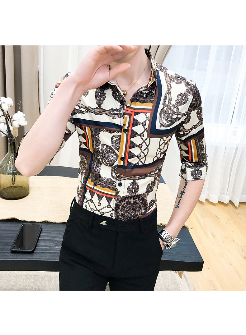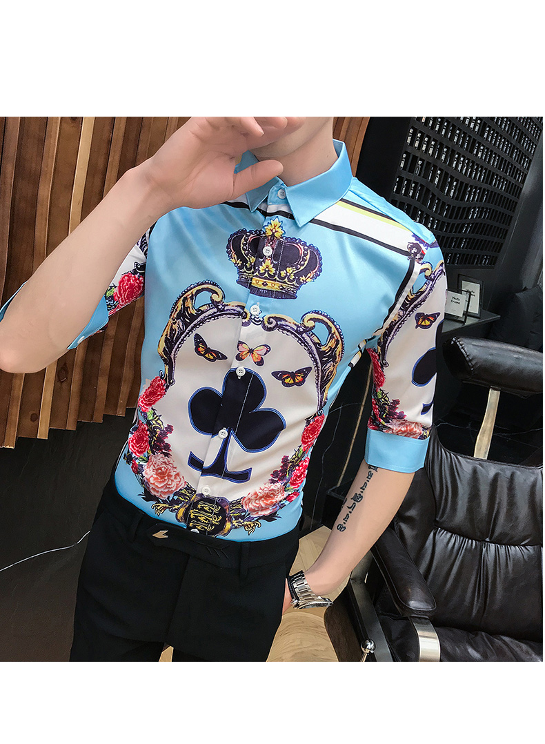 2019夏季七分袖襯衫發型師修身短袖印花襯衣男網紅韓版個性中袖潮1入