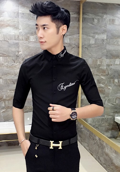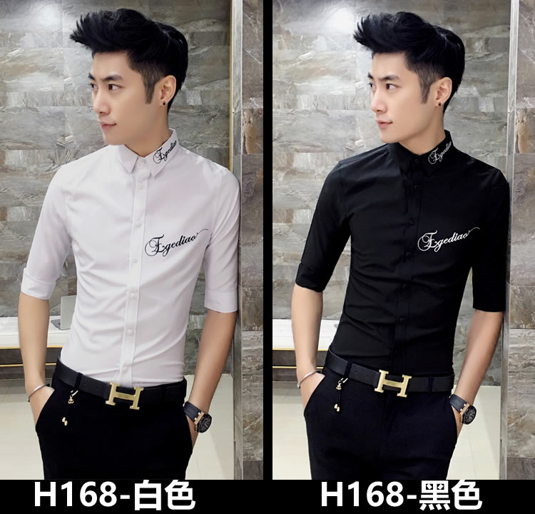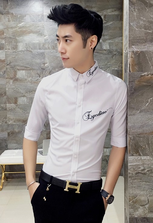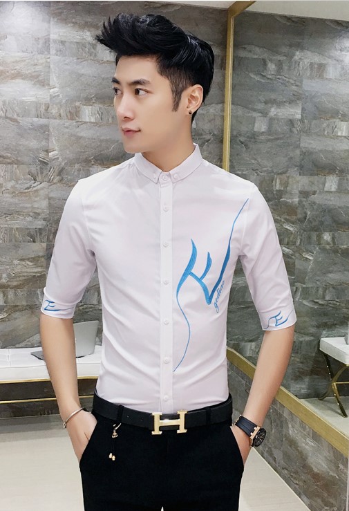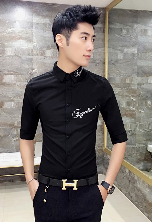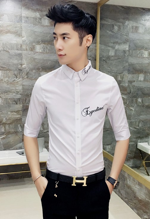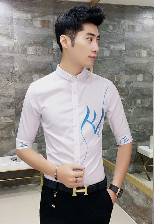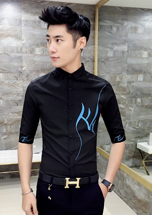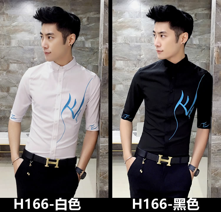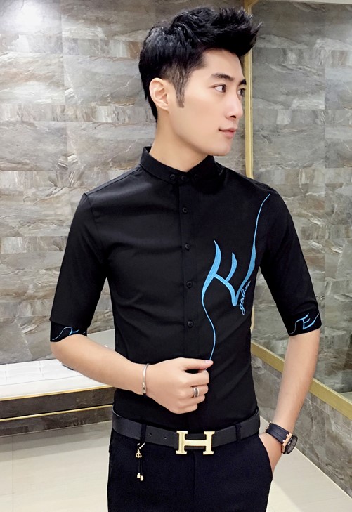 2017夏季韓版七分袖襯衫男修身短袖襯衣青年發型師中袖印花襯衫潮1入