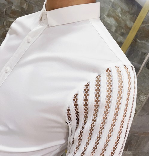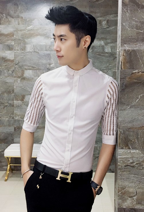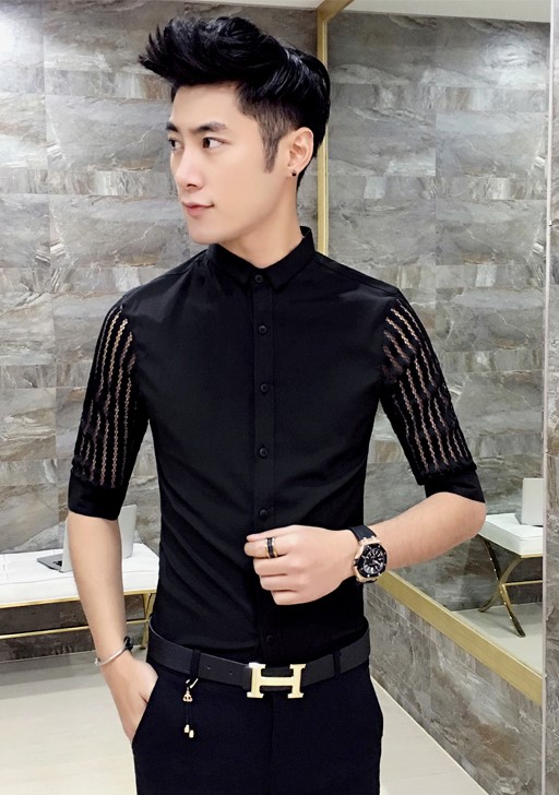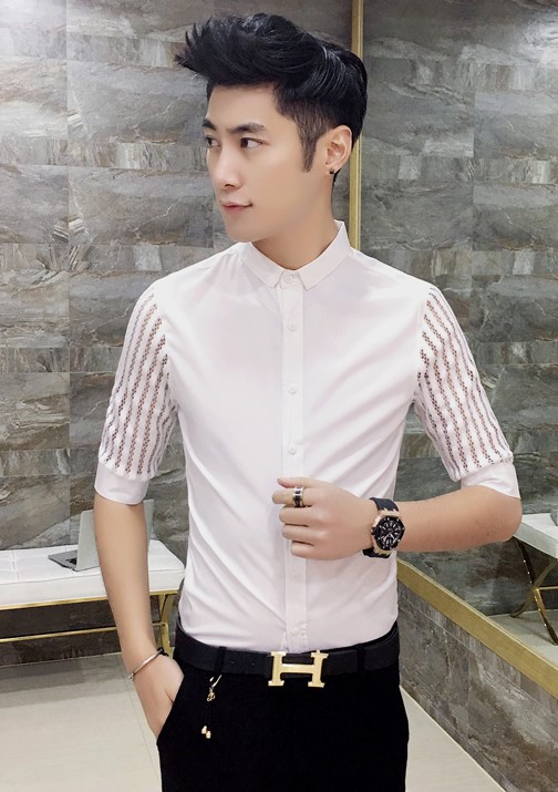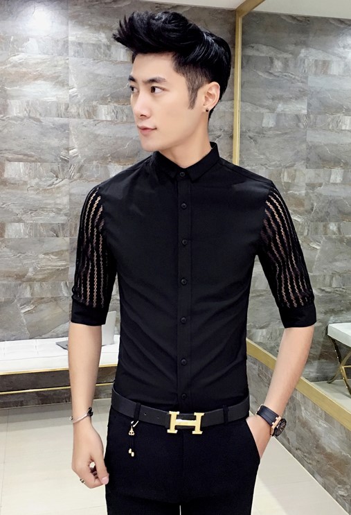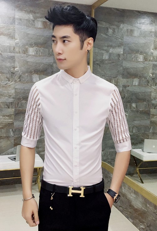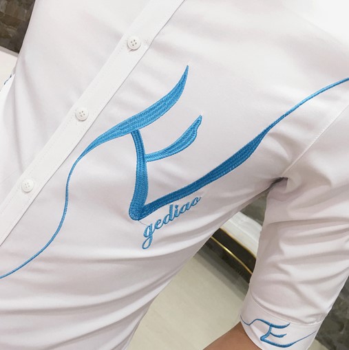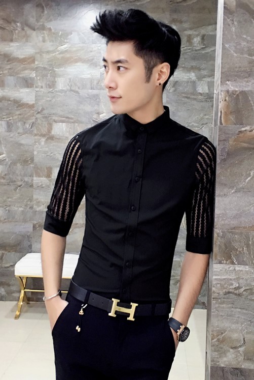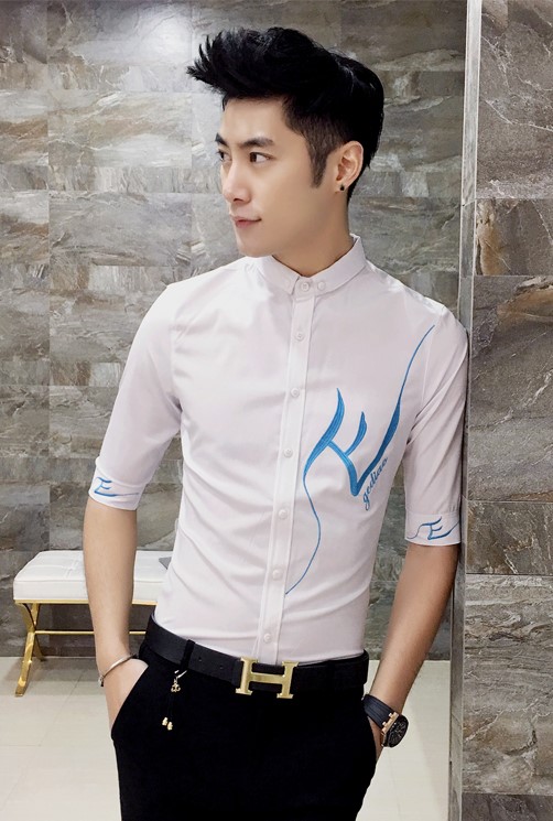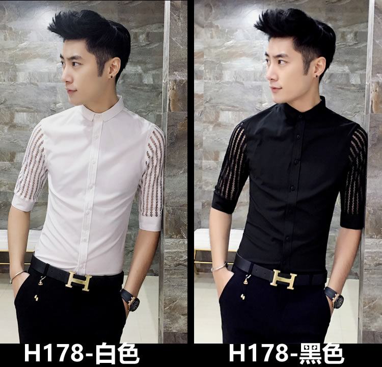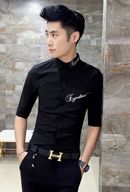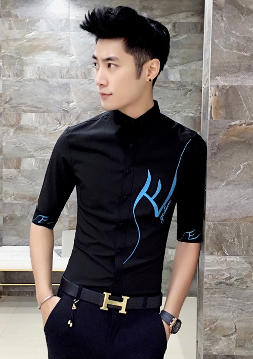 2017夏季韓版七分袖襯衫男修身短袖襯衣青年發型師中袖印花襯衫潮1入