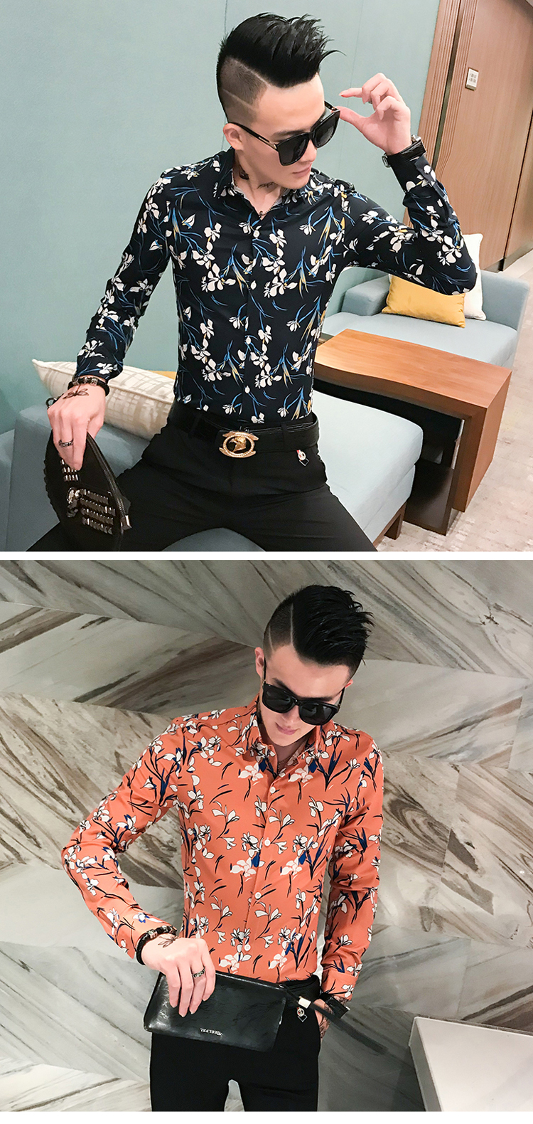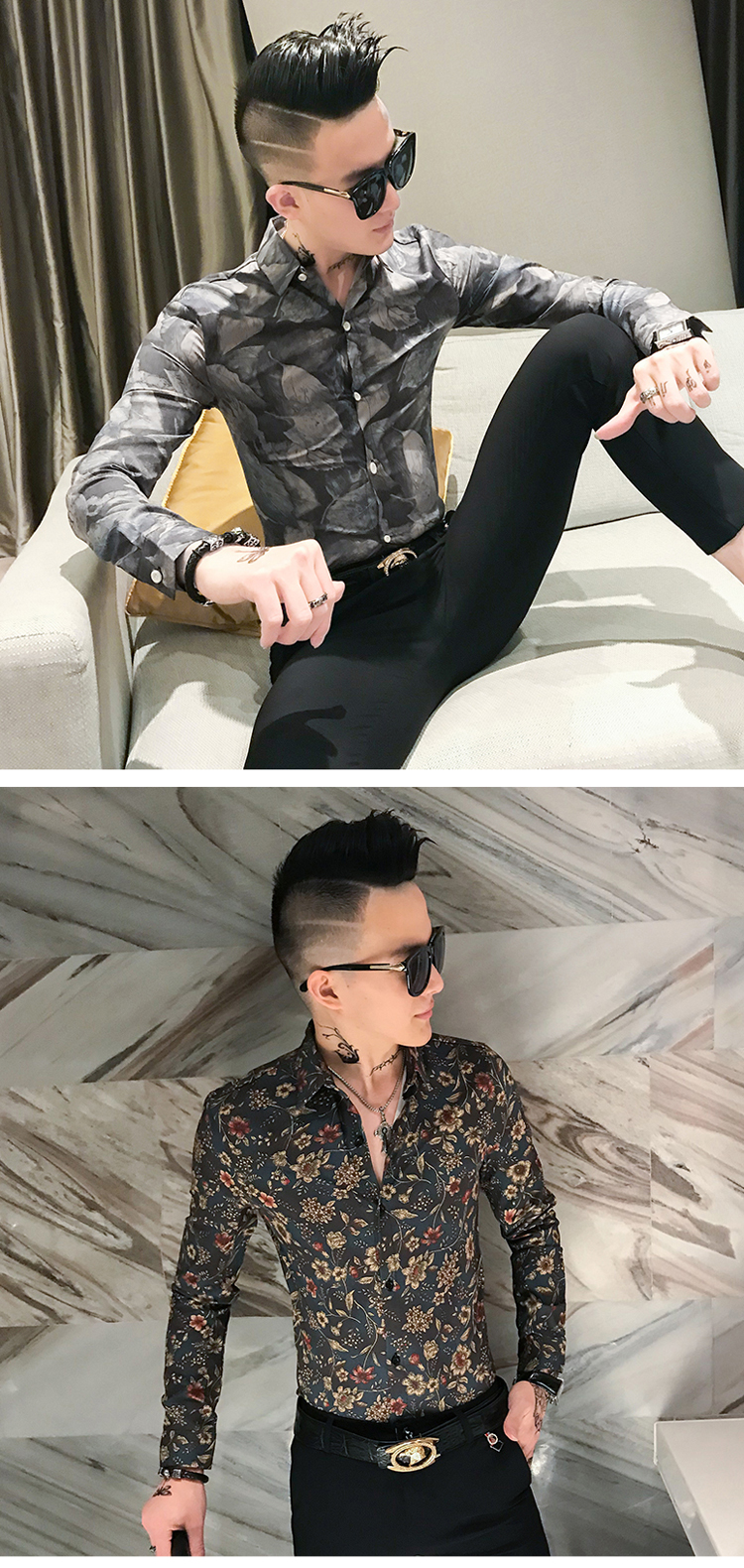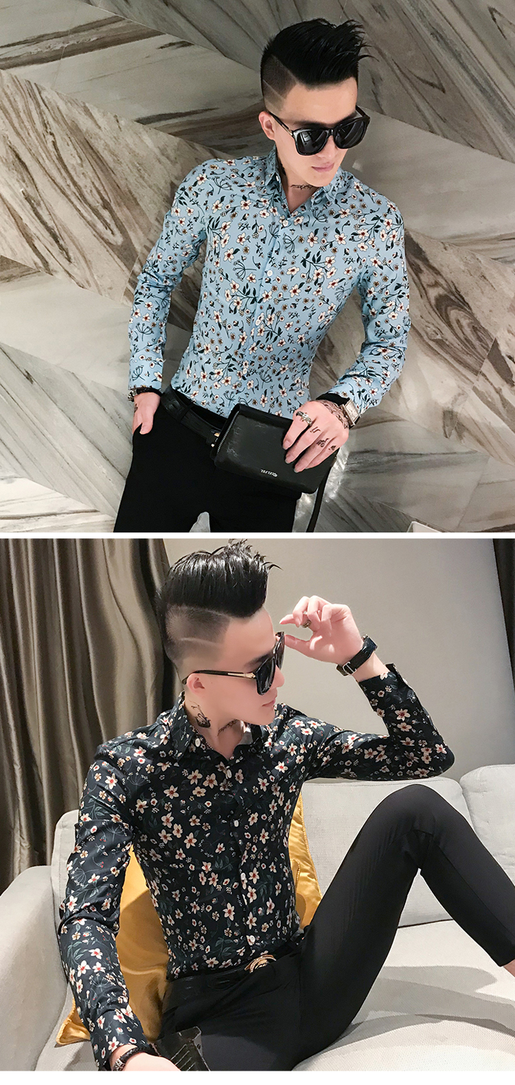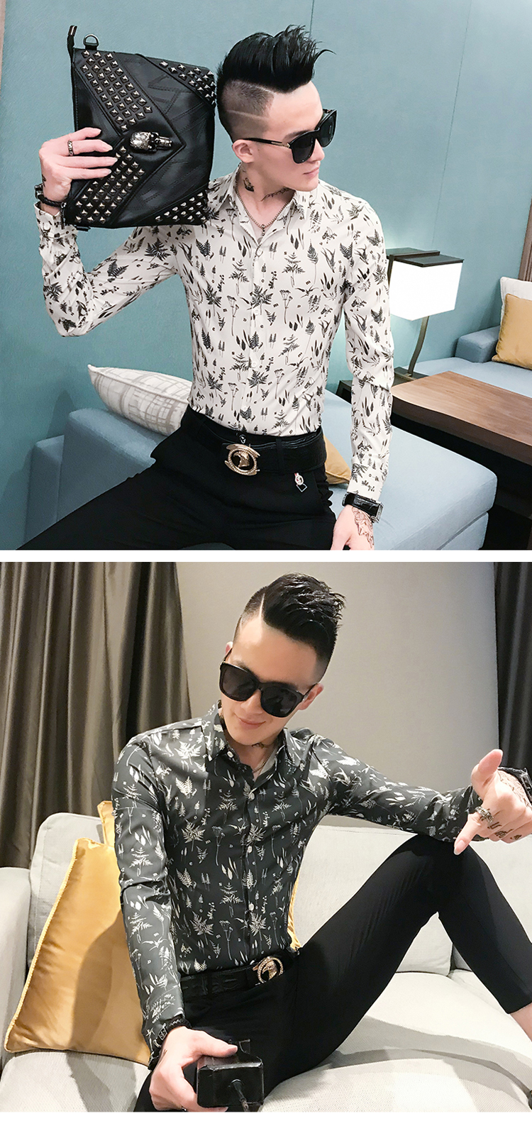 2019秋裝男士休閑碎花襯衣發型師韓版長袖襯衫網紅修身印花襯衫潮1入