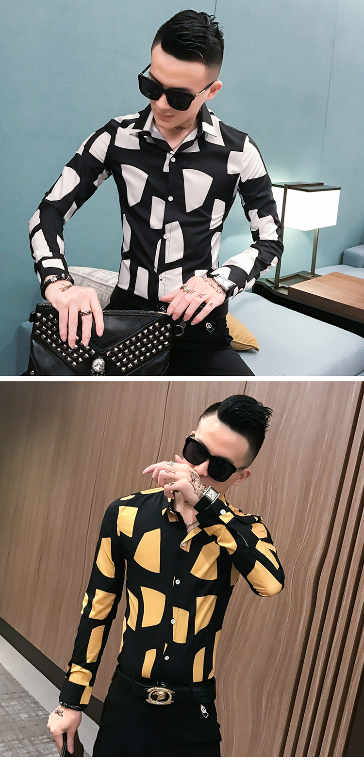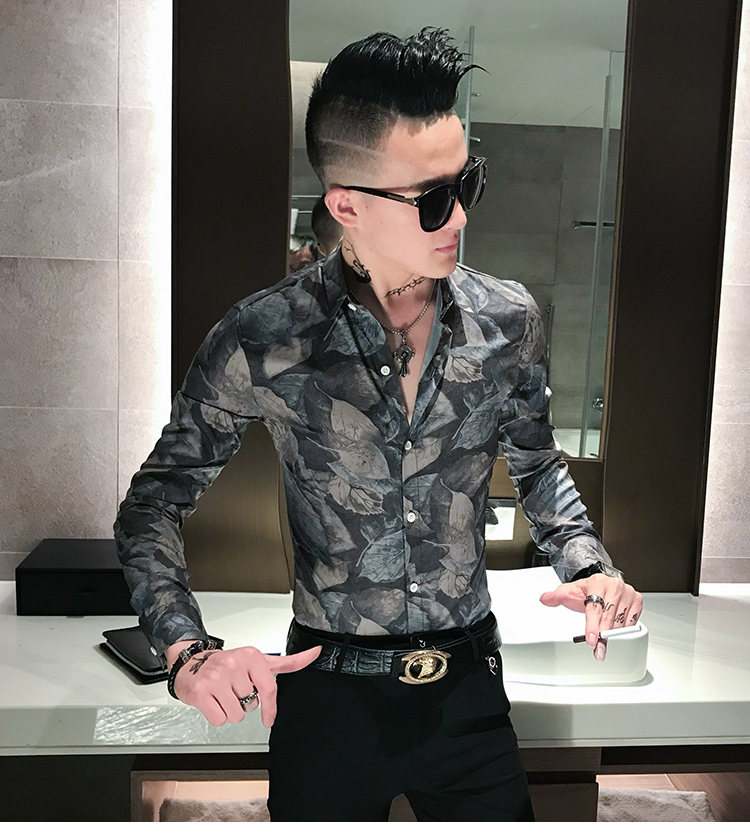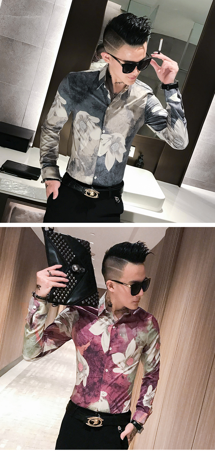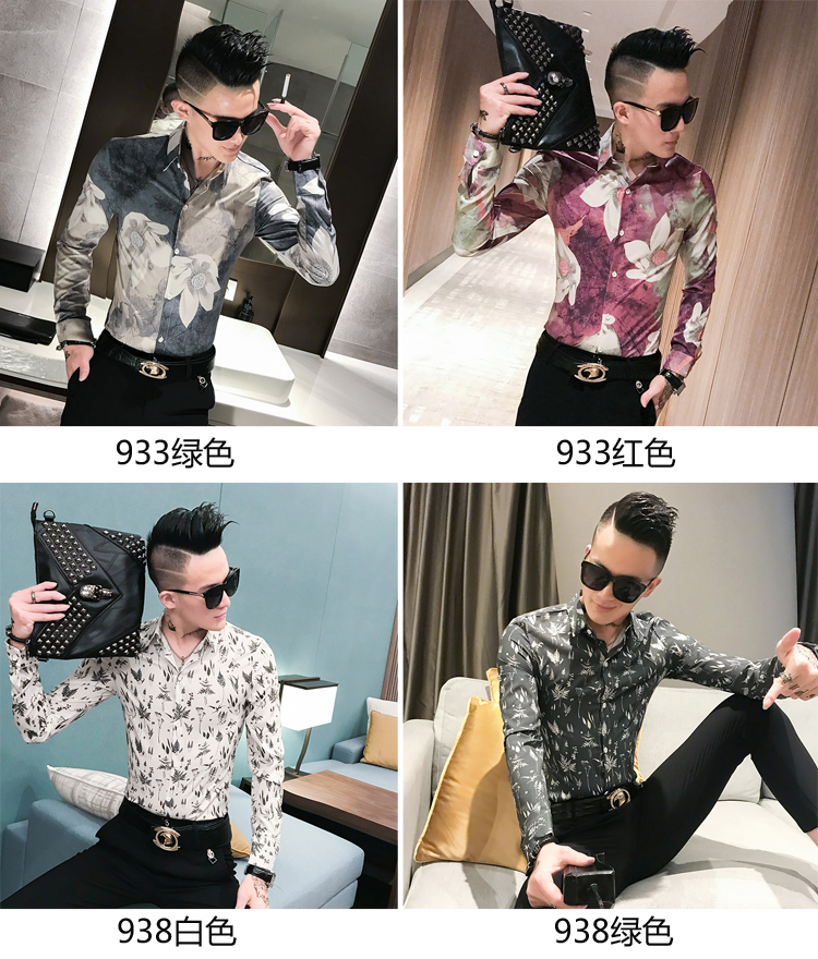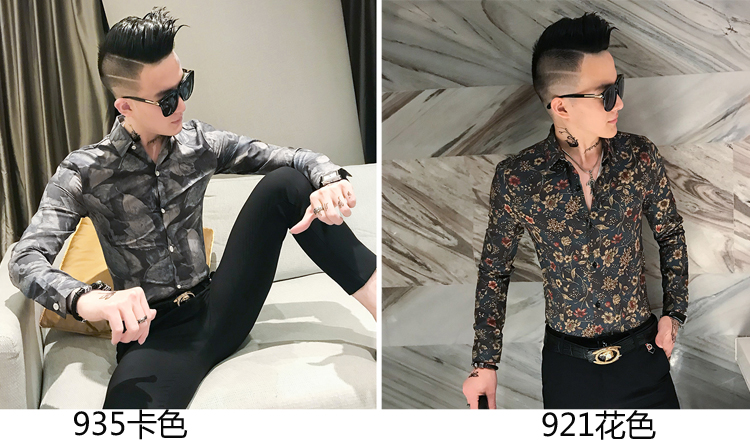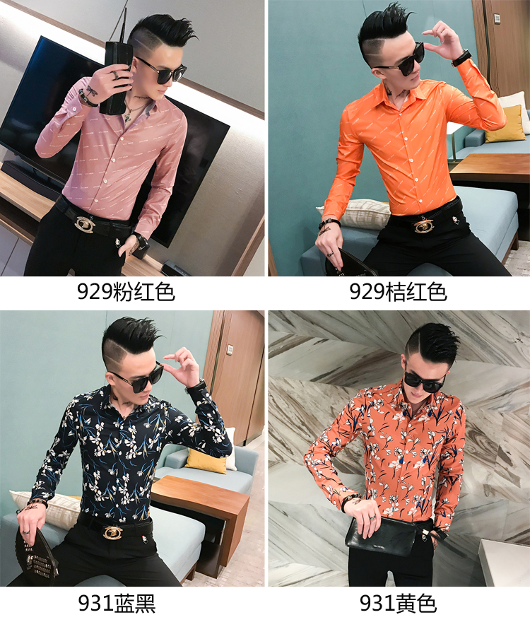 2019秋裝男士休閑碎花襯衣發型師韓版長袖襯衫網紅修身印花襯衫潮1入