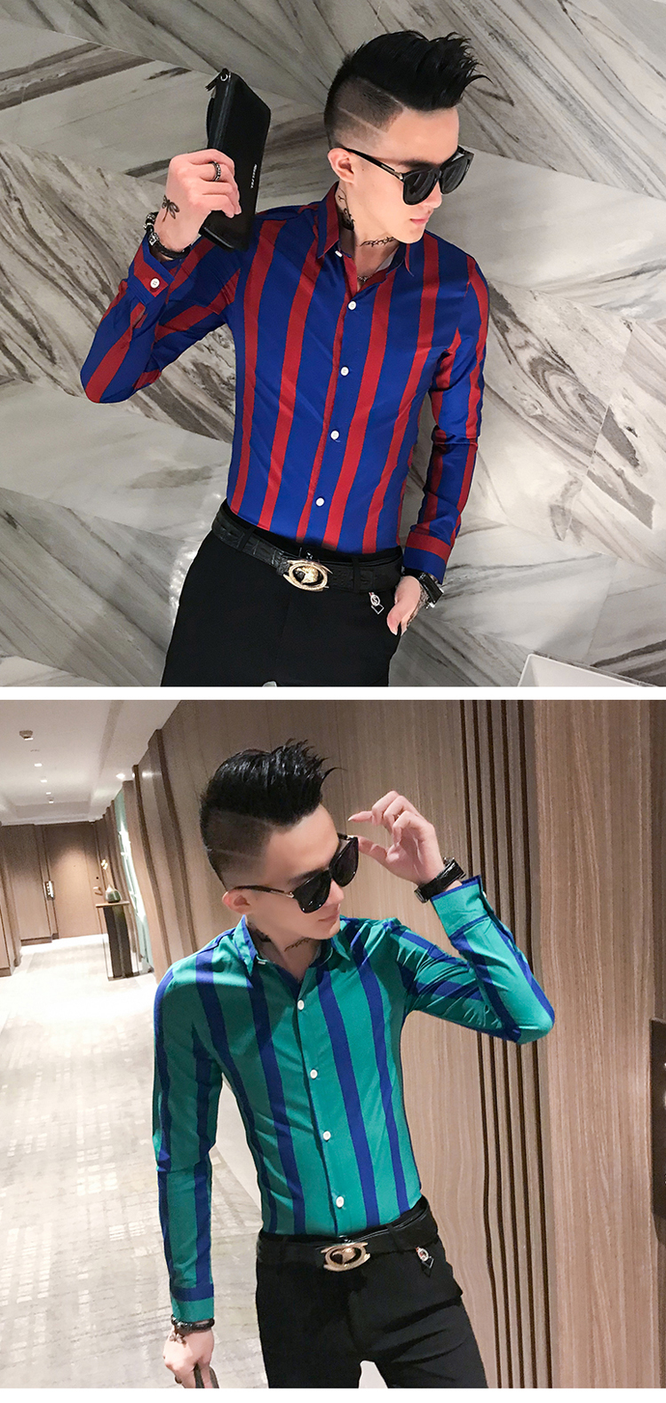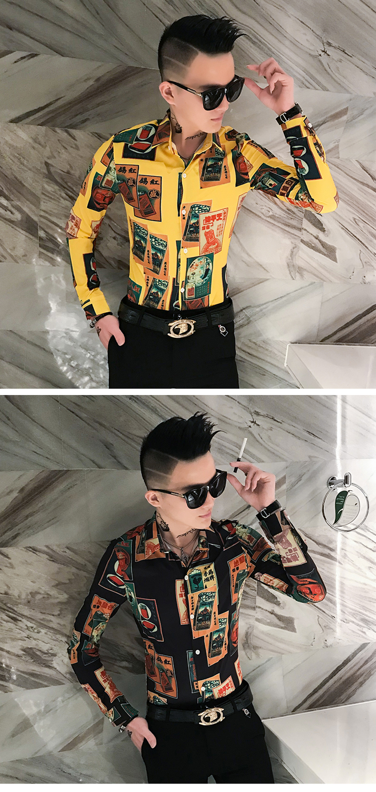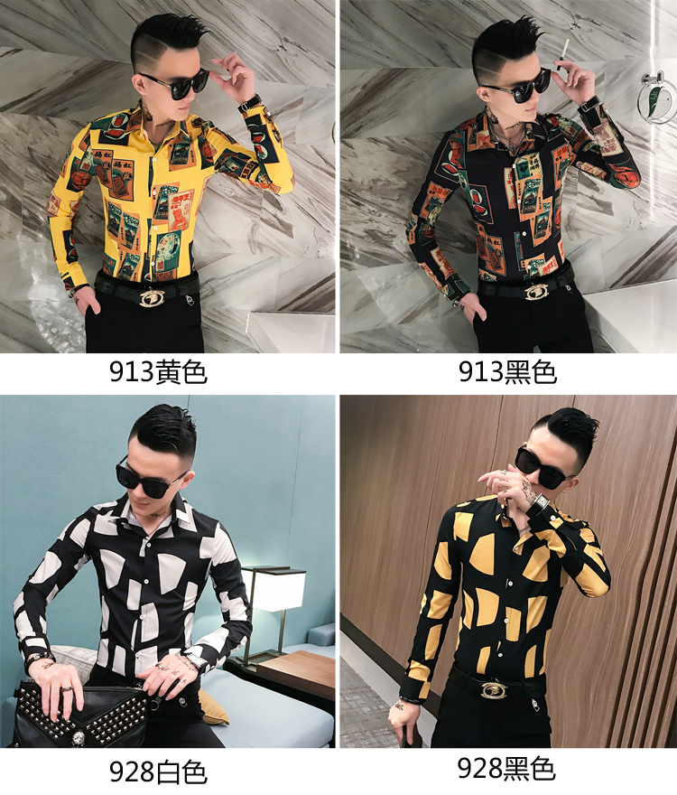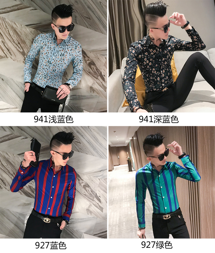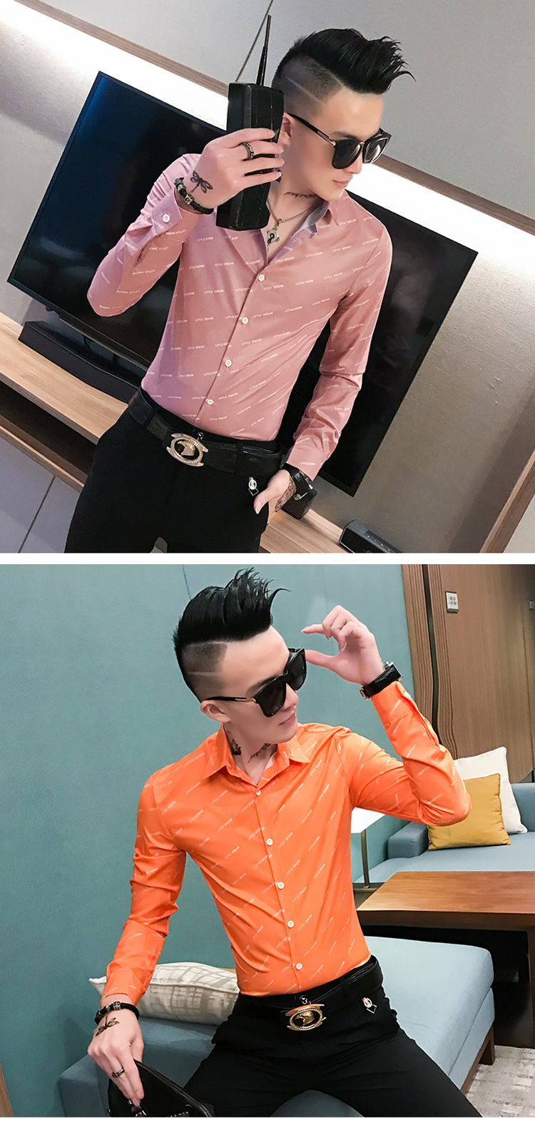 2019秋裝男士休閑碎花襯衣發型師韓版長袖襯衫網紅修身印花襯衫潮1入