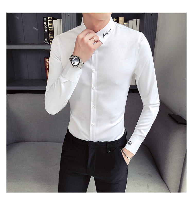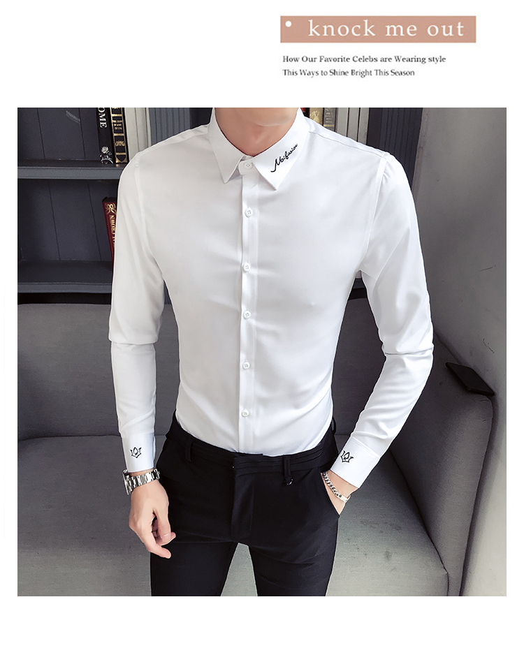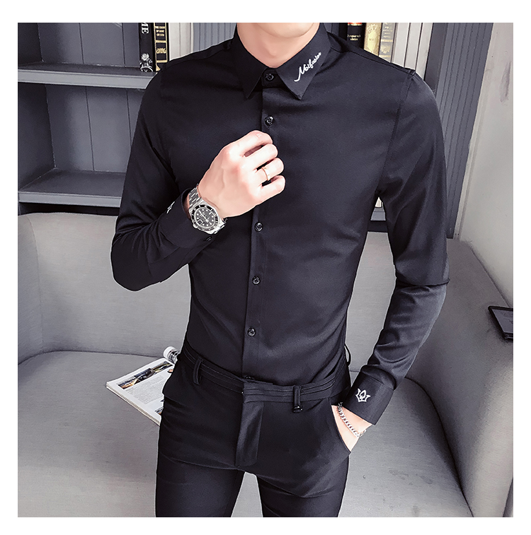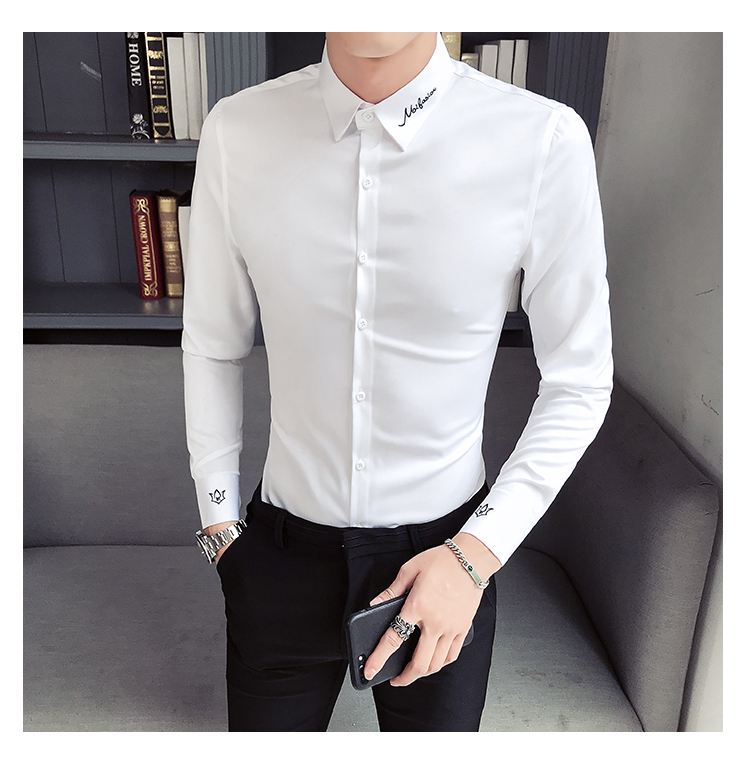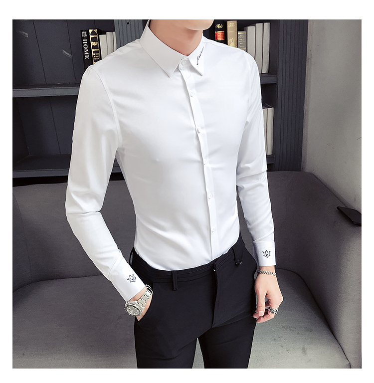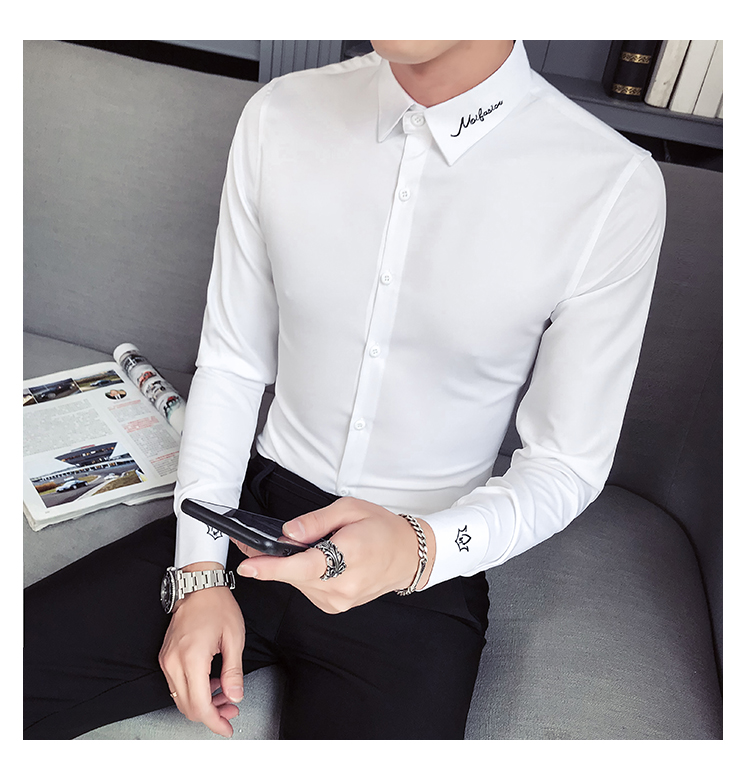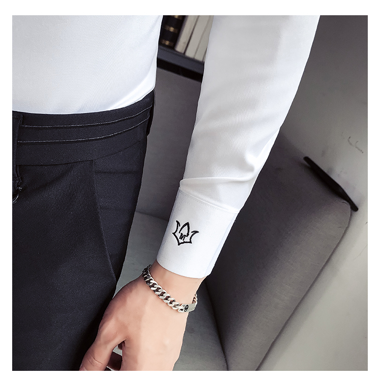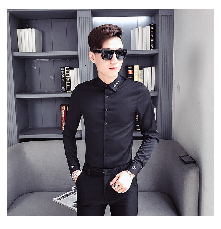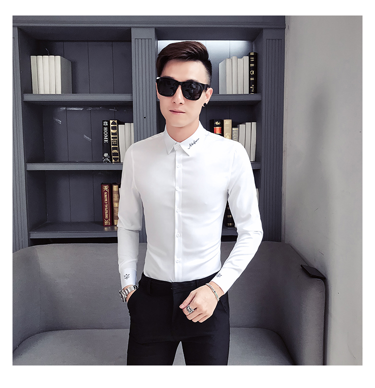 2018秋季休閑長袖襯衫男士修身白襯衣發型師夜店個性刺繡花寸衣男1入