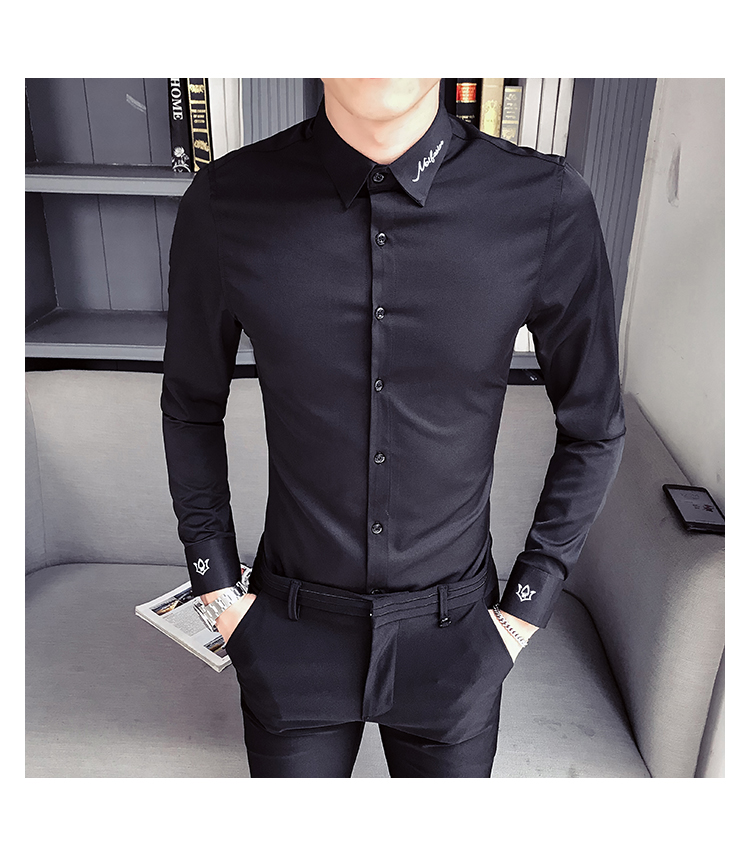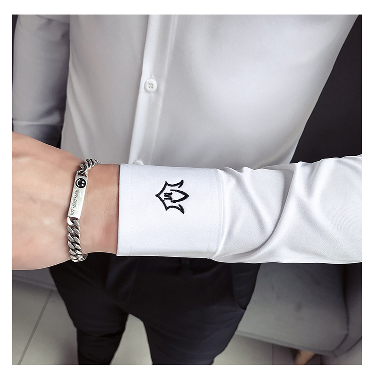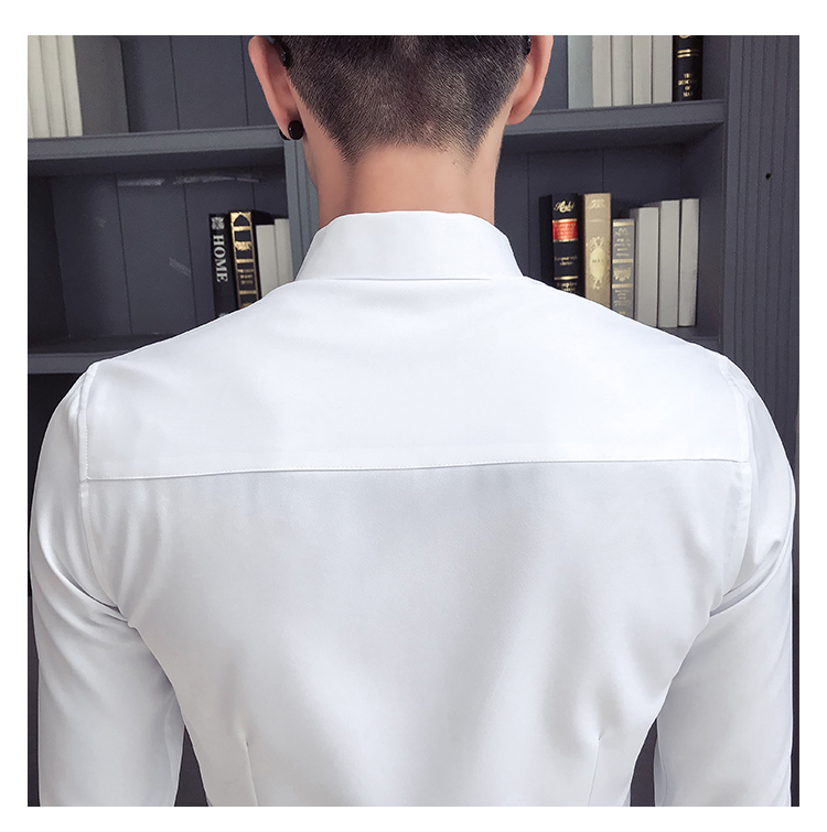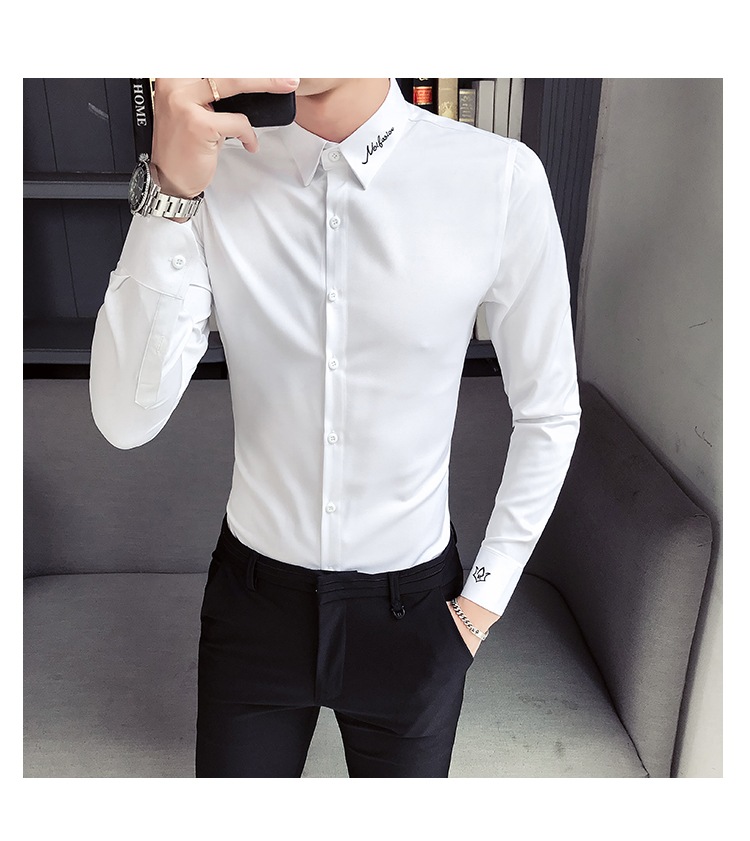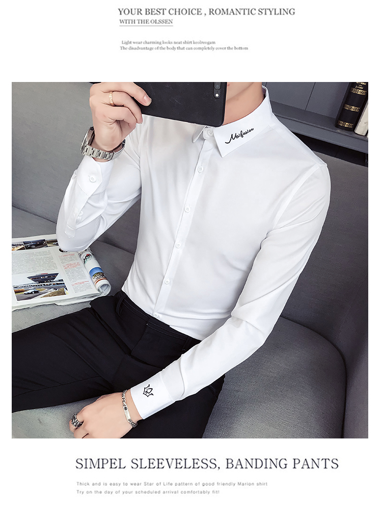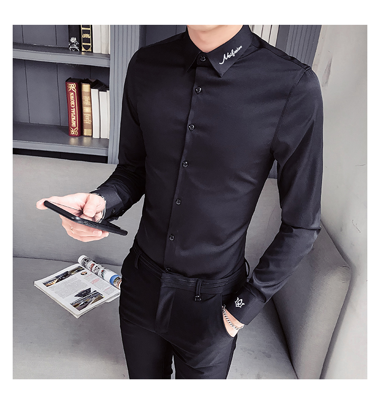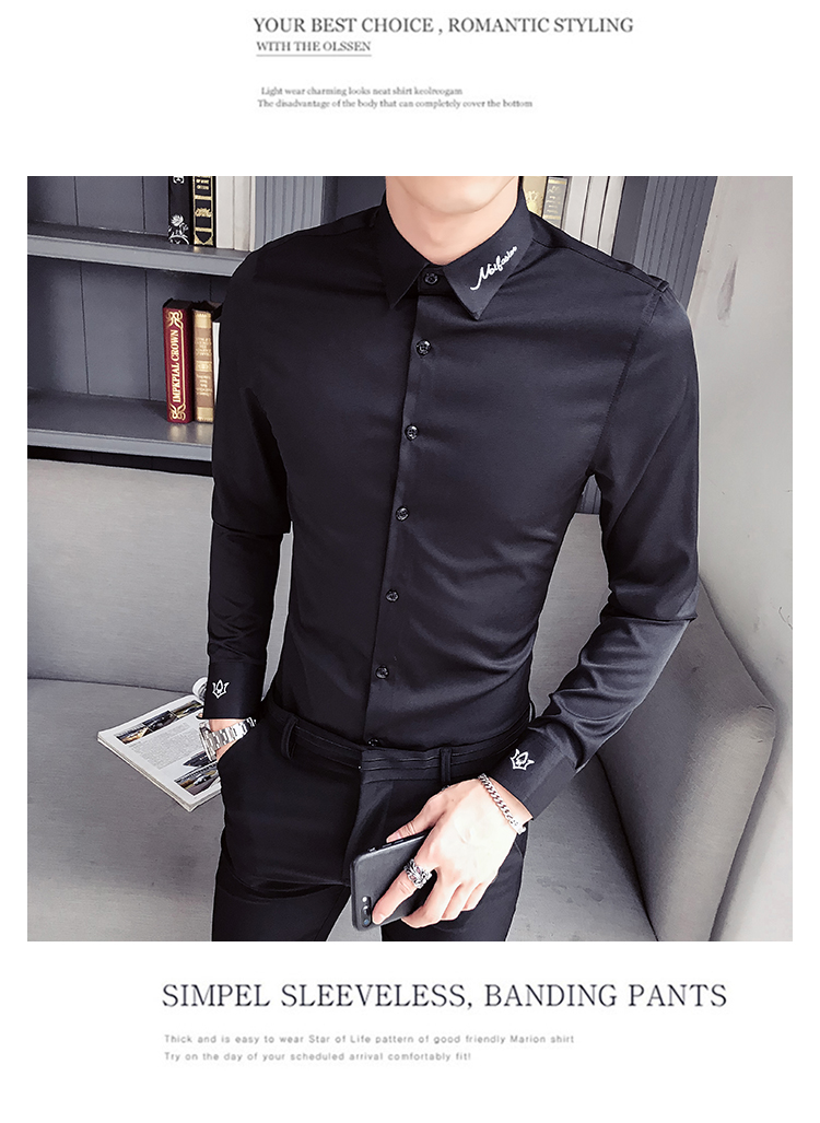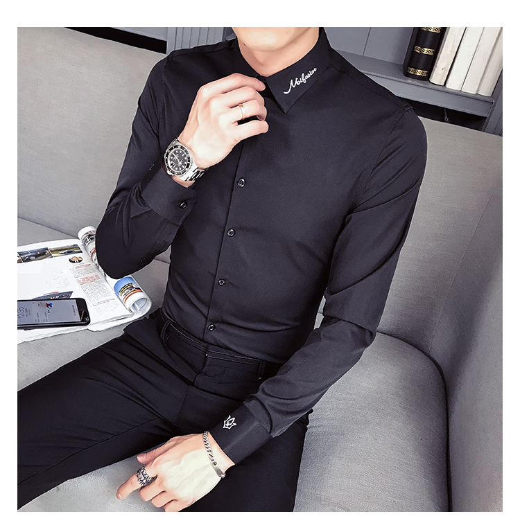 2018秋季休閑長袖襯衫男士修身白襯衣發型師夜店個性刺繡花寸衣男1入