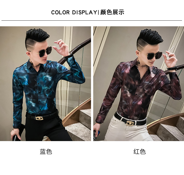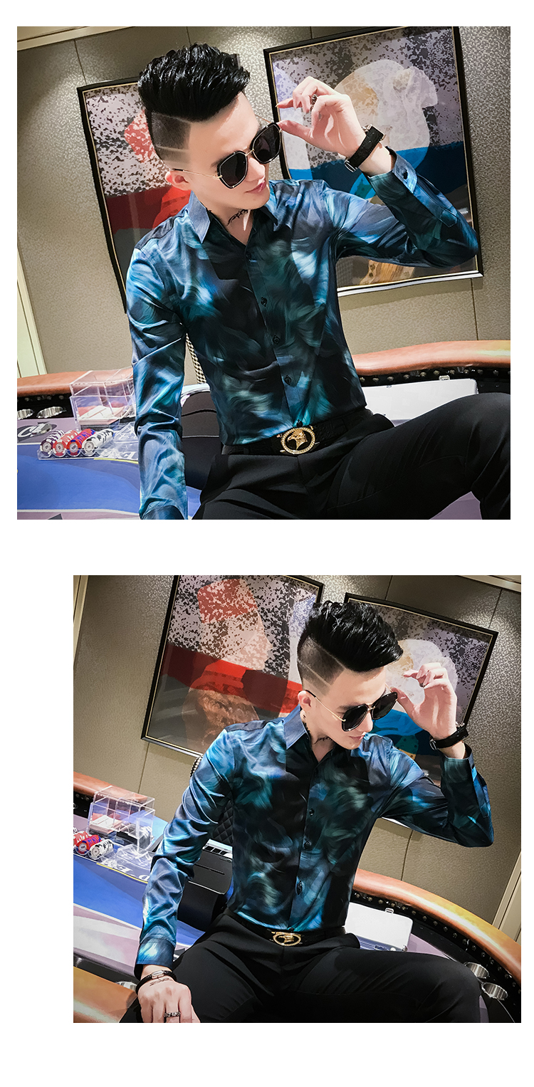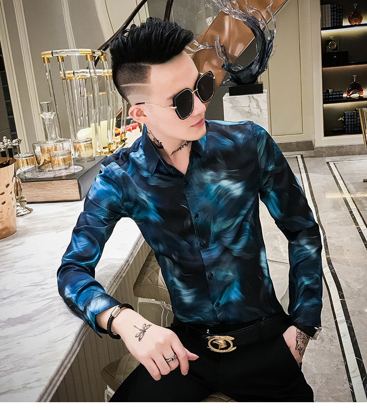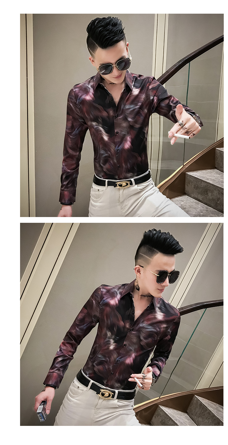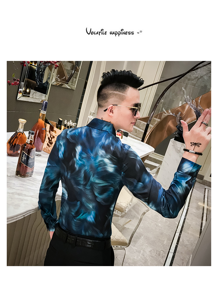 2019發型師男裝花襯衫網紅修身長袖個性襯衣社會人時尚修身襯衫潮1入