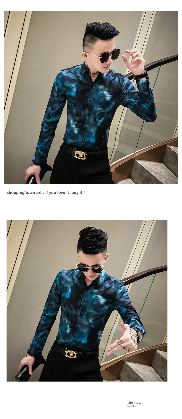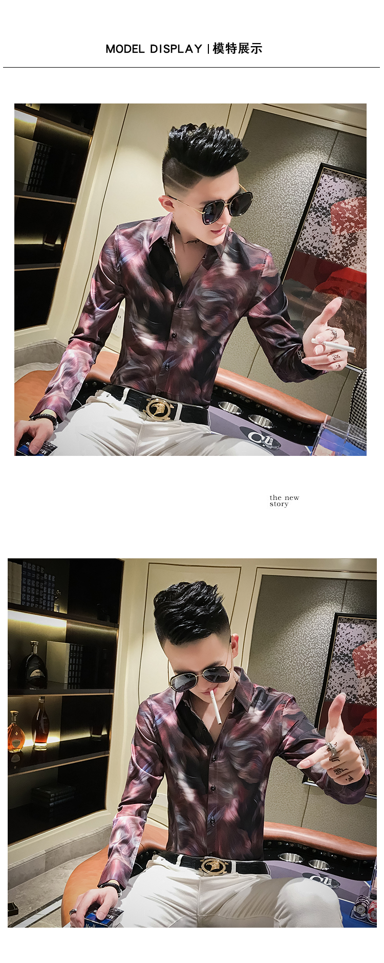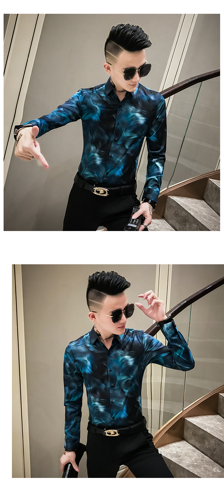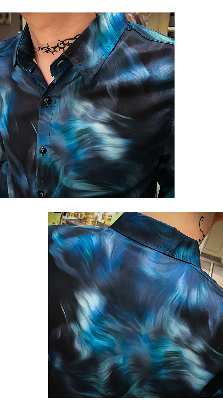 2019發型師男裝花襯衫網紅修身長袖個性襯衣社會人時尚修身襯衫潮1入