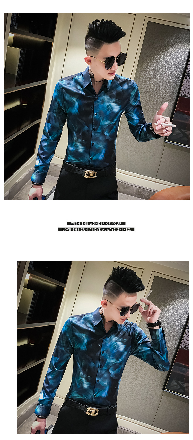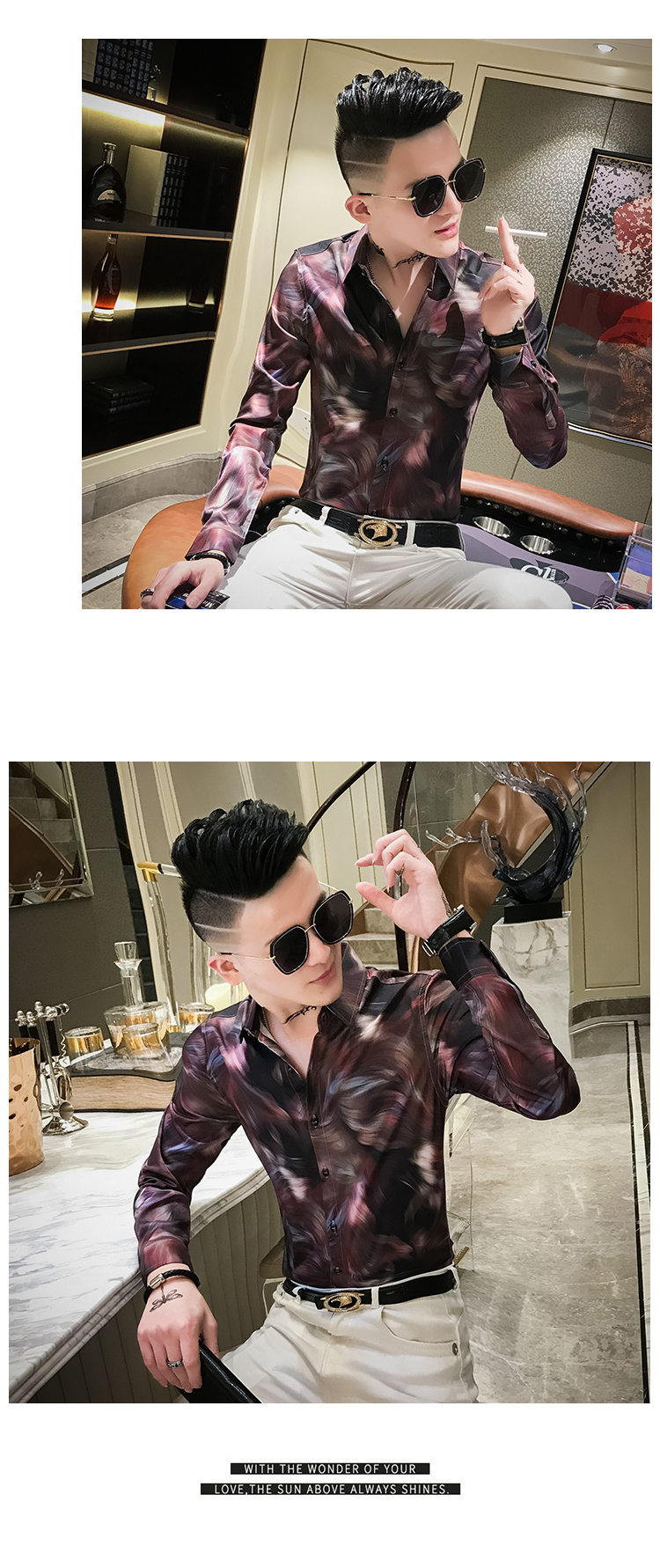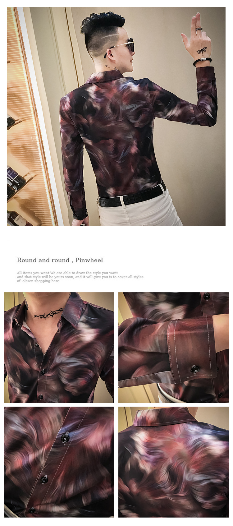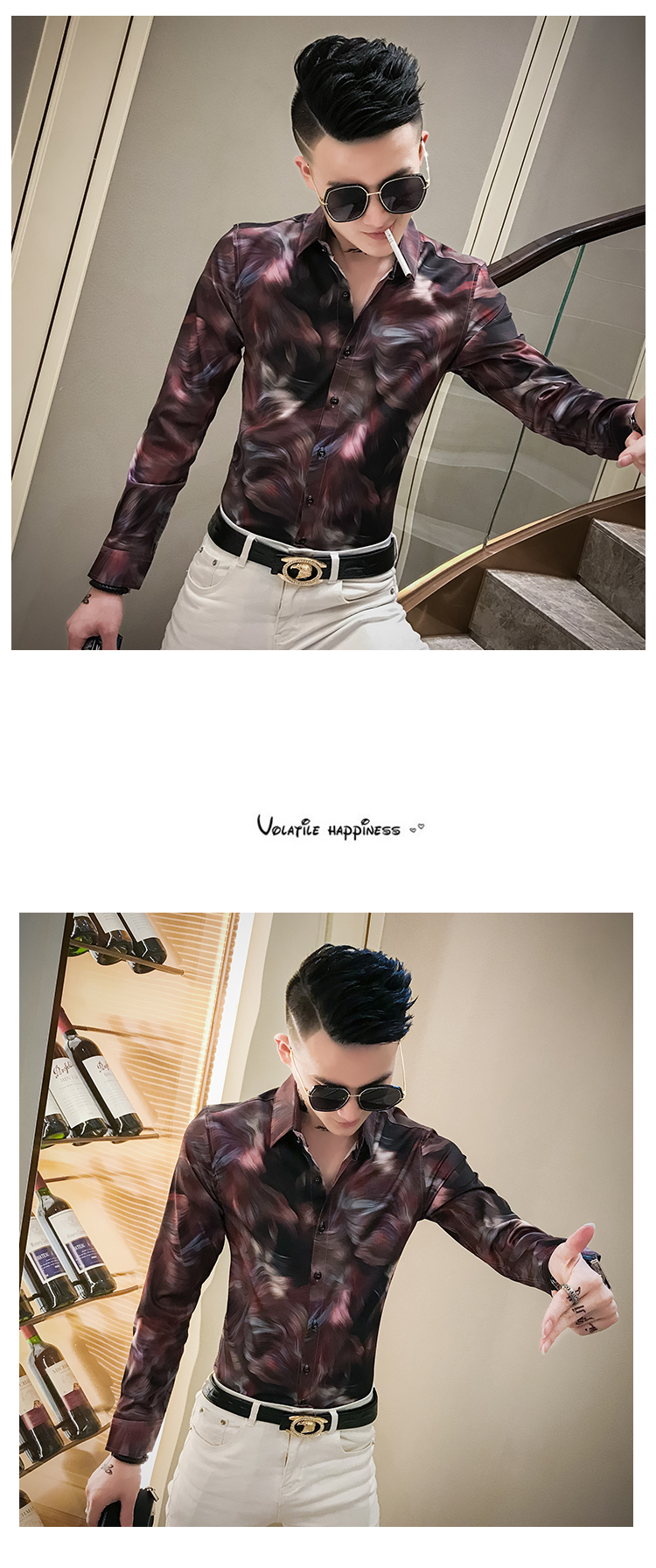 2019發型師男裝花襯衫網紅修身長袖個性襯衣社會人時尚修身襯衫潮1入