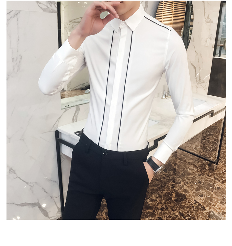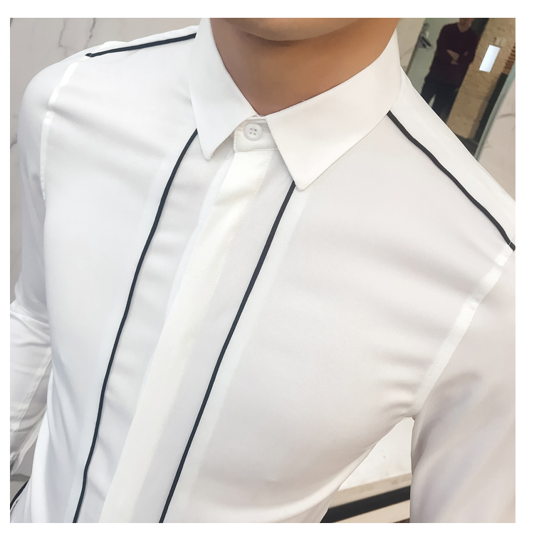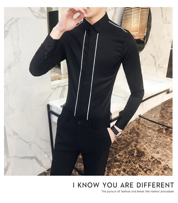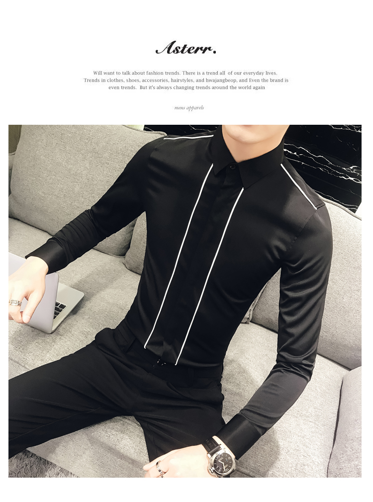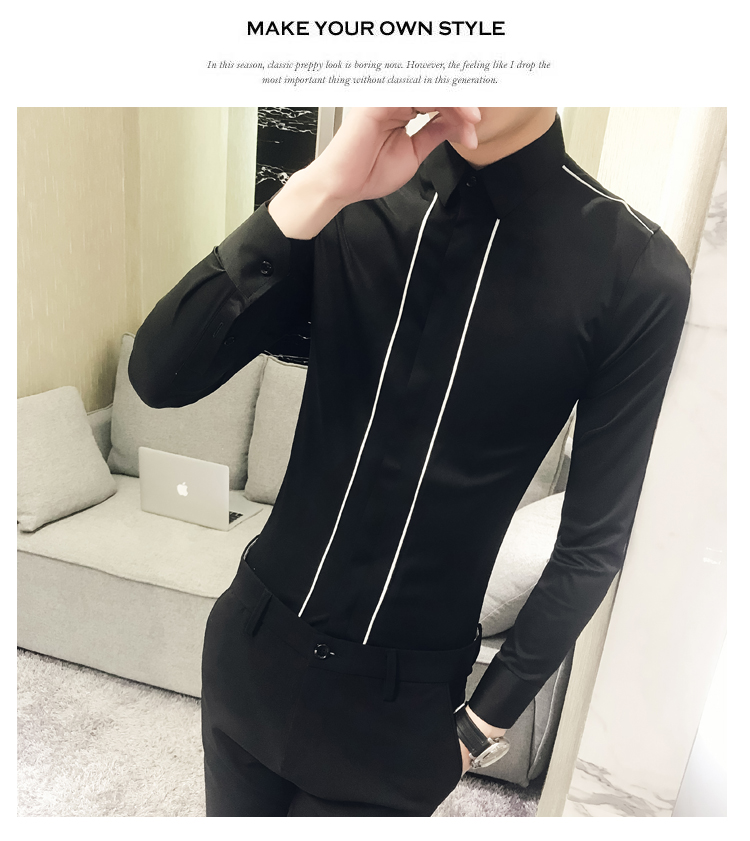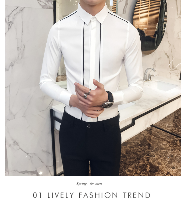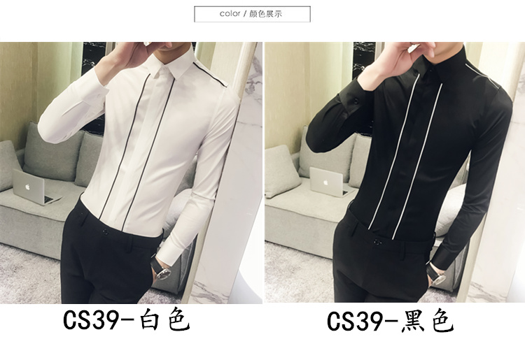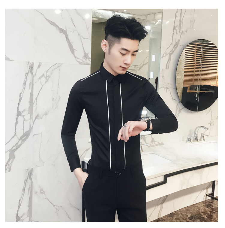 2019新款春秋修身花襯衫男韓版長袖襯衫發型師潮流條紋襯衣男青年1入