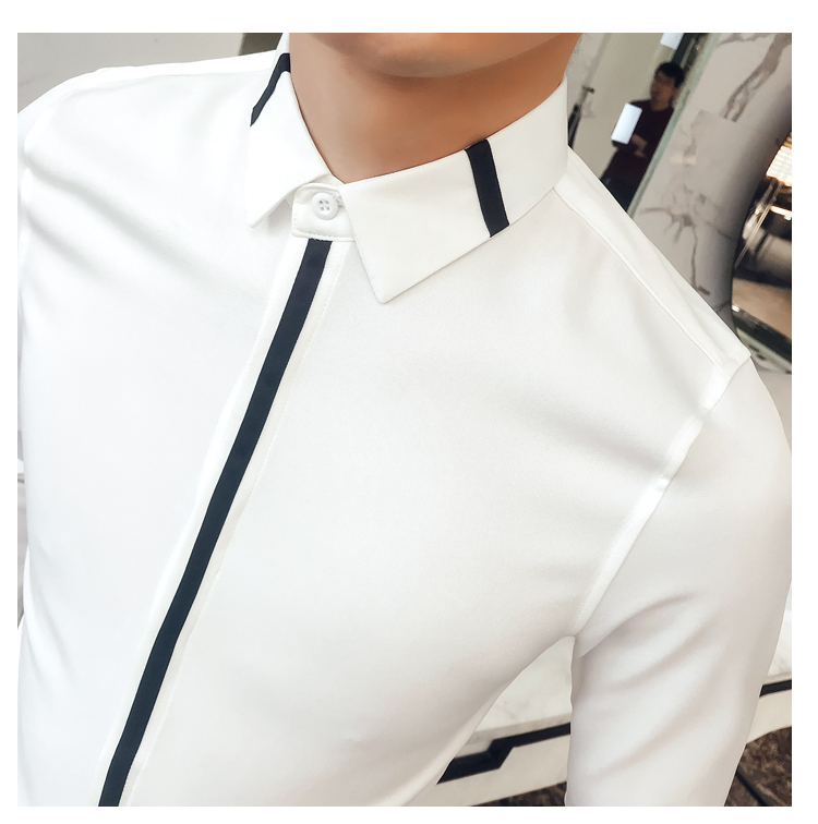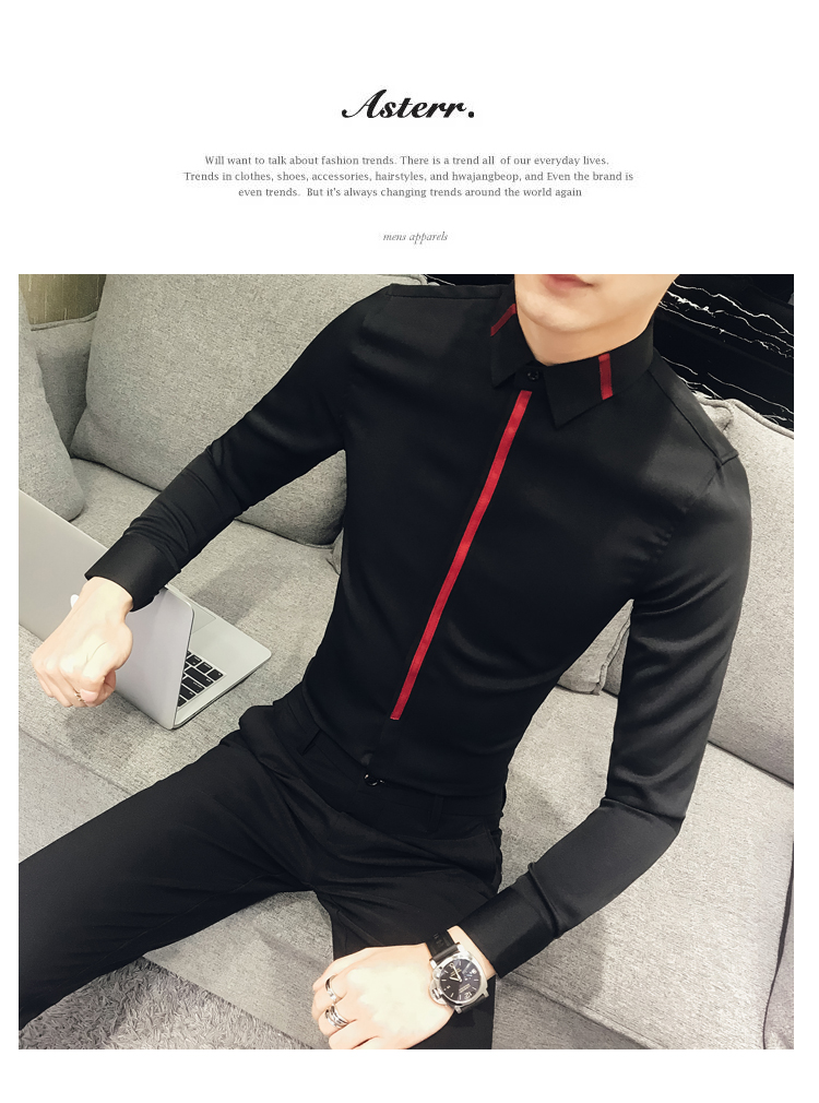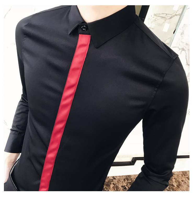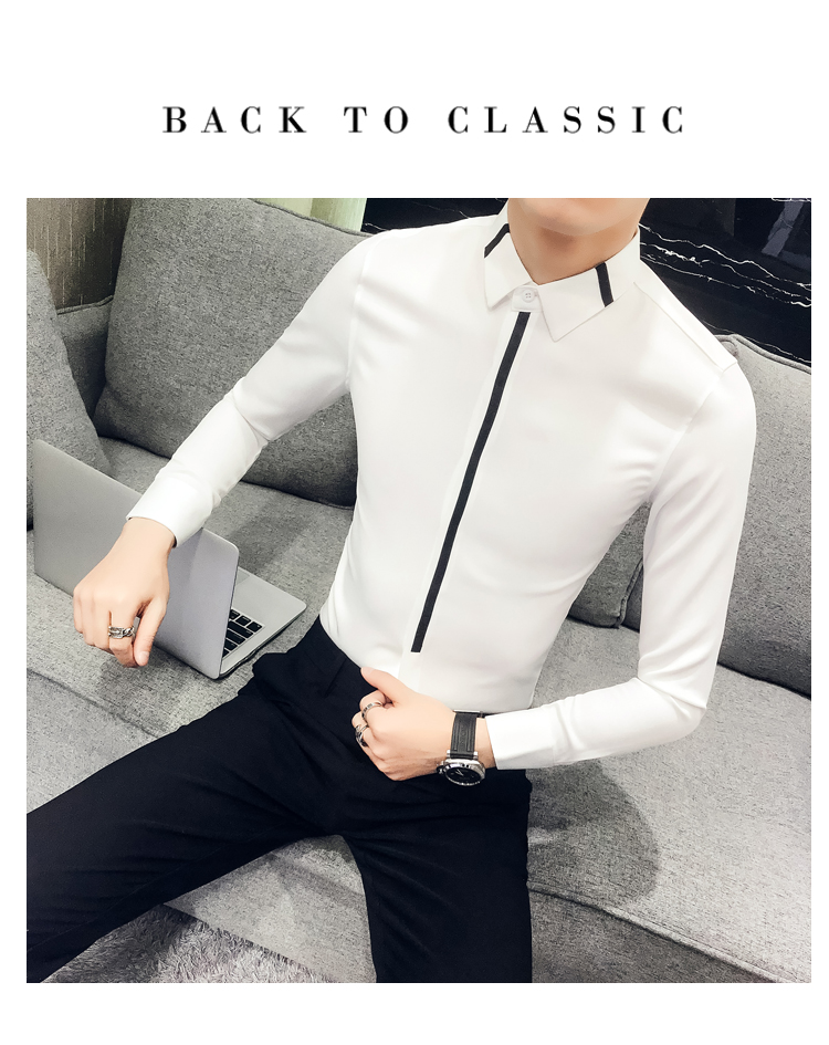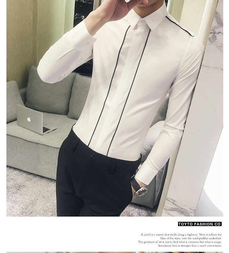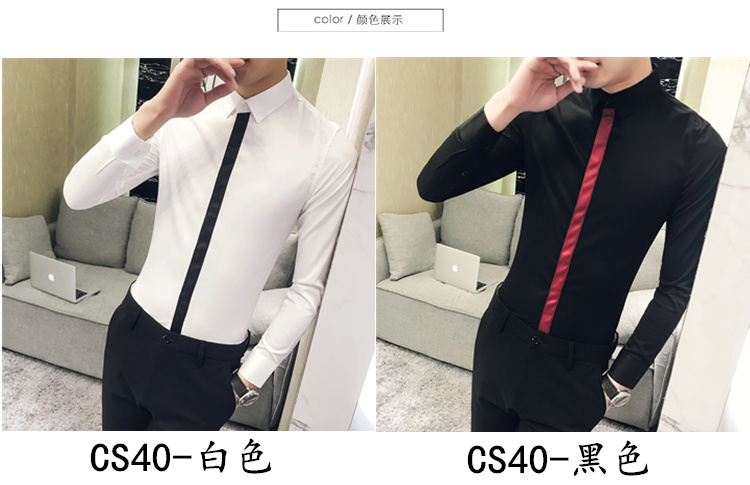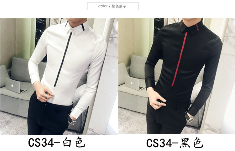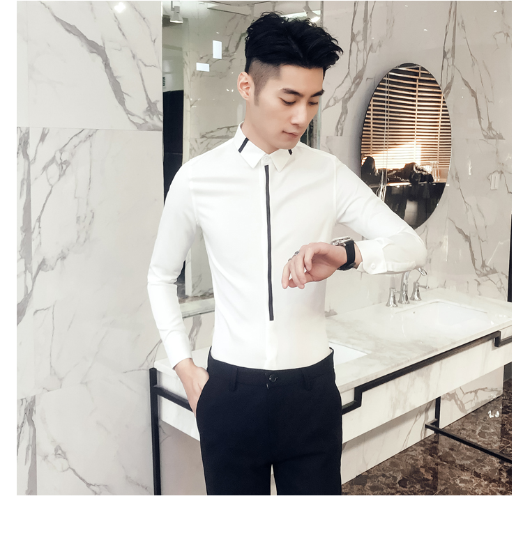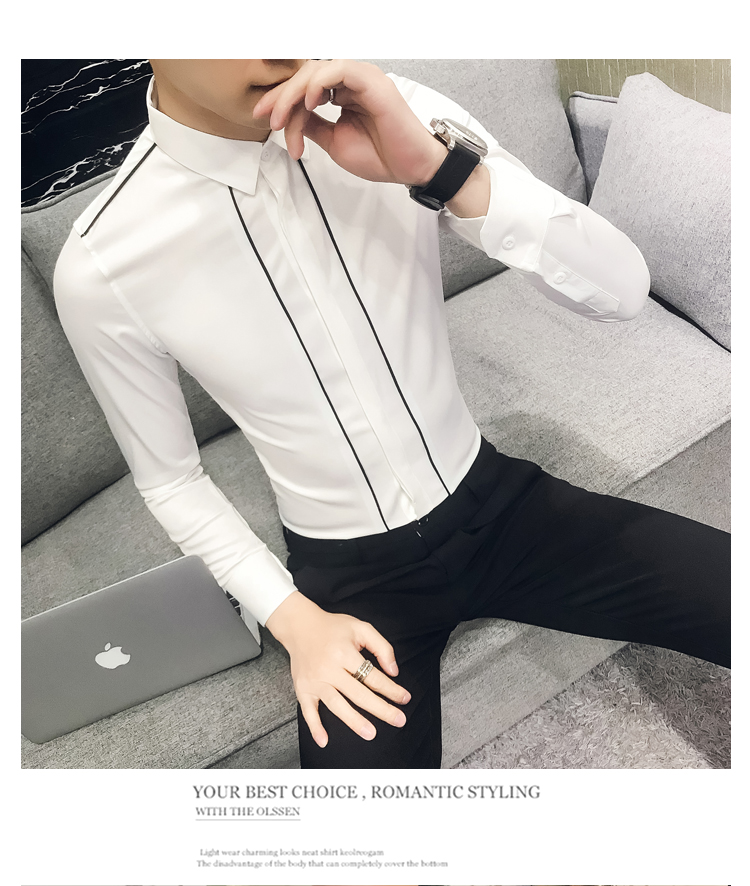 2019新款春秋修身花襯衫男韓版長袖襯衫發型師潮流條紋襯衣男青年1入