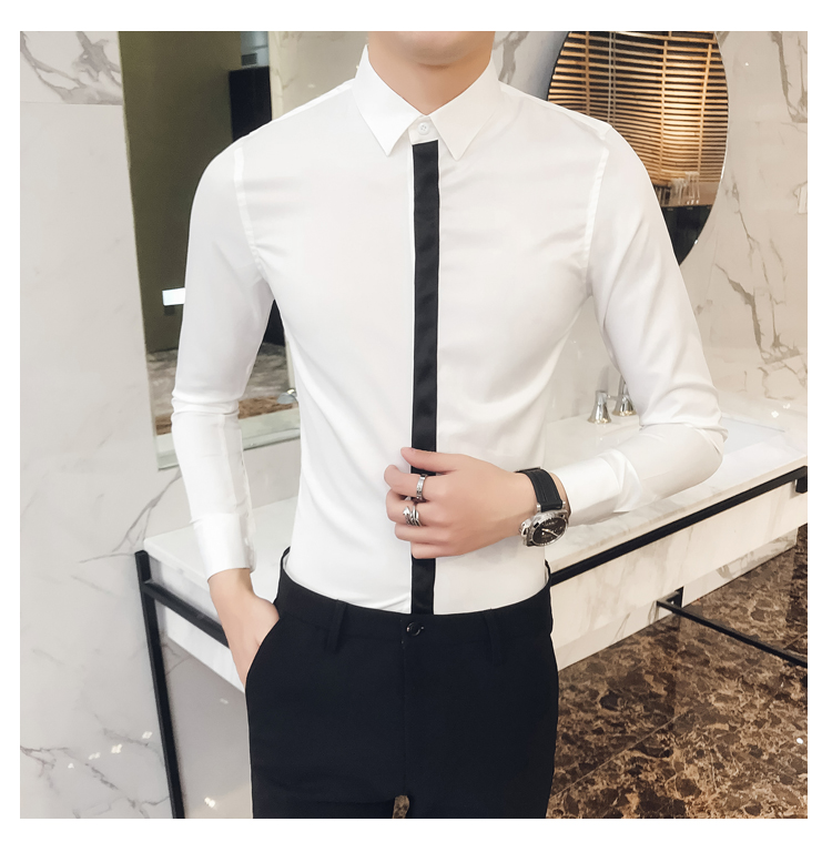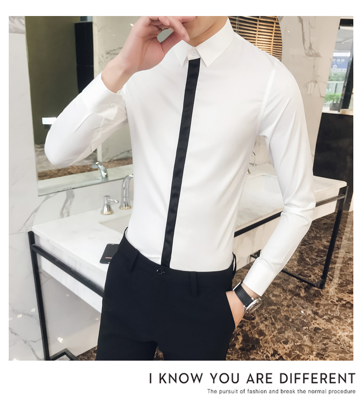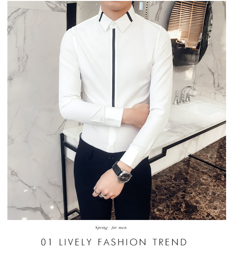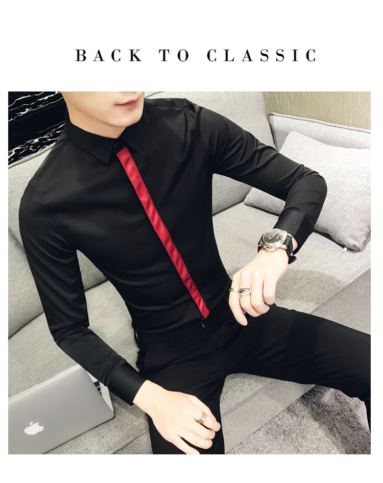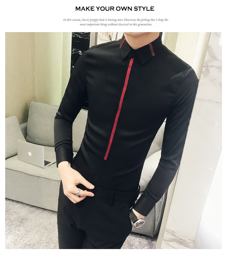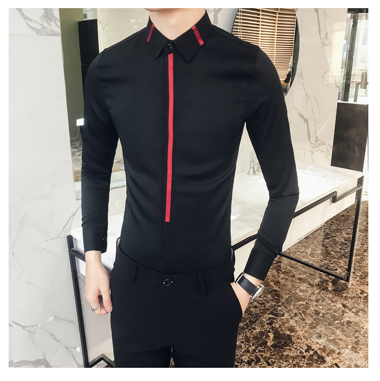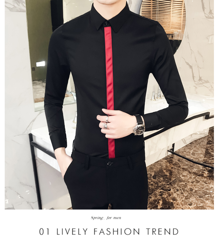 2019新款春秋修身花襯衫男韓版長袖襯衫發型師潮流條紋襯衣男青年1入