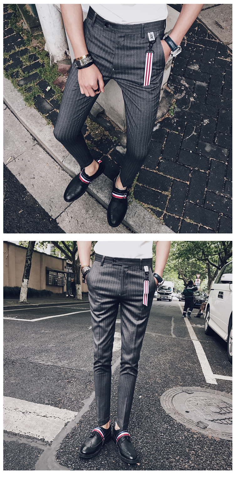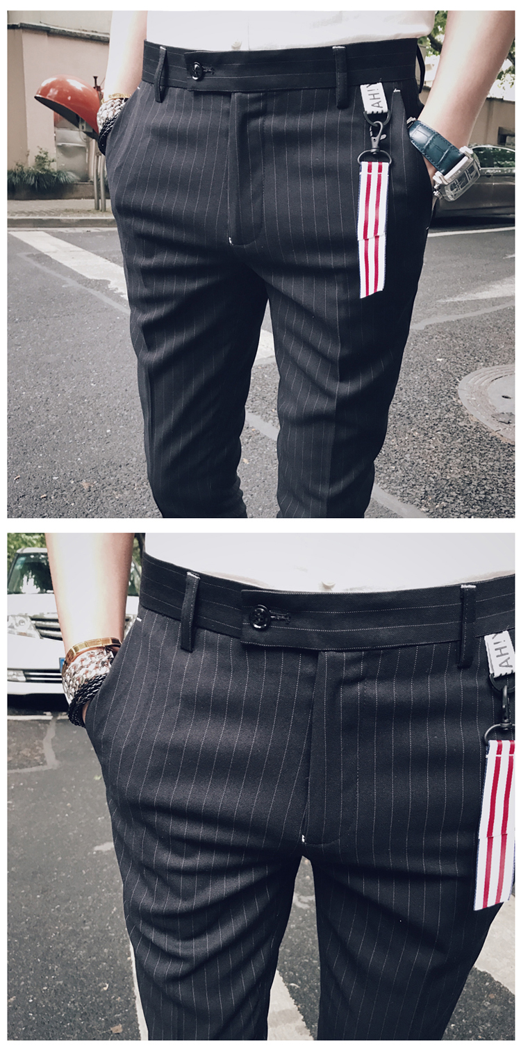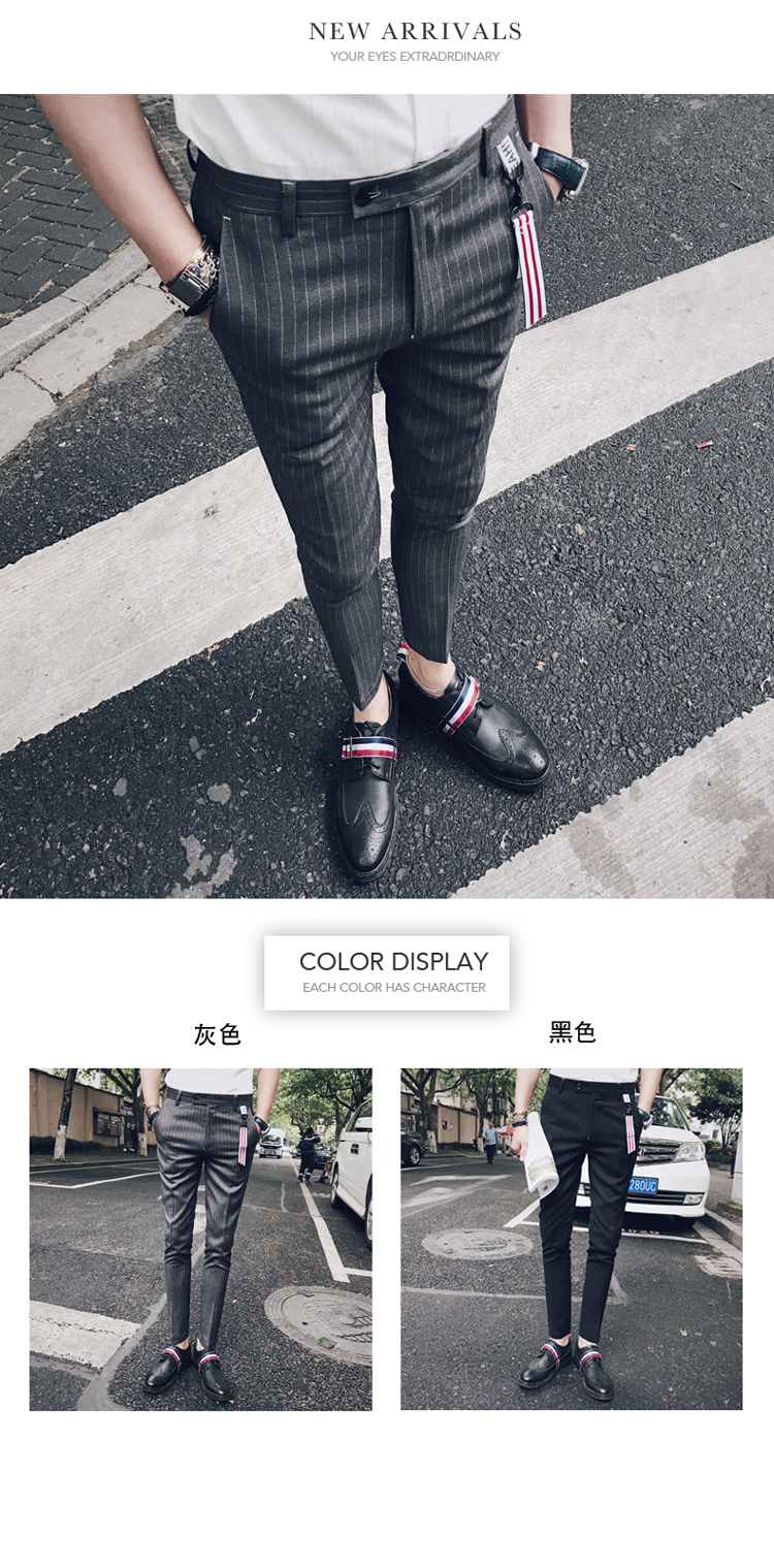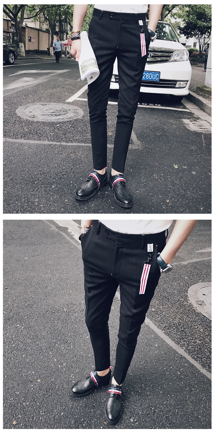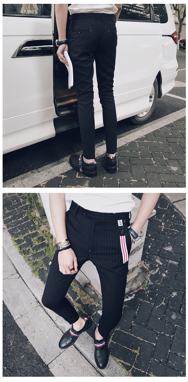 2018新款春夏條紋休閑褲發型師修身個性小腳褲男青年韓版潮流褲子1入
