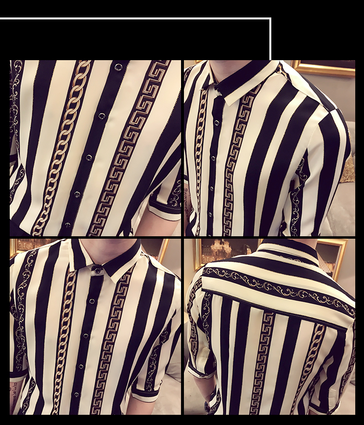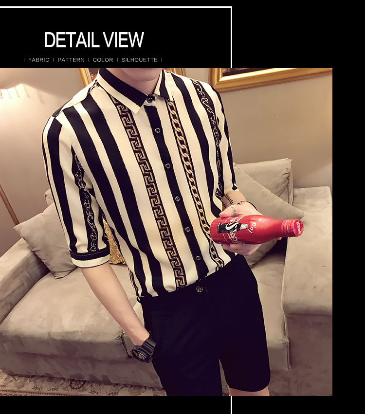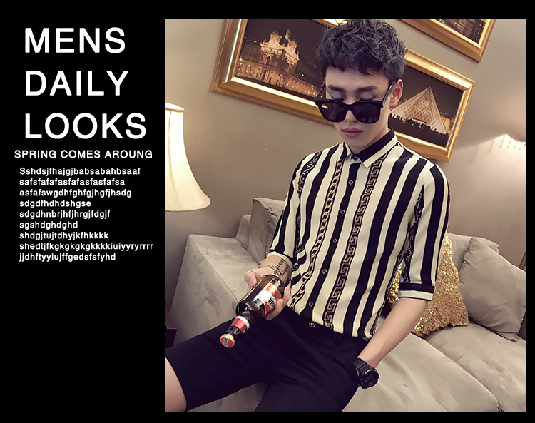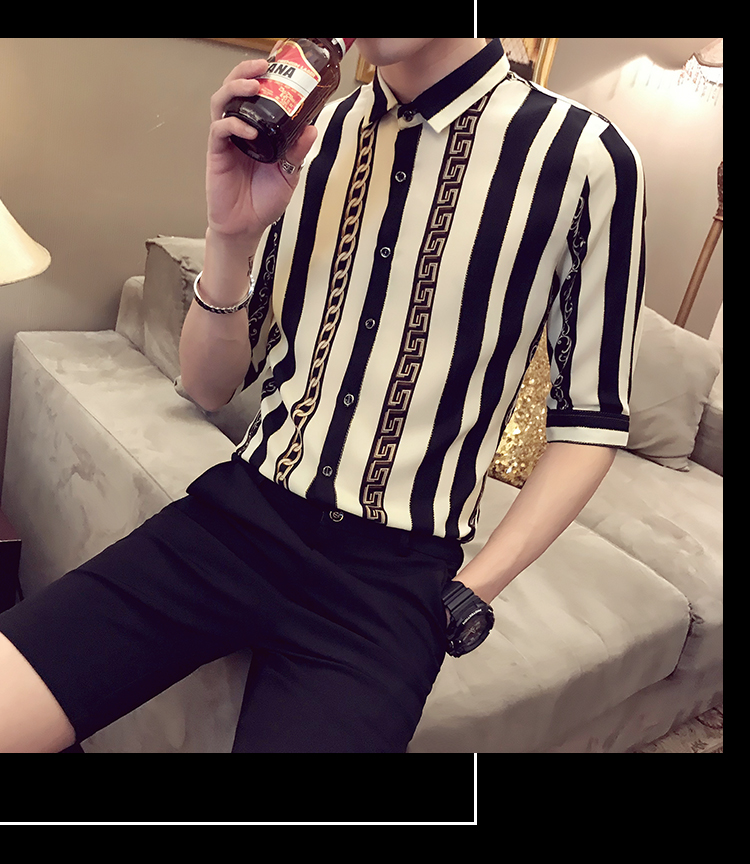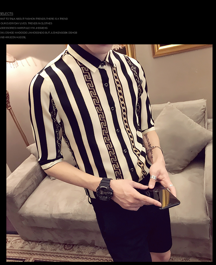 2019夏季男士條紋襯衫韓版七分袖網紅修身花襯衫社會小伙潮流中袖1入