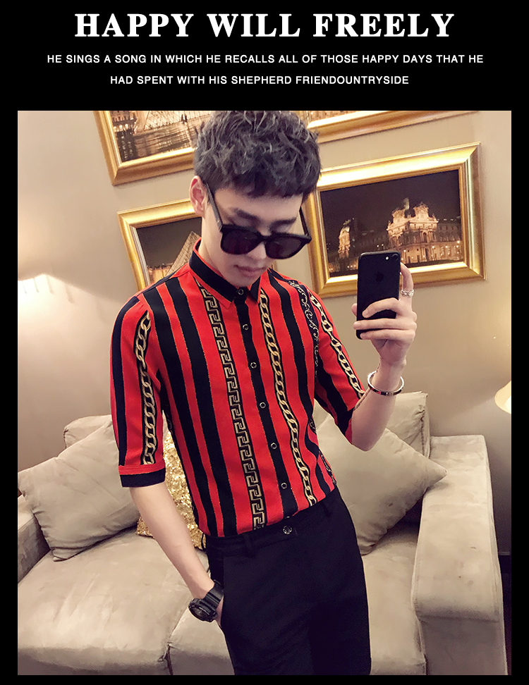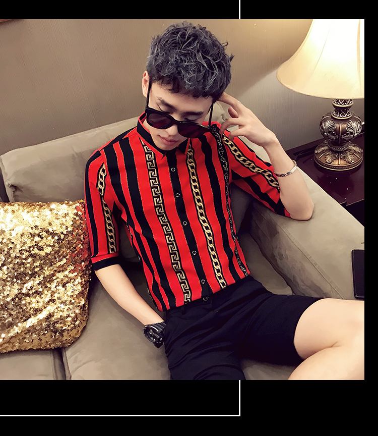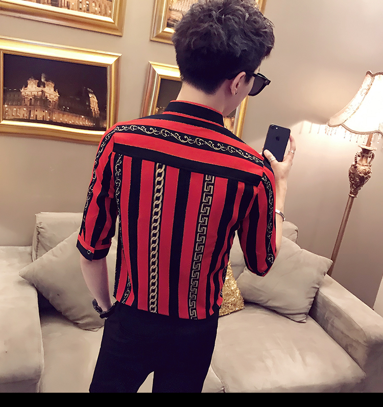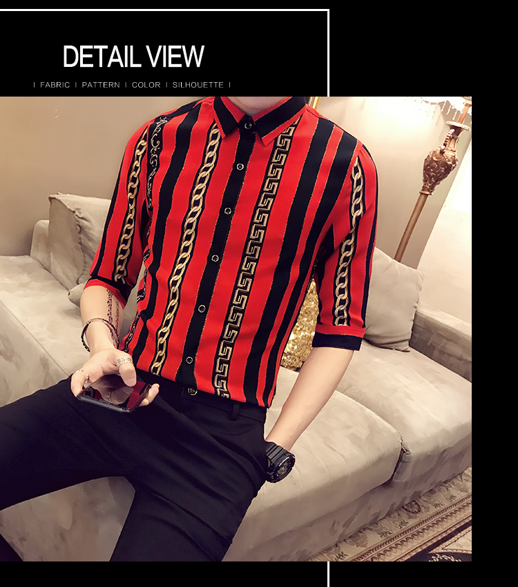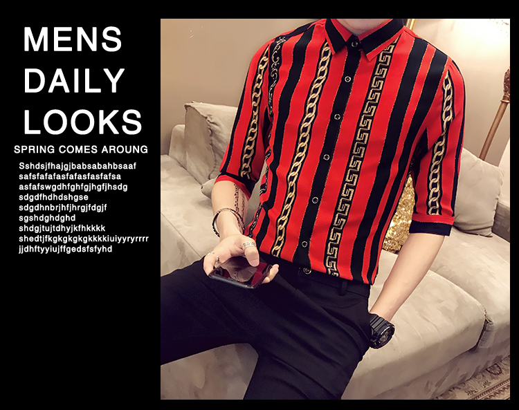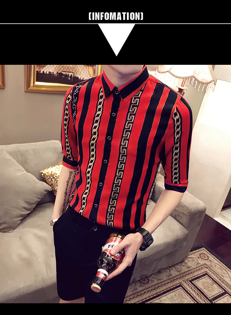 2019夏季男士條紋襯衫韓版七分袖網紅修身花襯衫社會小伙潮流中袖1入