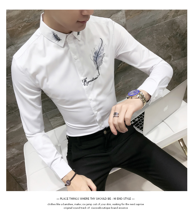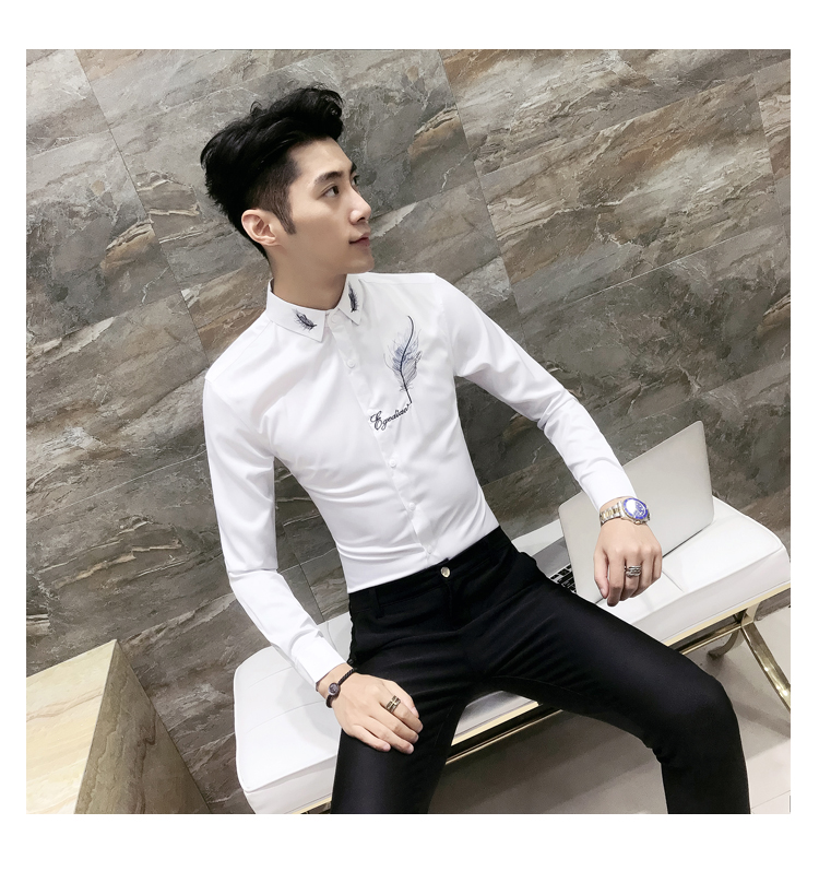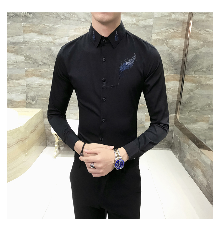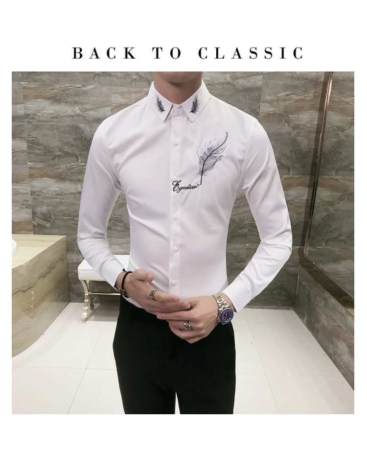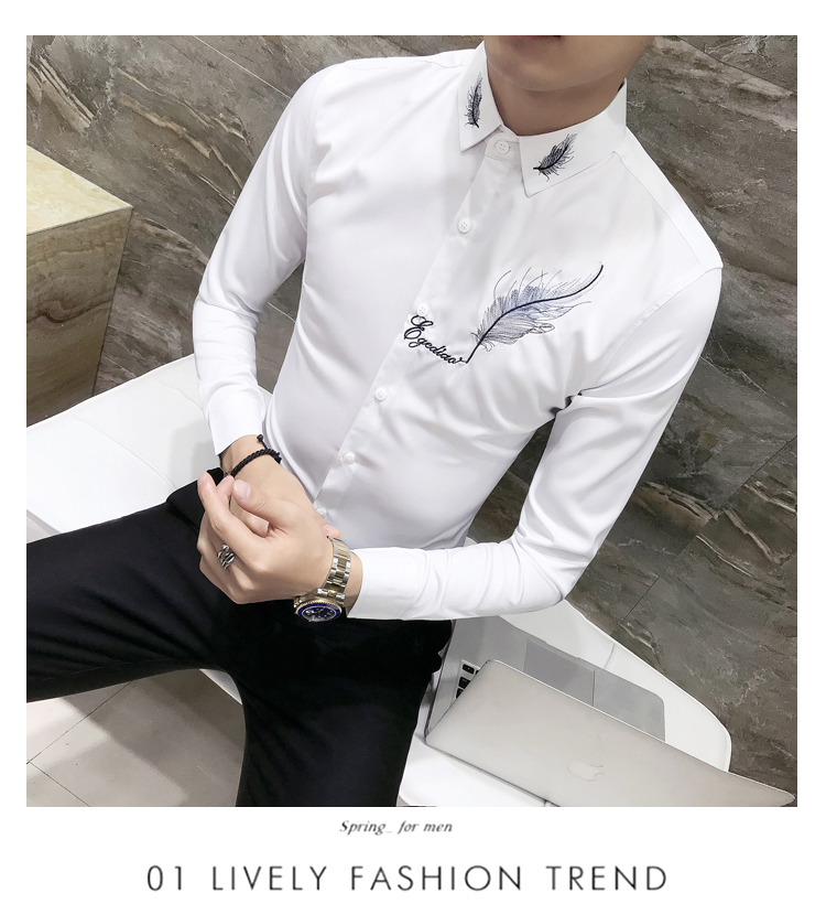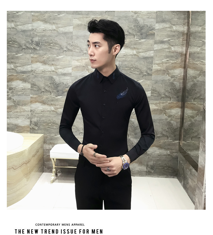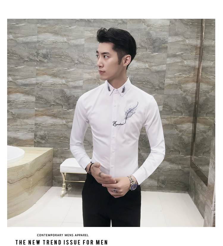 2018秋季男士休閑繡花長袖襯衫韓版潮流百搭襯衣青年修身個性男裝1入