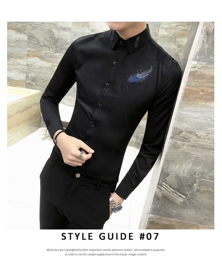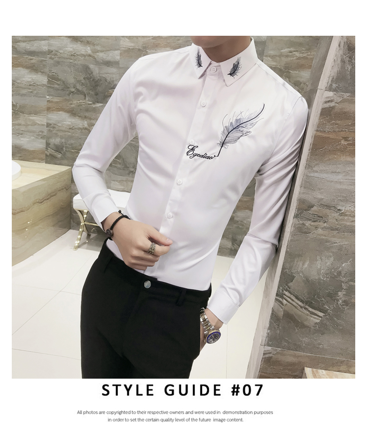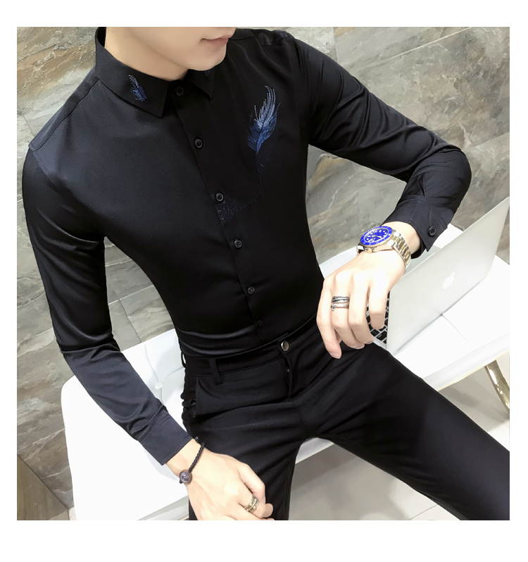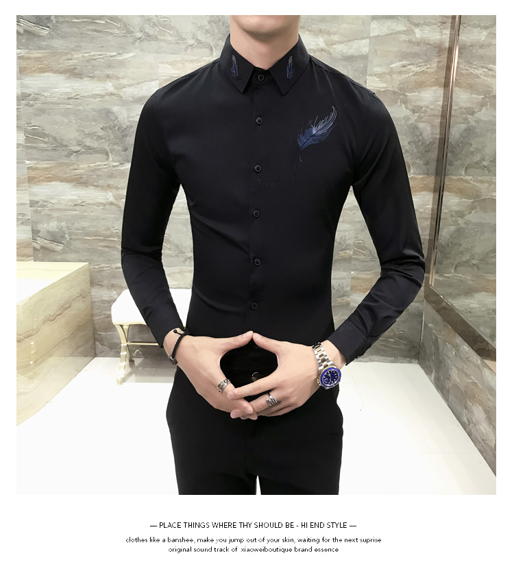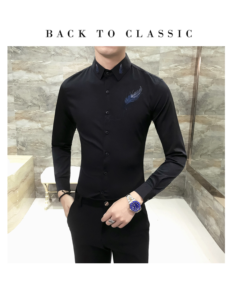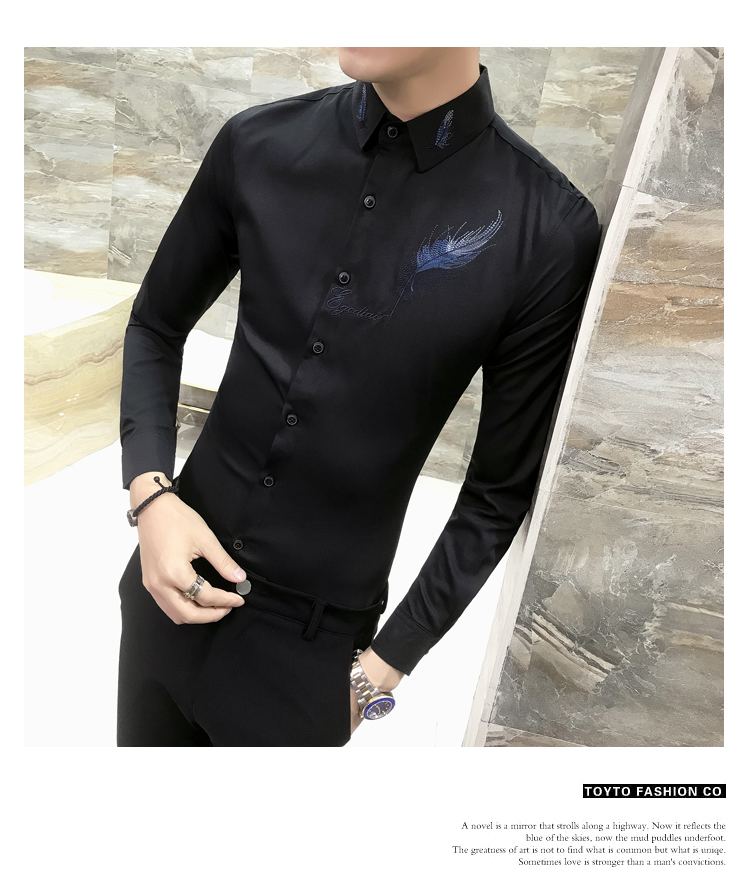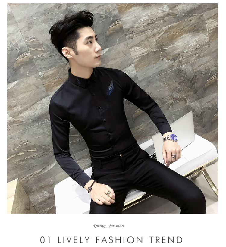 2018秋季男士休閑繡花長袖襯衫韓版潮流百搭襯衣青年修身個性男裝1入