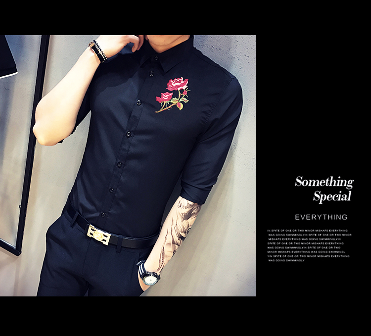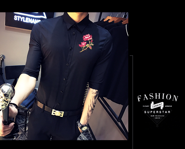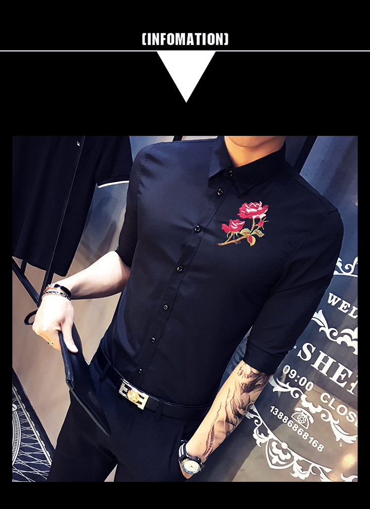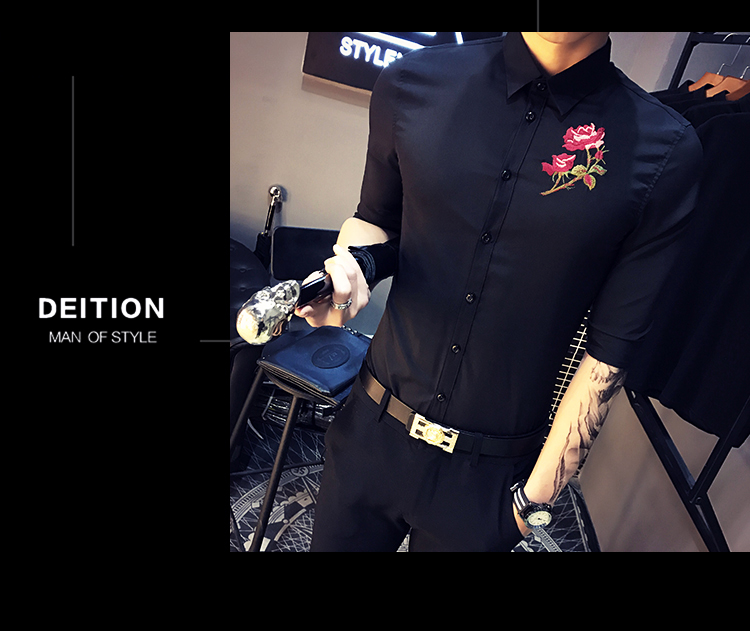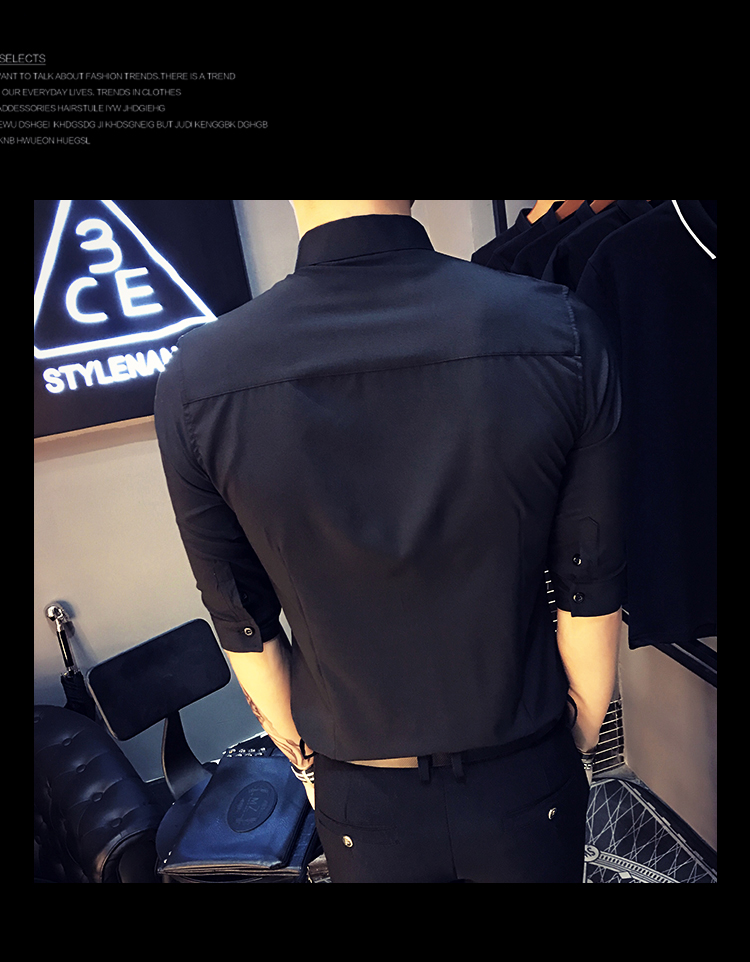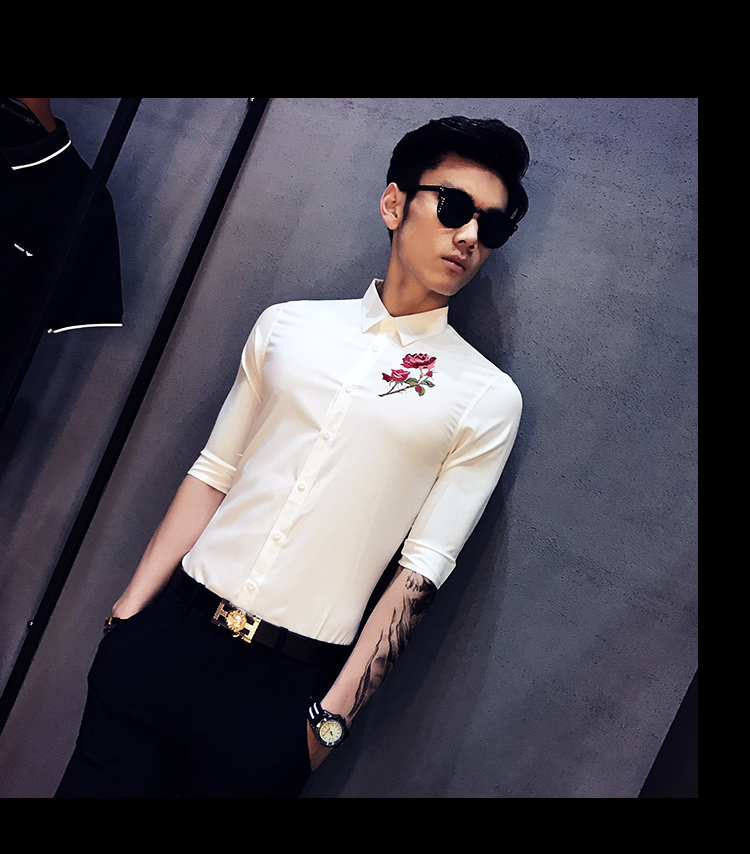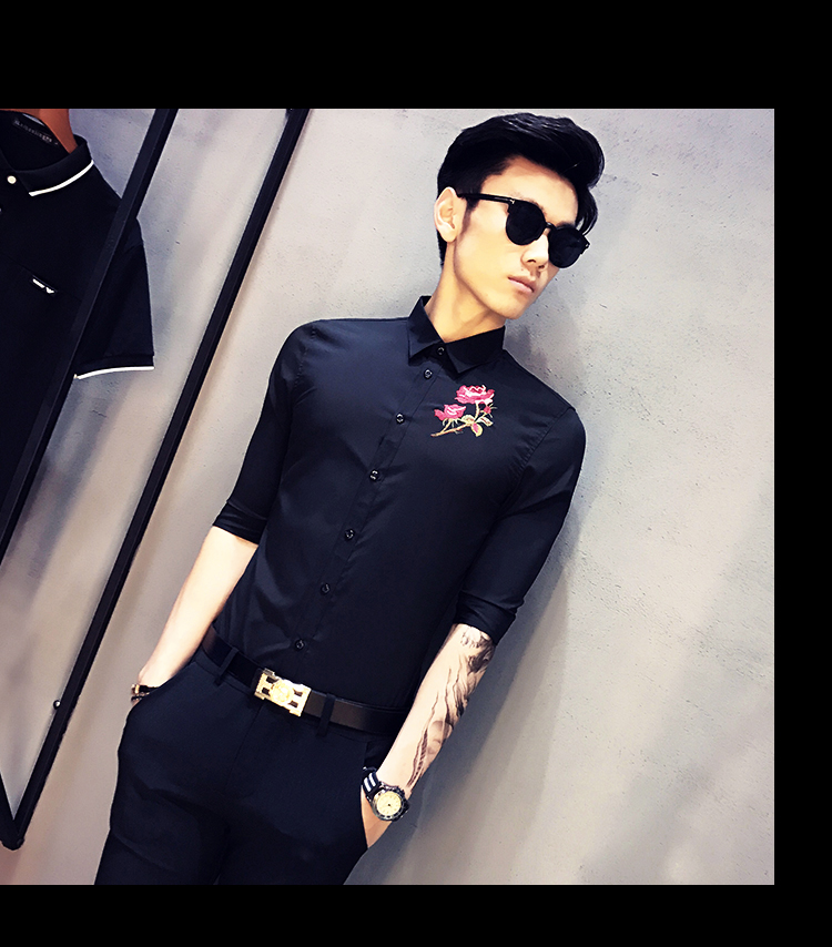 2017新款夏季中袖襯衫發型師韓版修身七分袖襯衣青年男裝繡花短袖1入