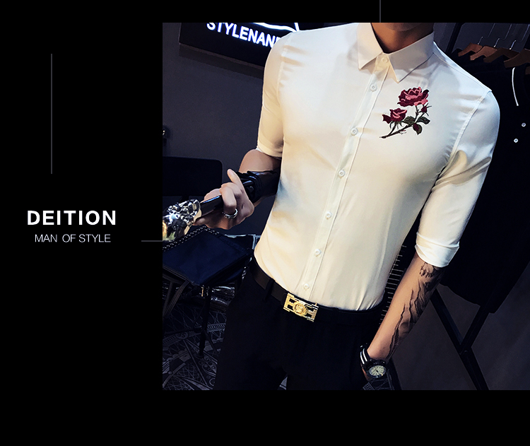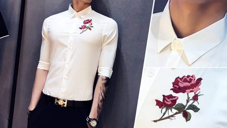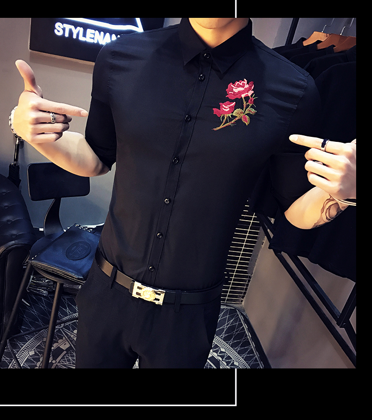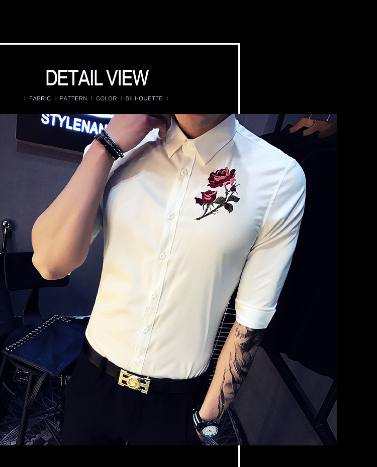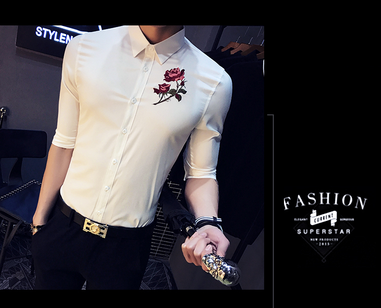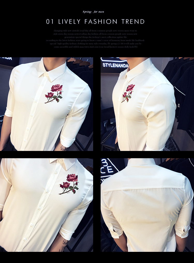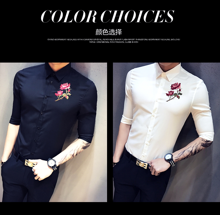 2017新款夏季中袖襯衫發型師韓版修身七分袖襯衣青年男裝繡花短袖1入