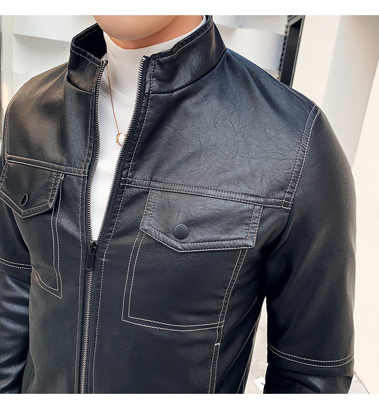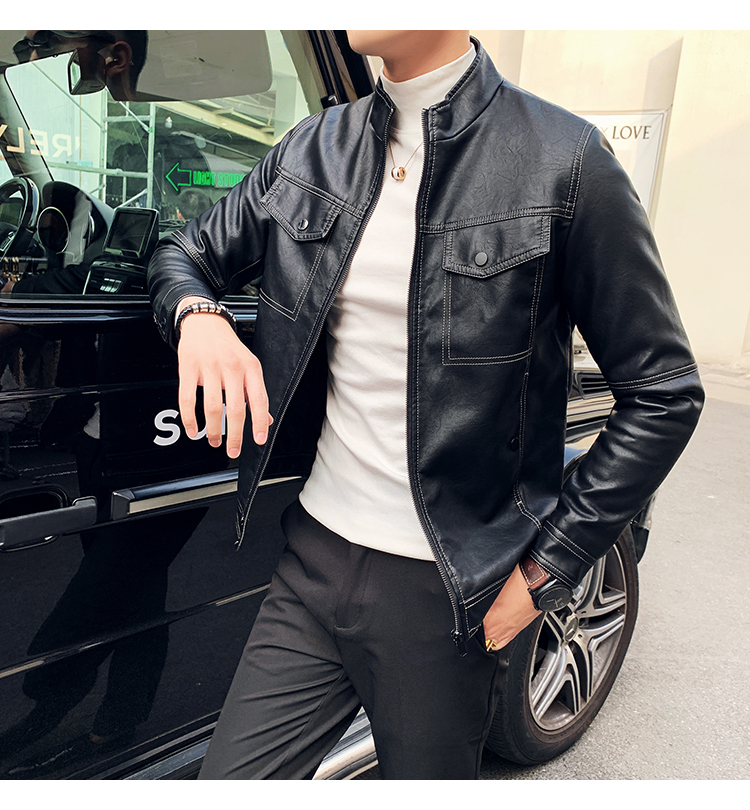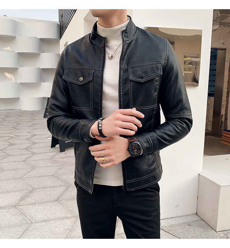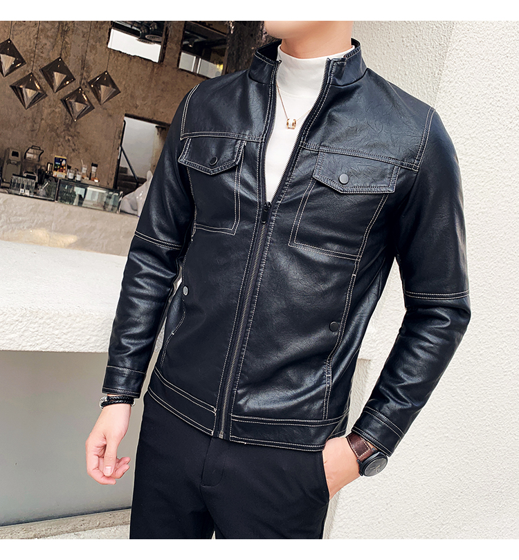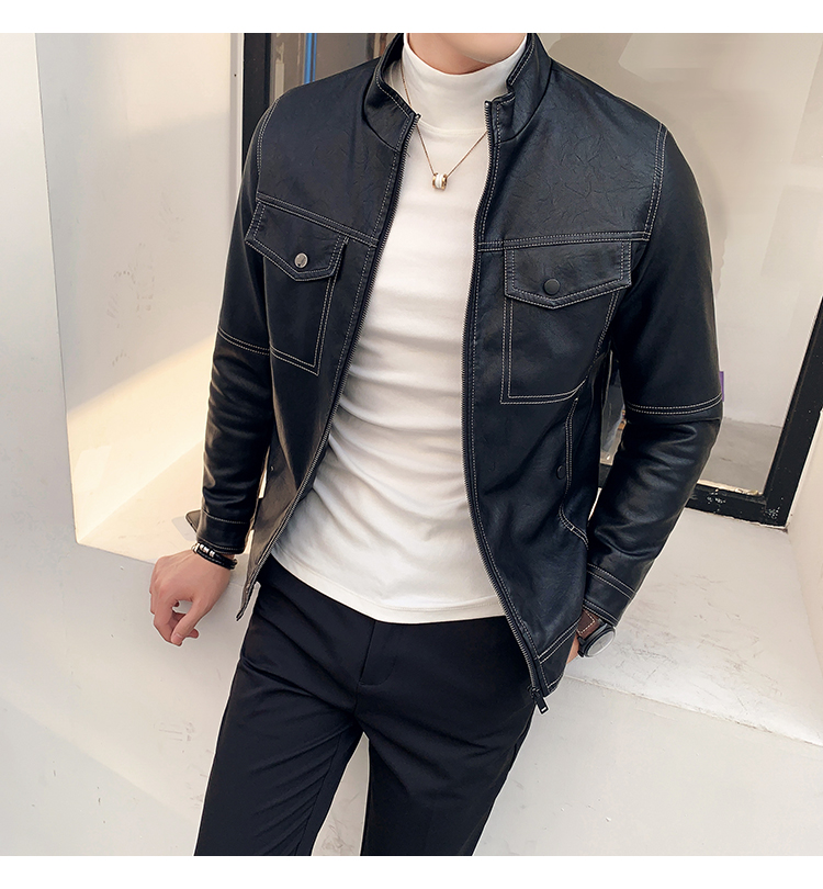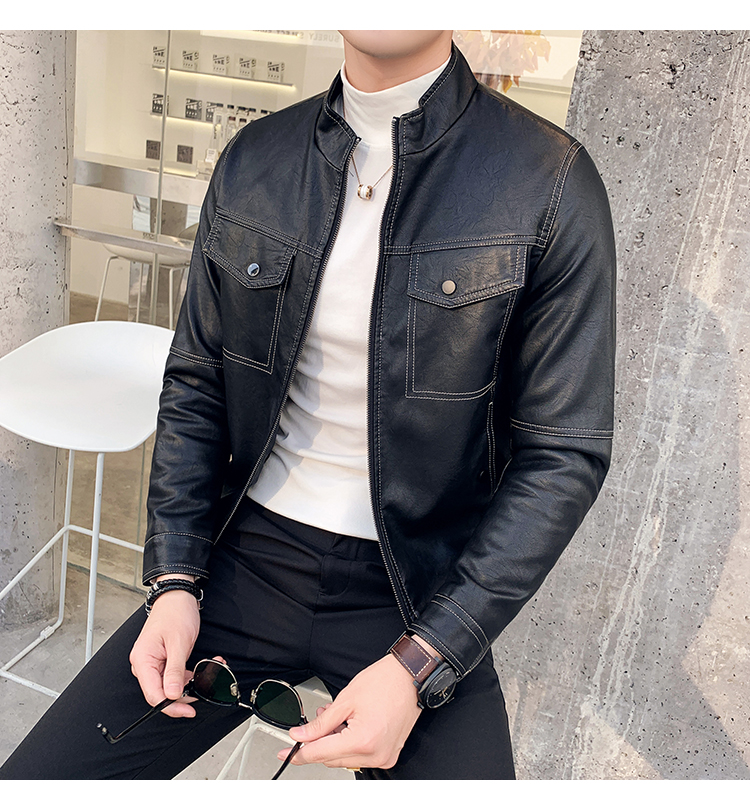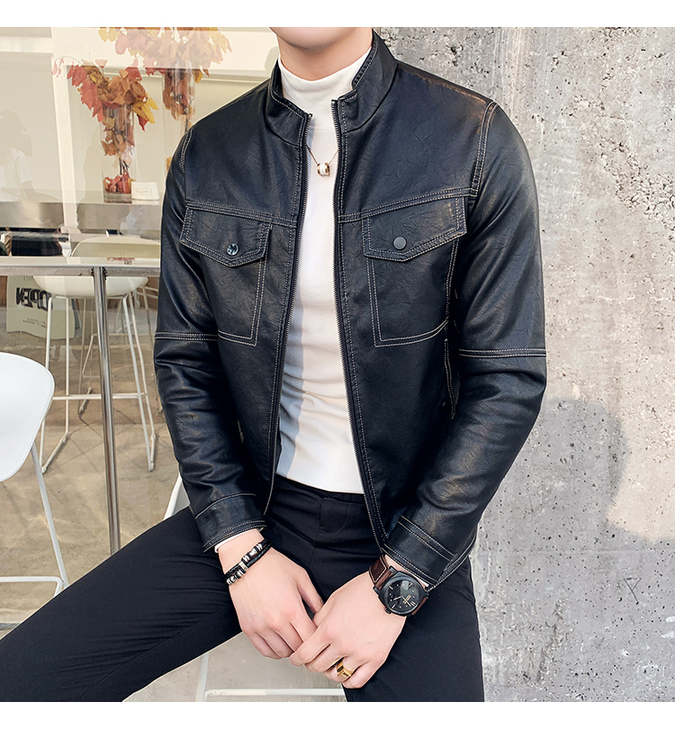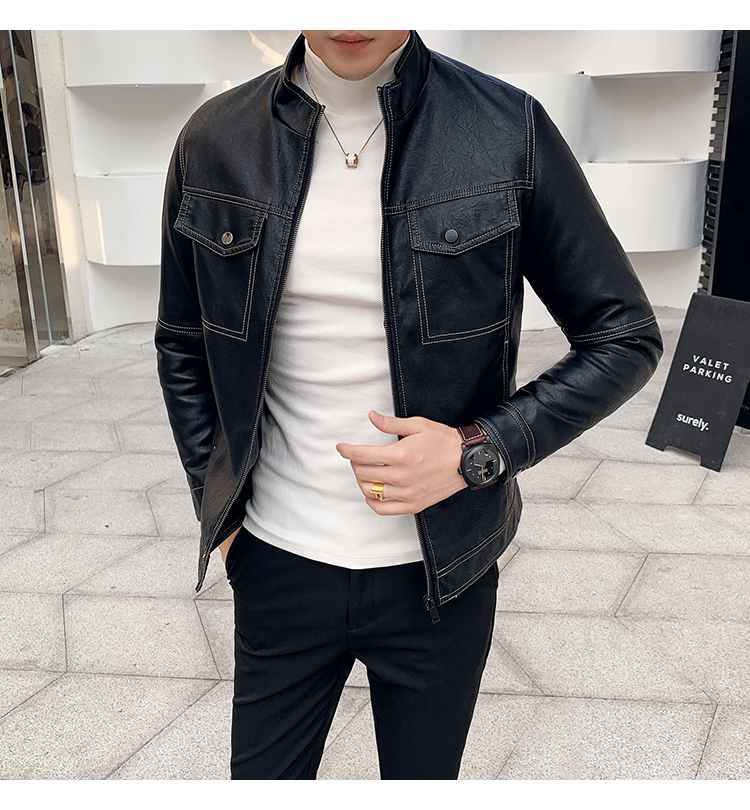 2019帥氣發型師夜店秋冬新款潮流時尚皮衣夾克韓版修身加厚外套男1入