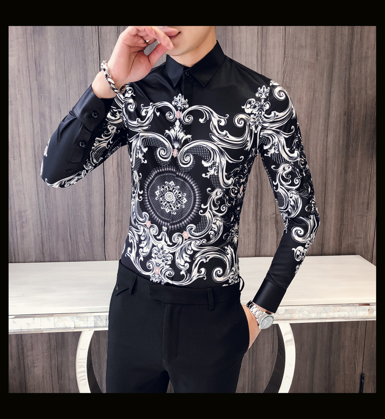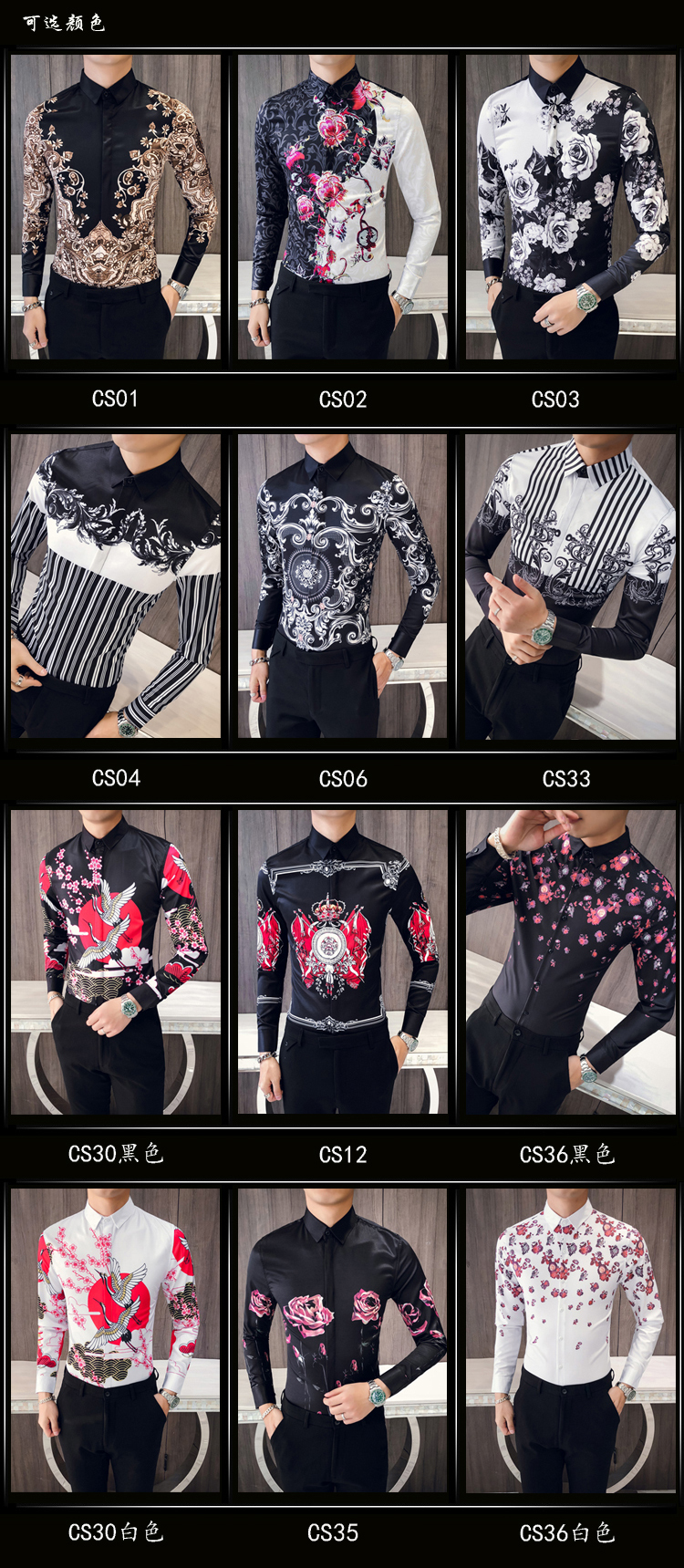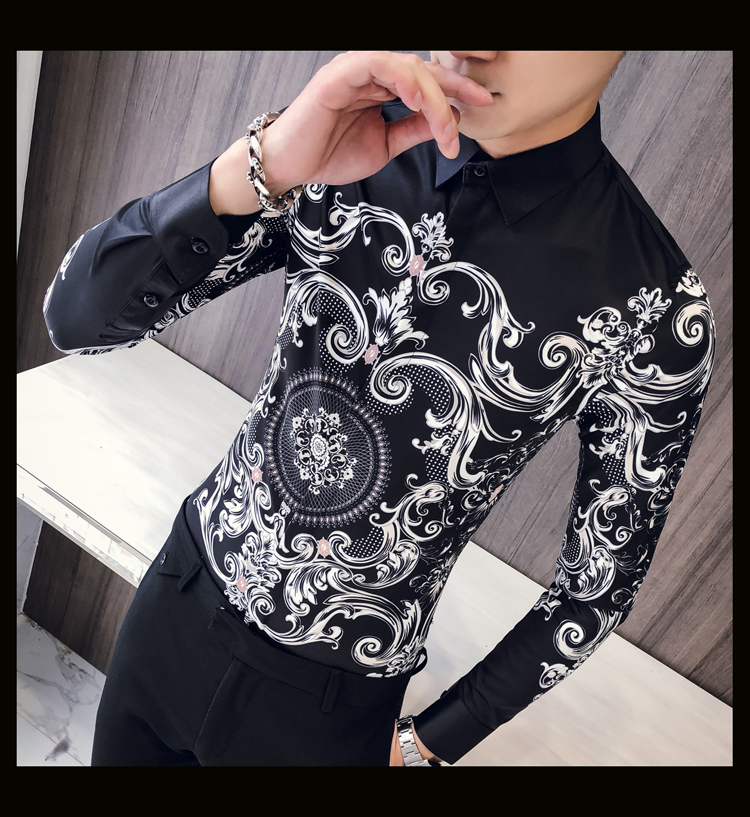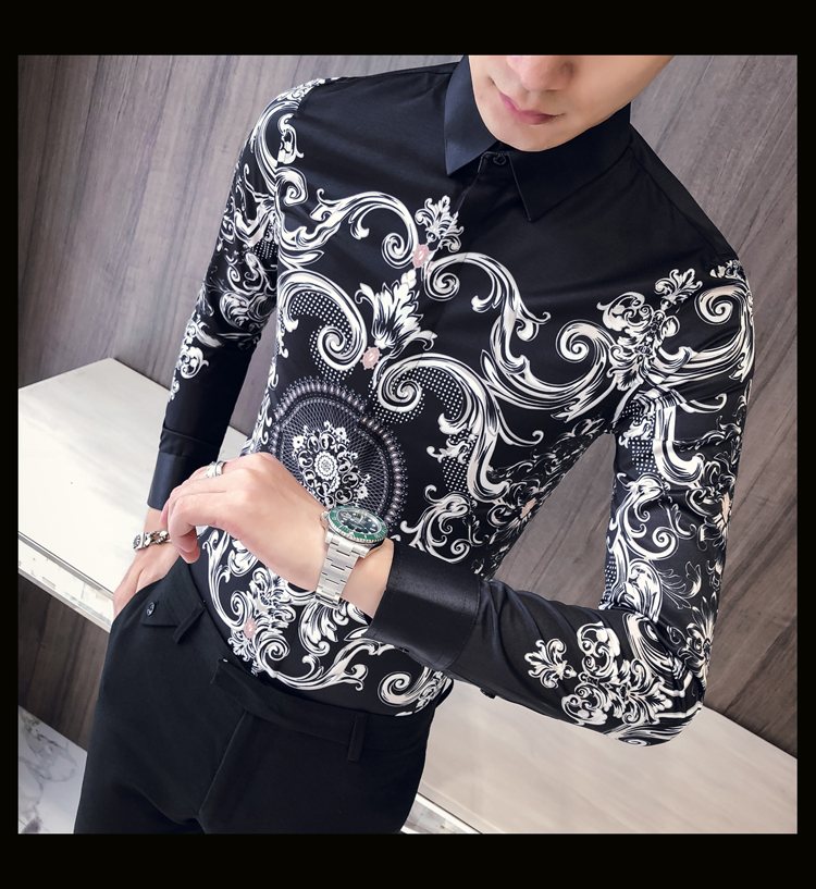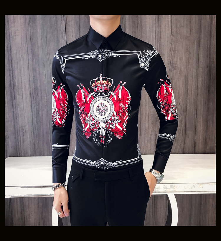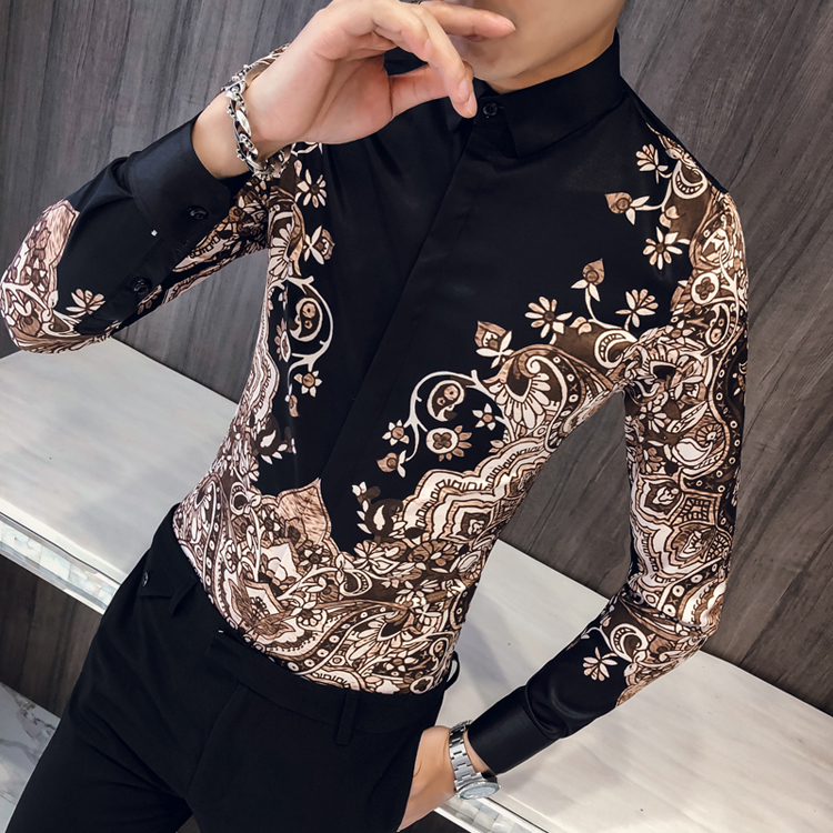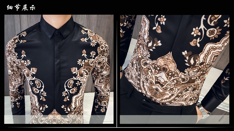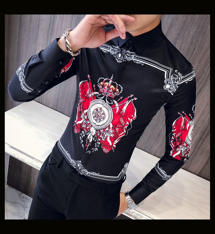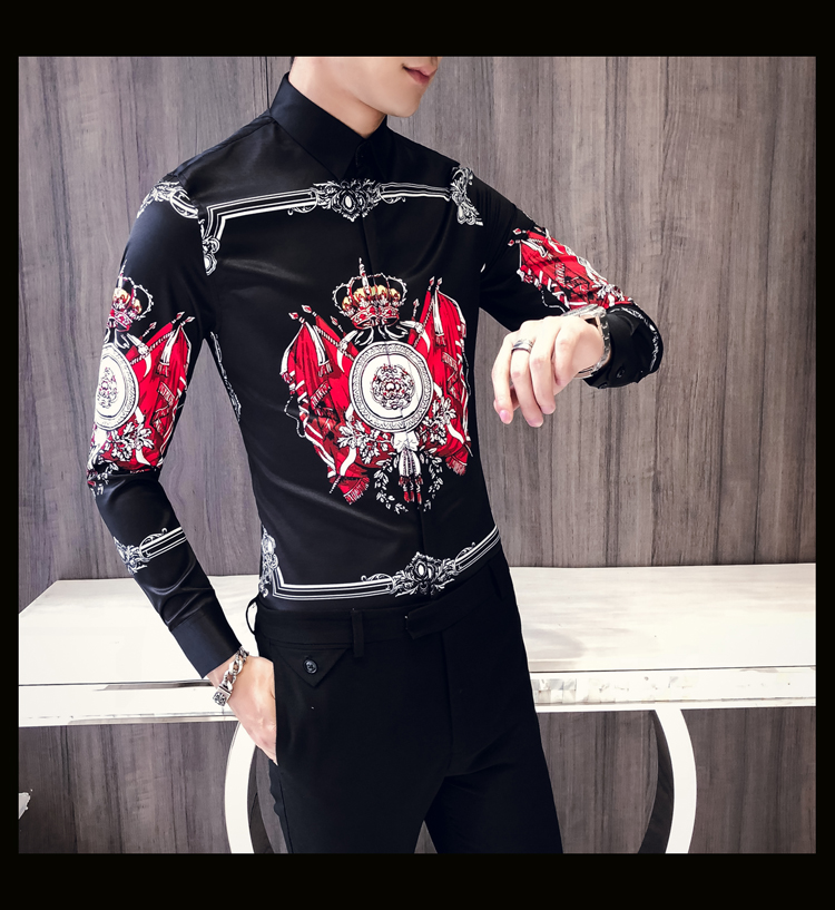 2019新款秋季印花襯衫修身長袖男網紅韓版痞帥氣襯衣社會潮流衣服1入
