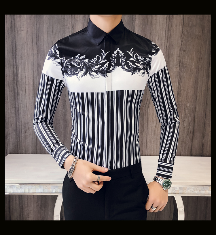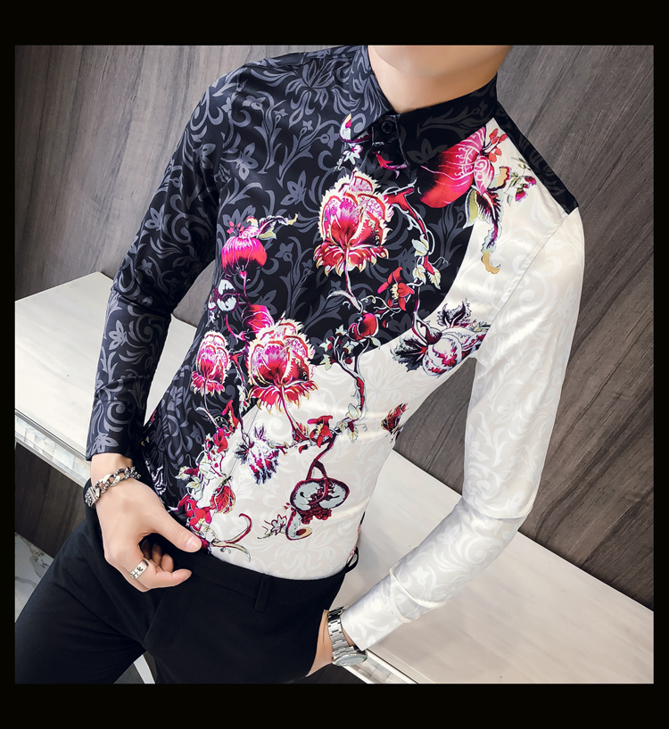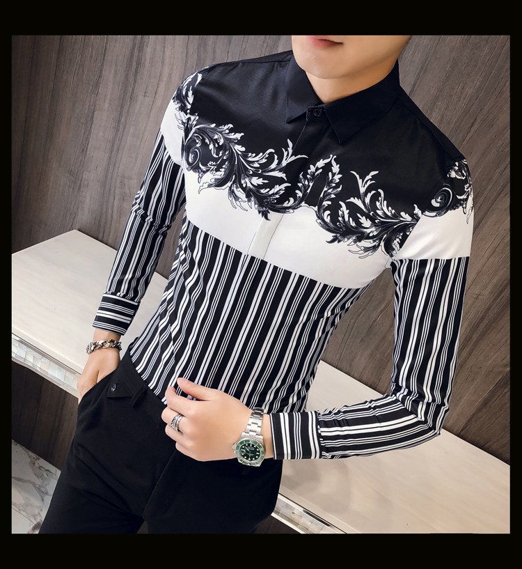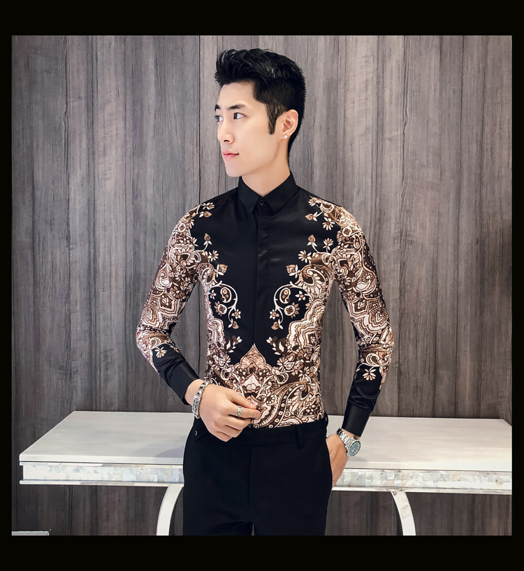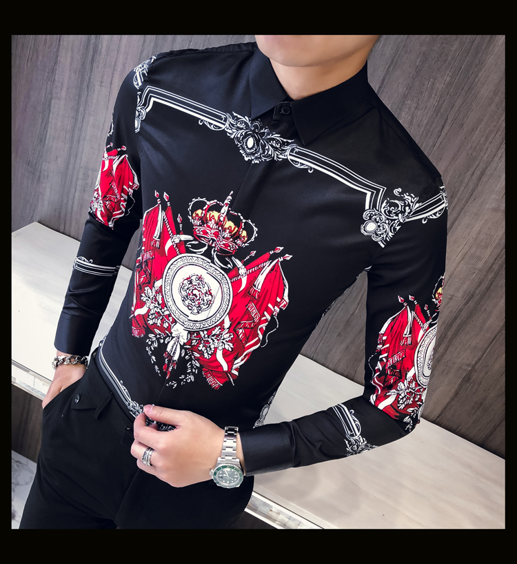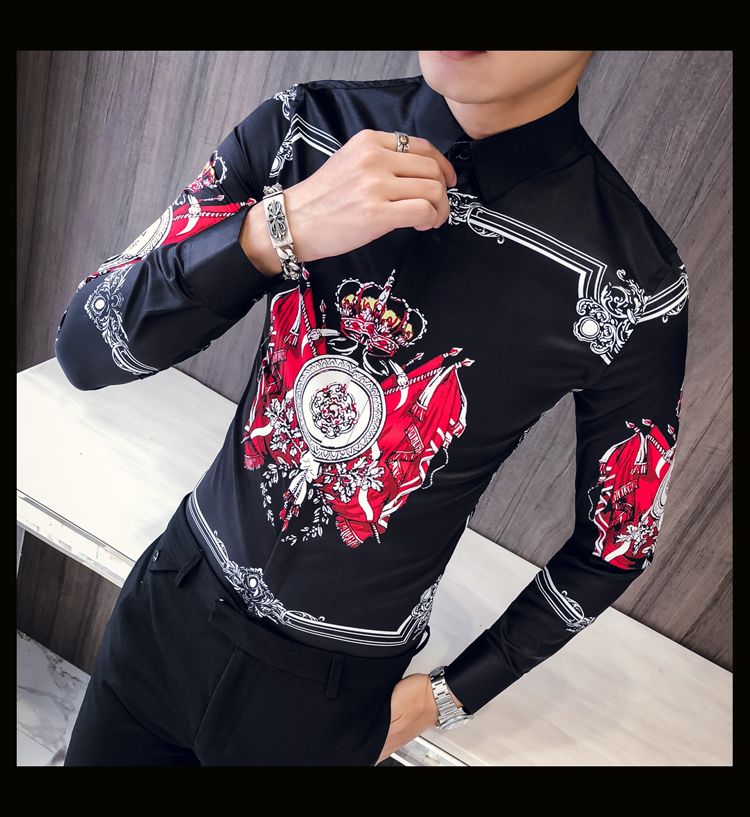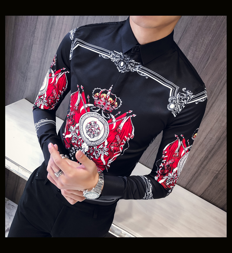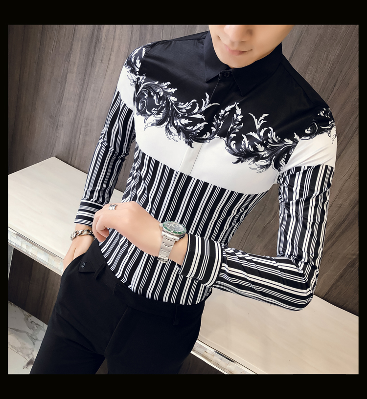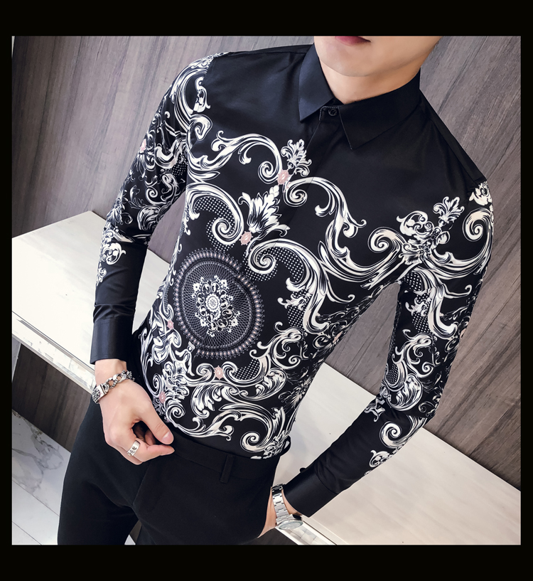 2019新款秋季印花襯衫修身長袖男網紅韓版痞帥氣襯衣社會潮流衣服1入
