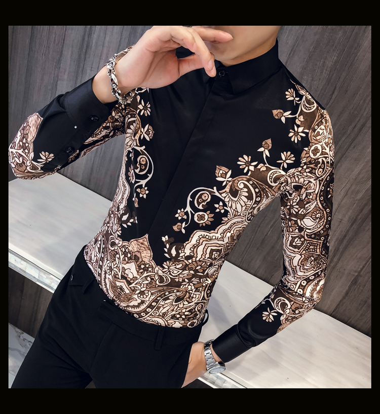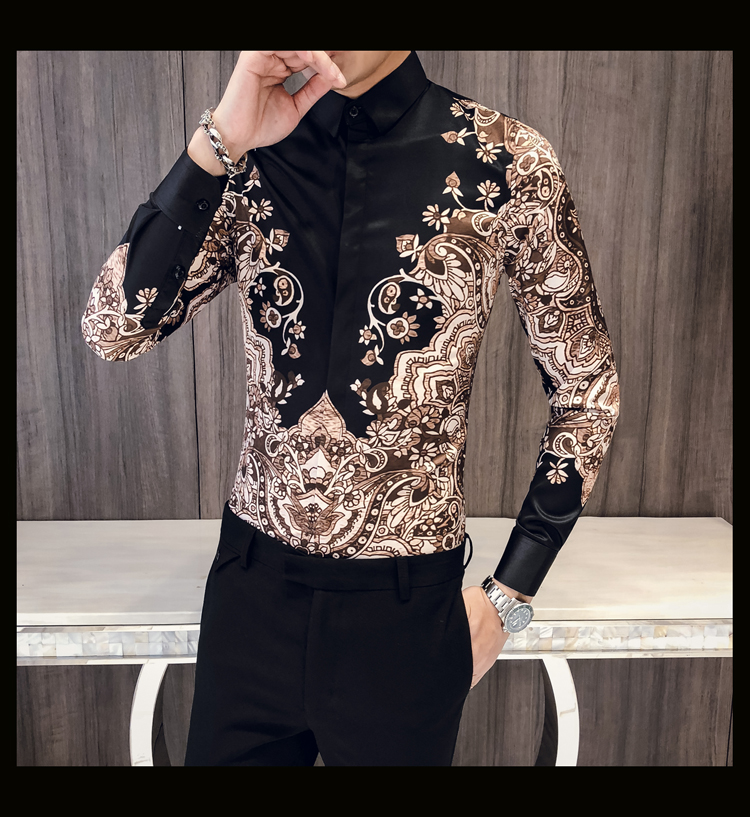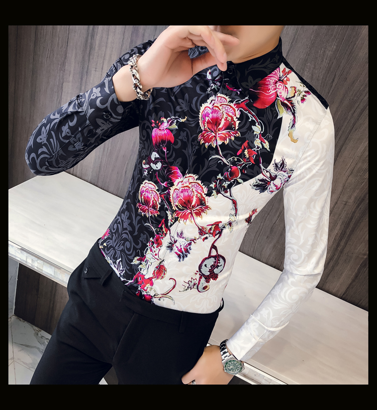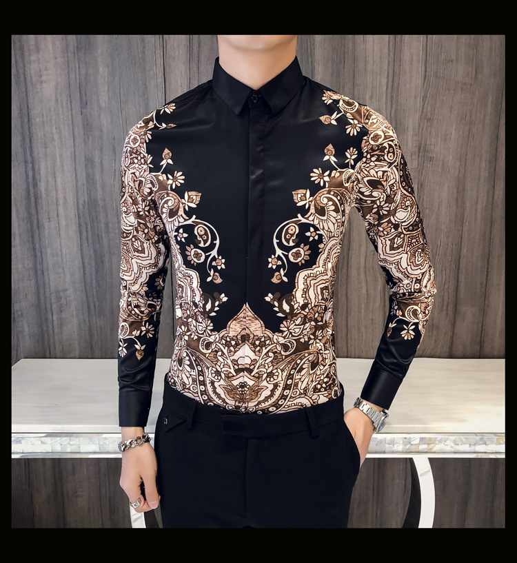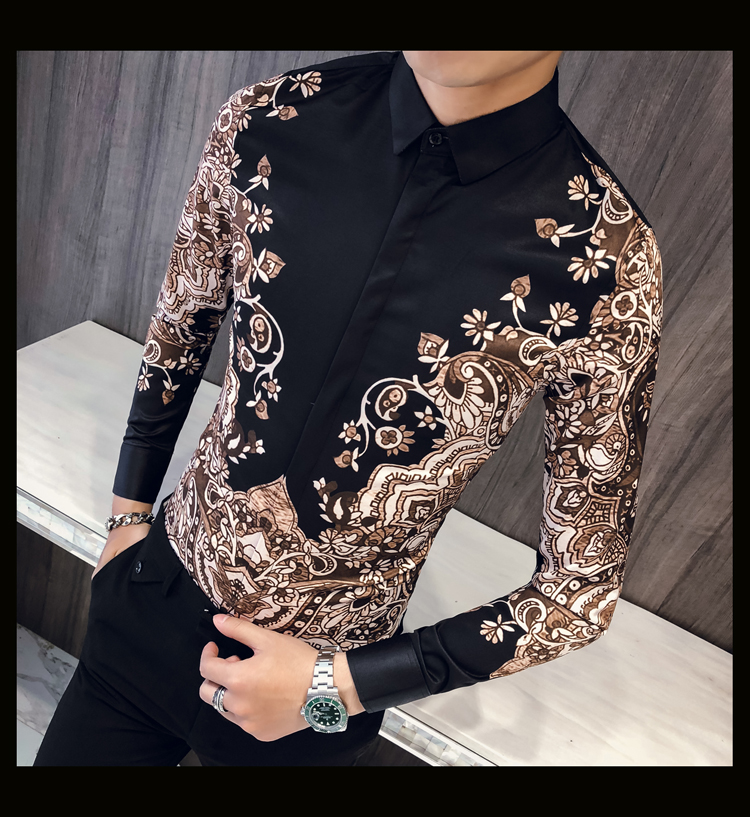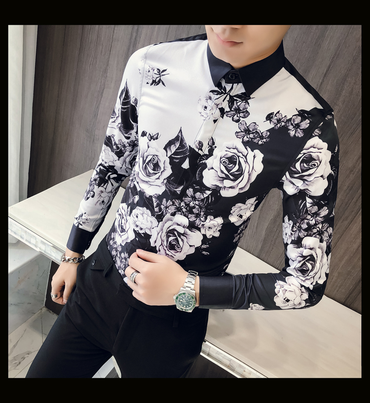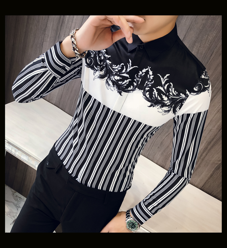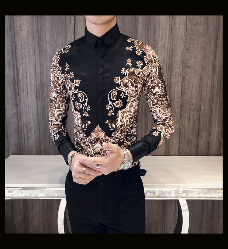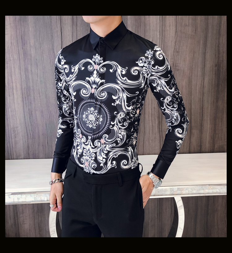 2019新款秋季印花襯衫修身長袖男網紅韓版痞帥氣襯衣社會潮流衣服1入