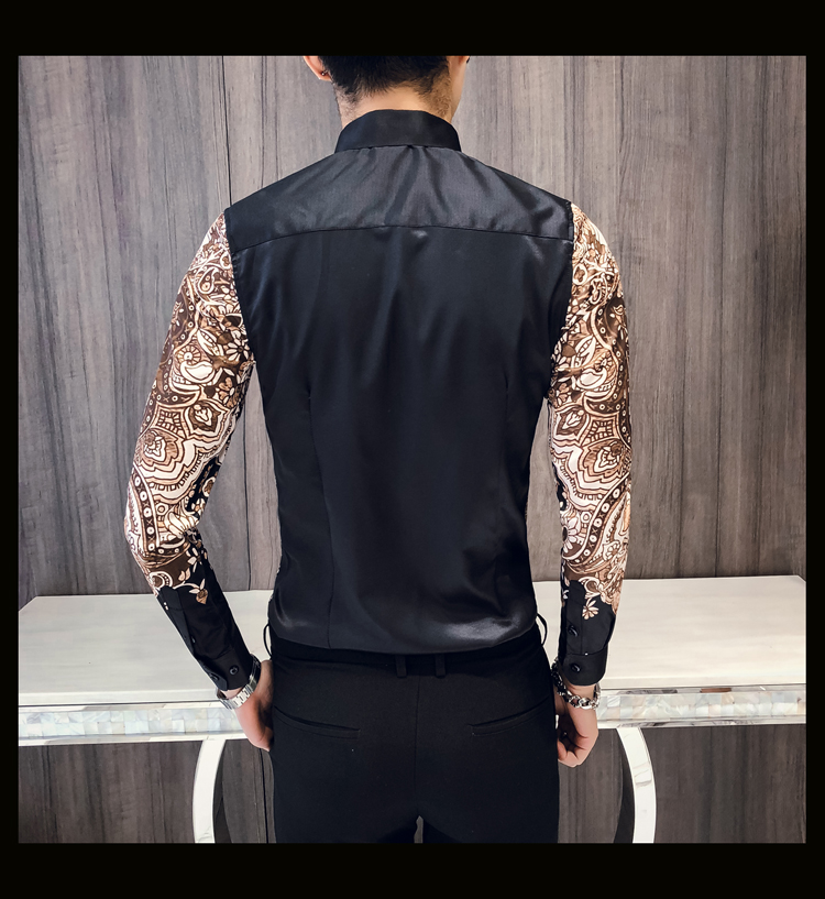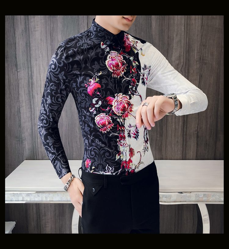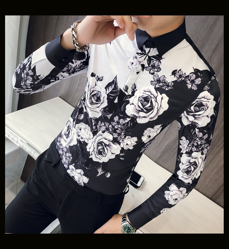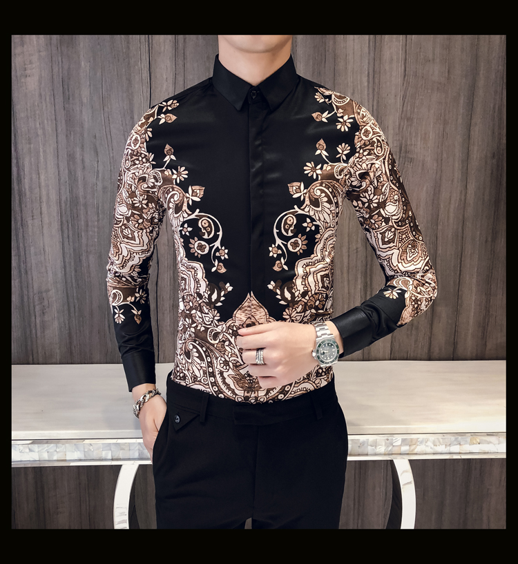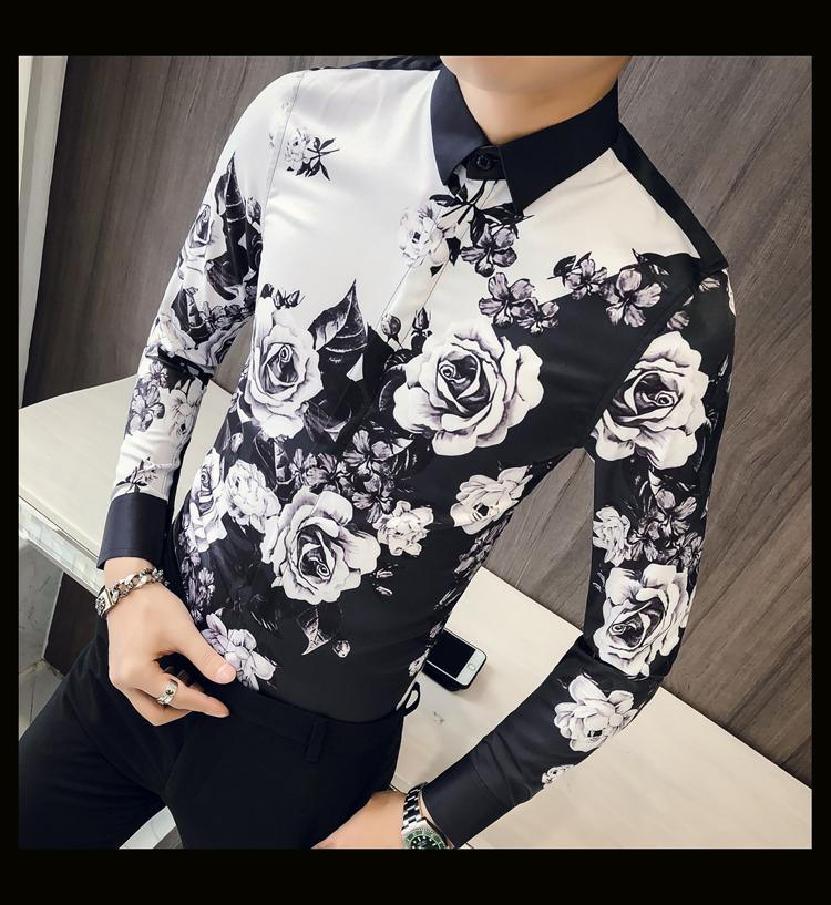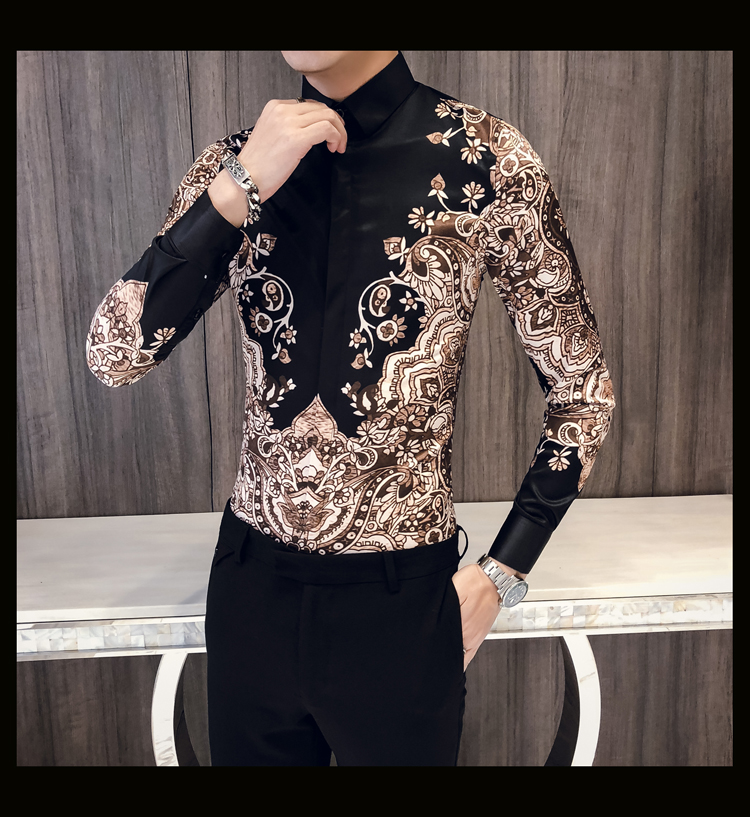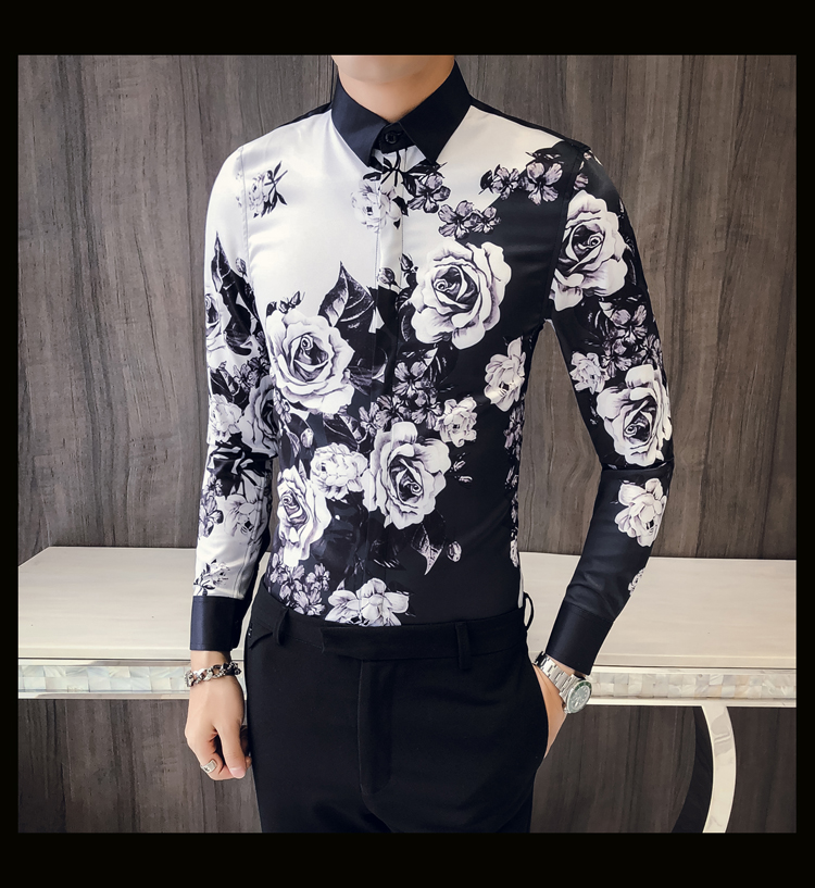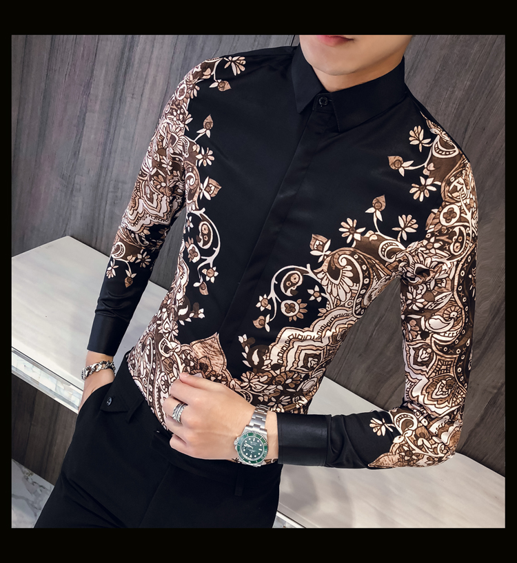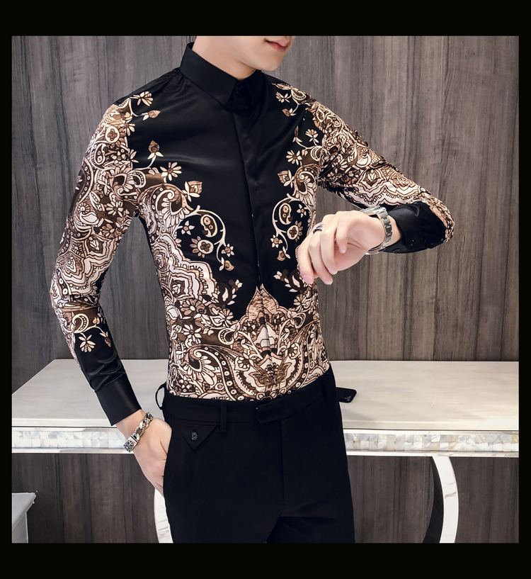 2019新款秋季印花襯衫修身長袖男網紅韓版痞帥氣襯衣社會潮流衣服1入