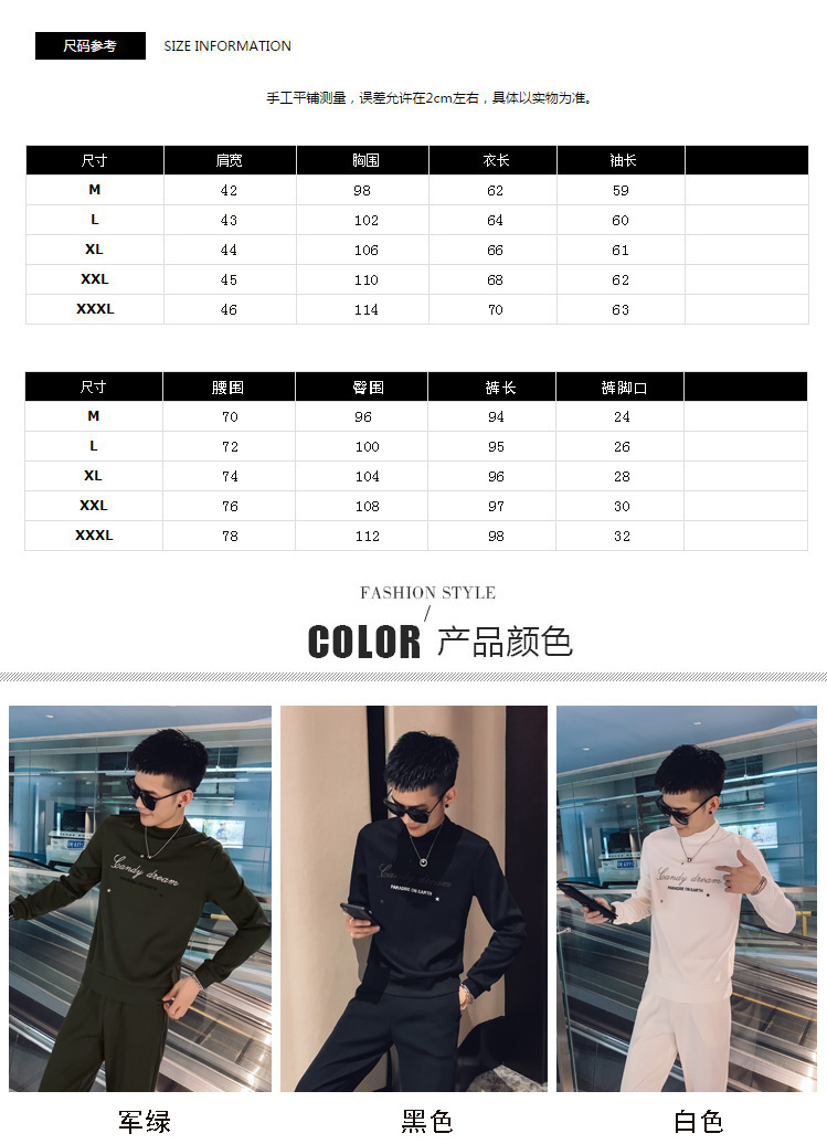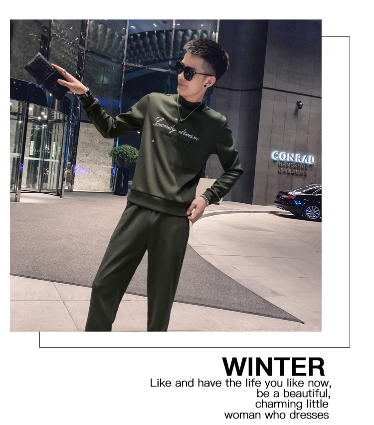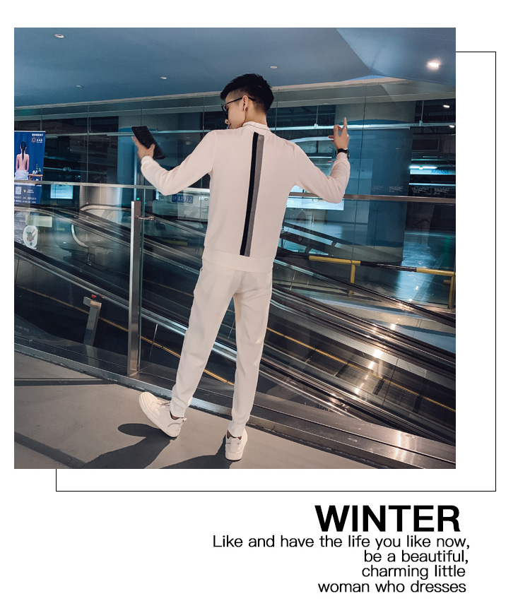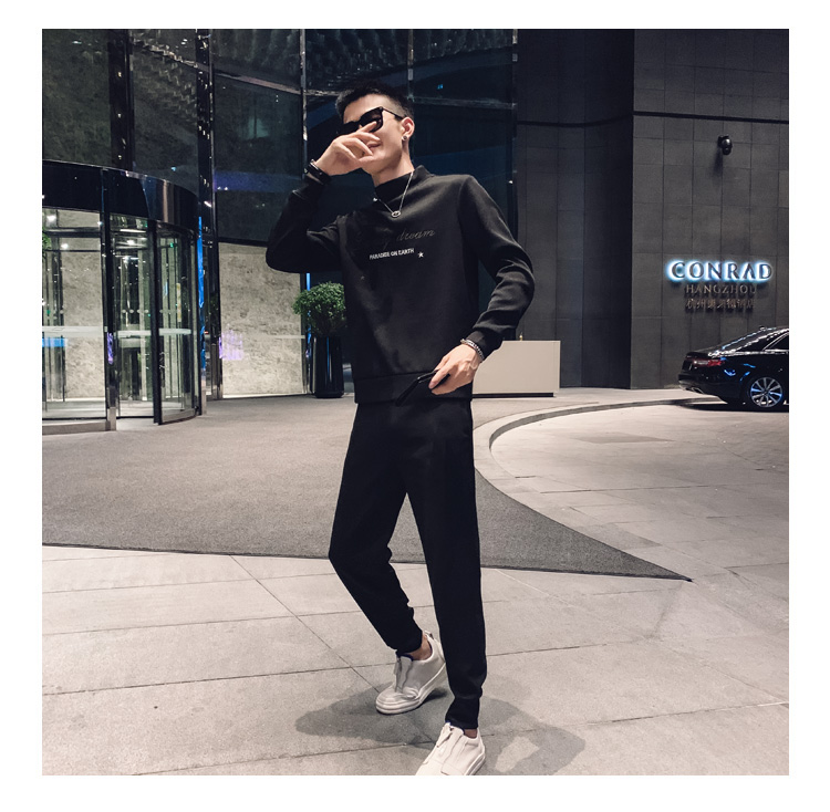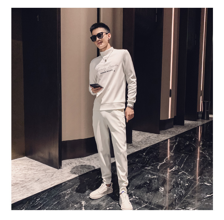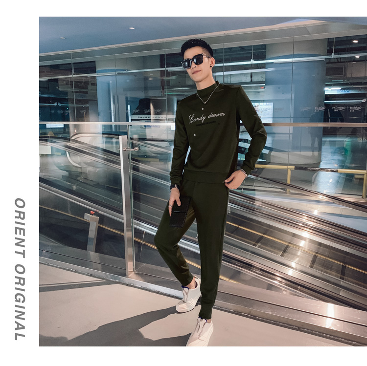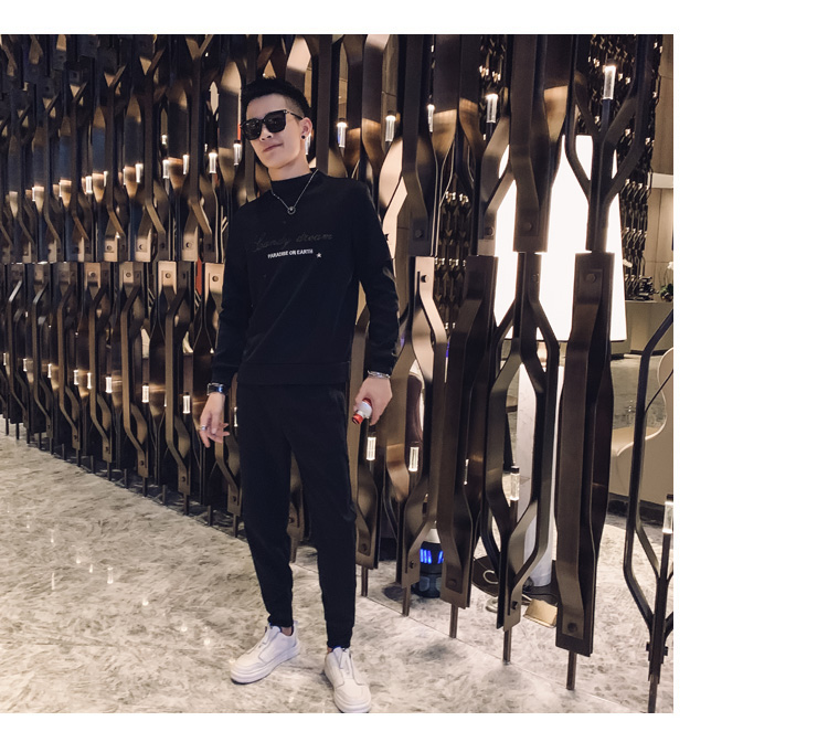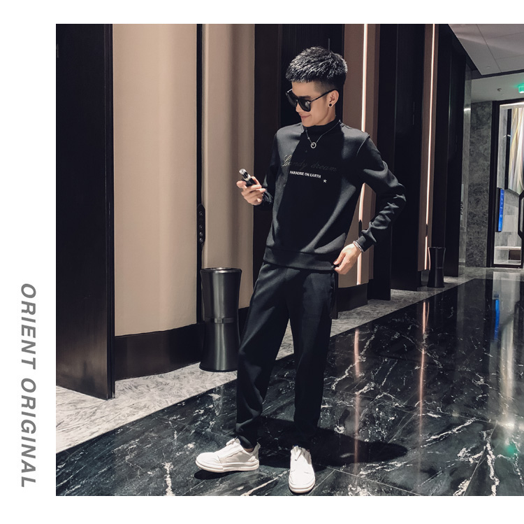 2019秋季修身衛衣一套裝男士韓版休閑運動長褲網紅社會人長袖T恤1入