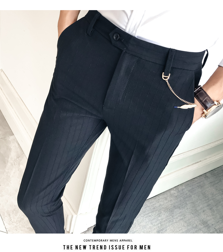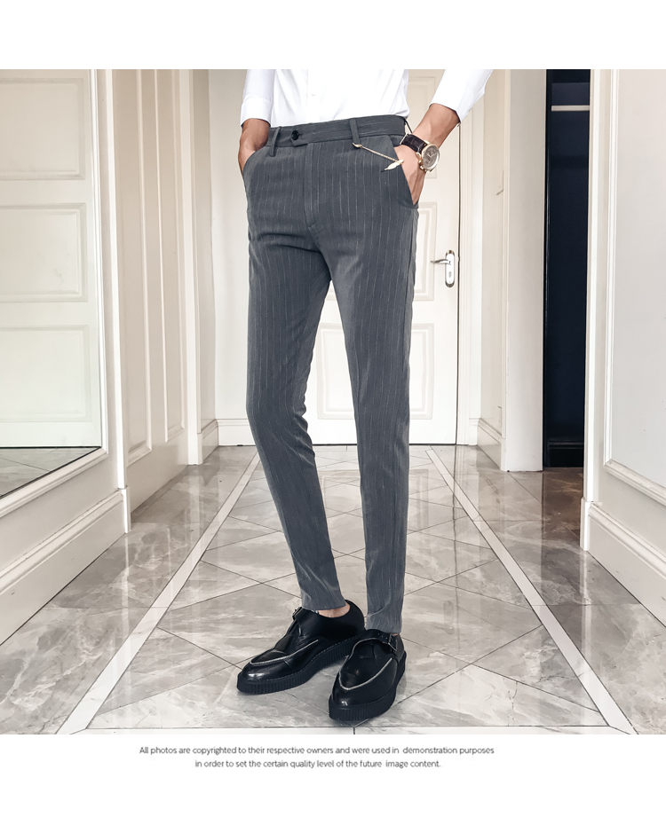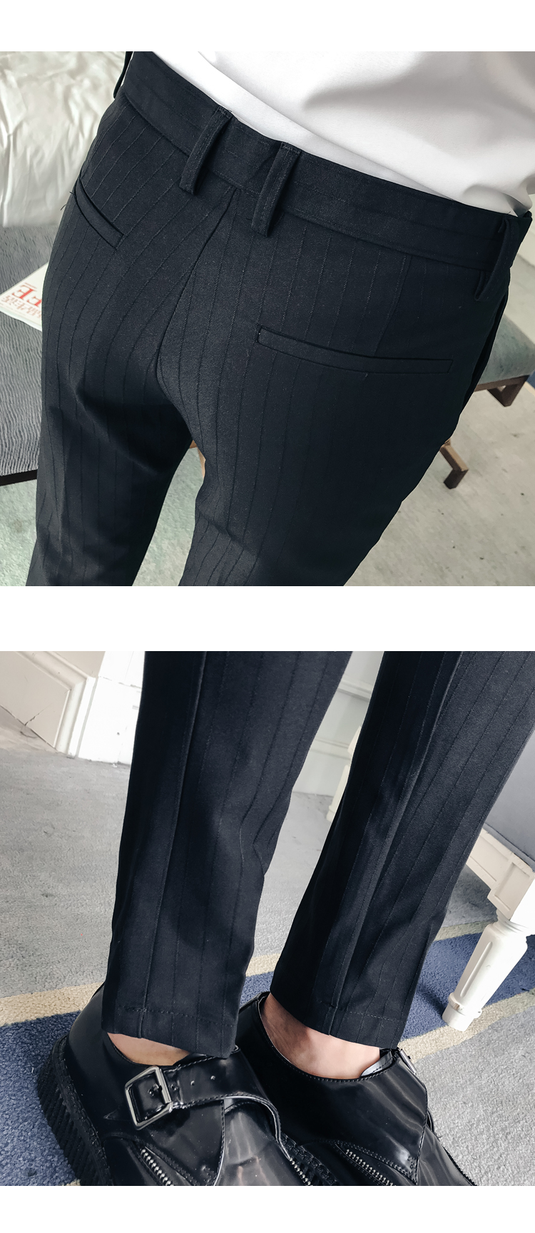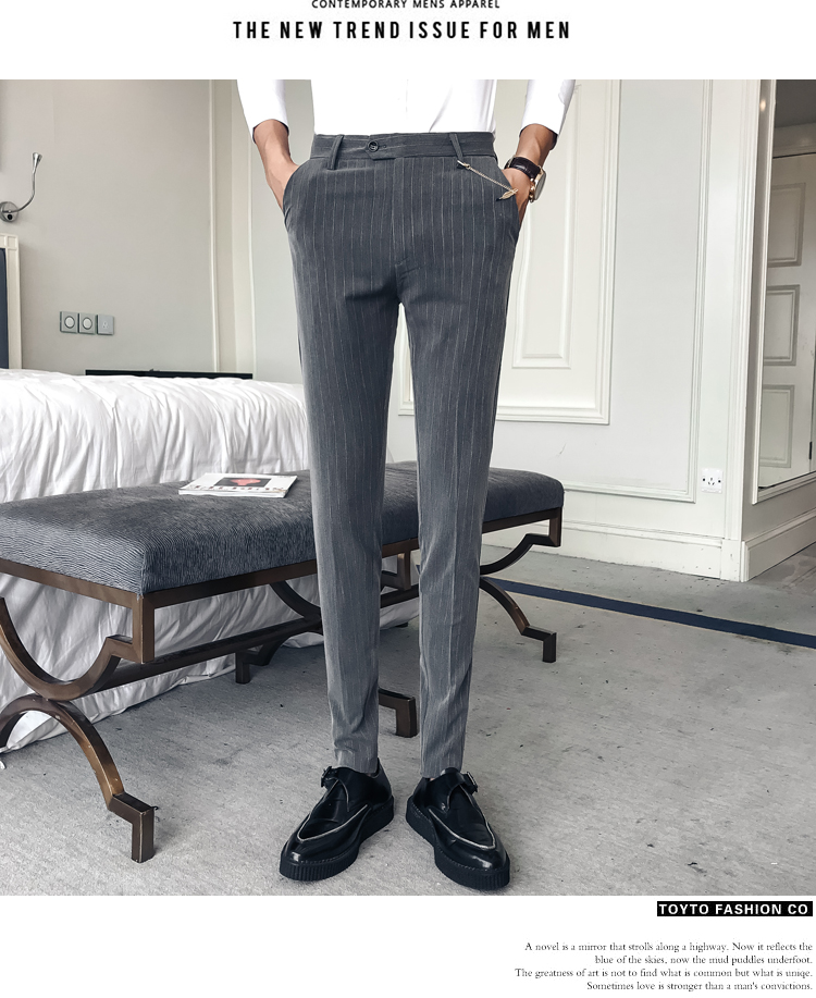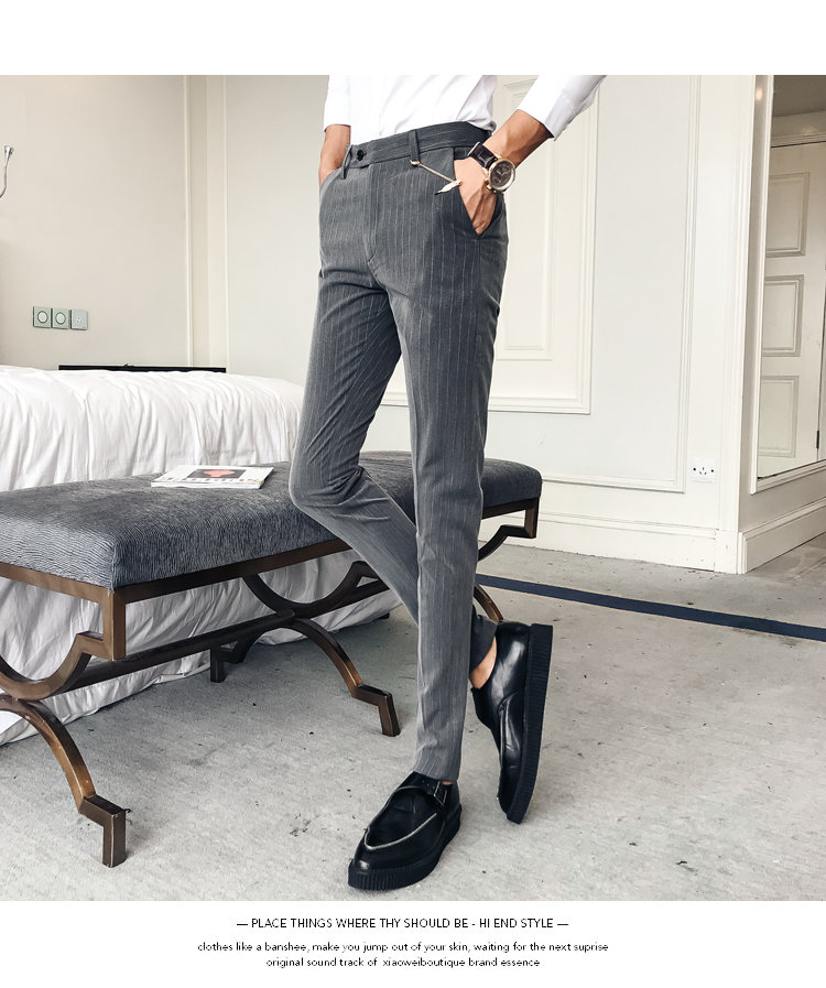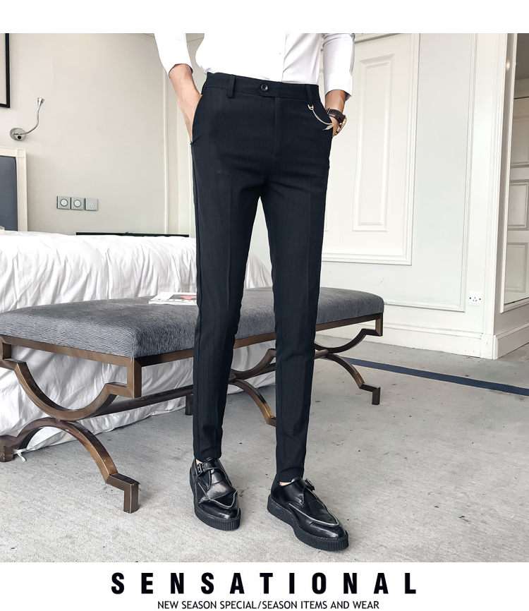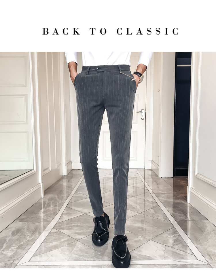 2019秋季英倫商務條紋休閑褲男士韓版修身西褲青年發型師小腳褲潮1入