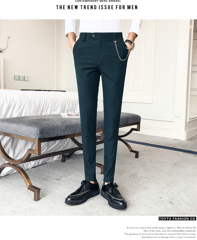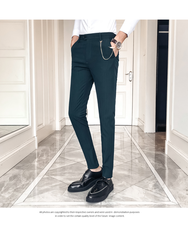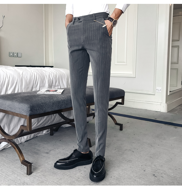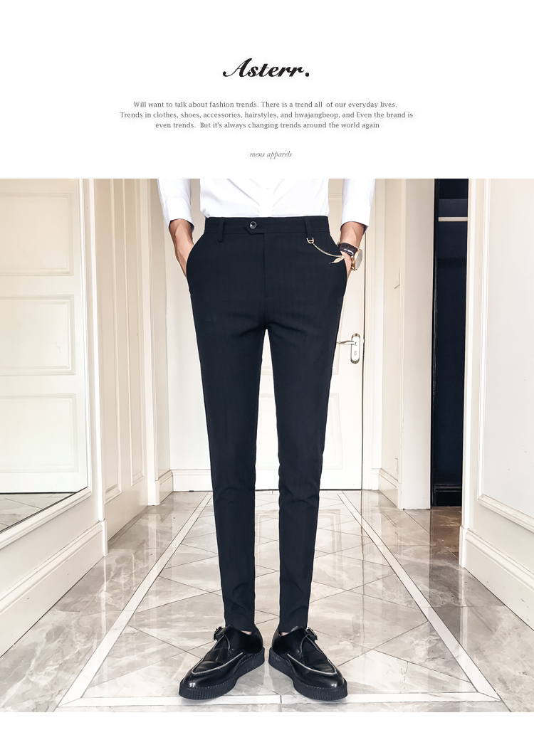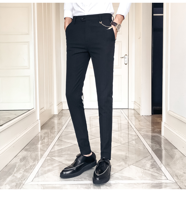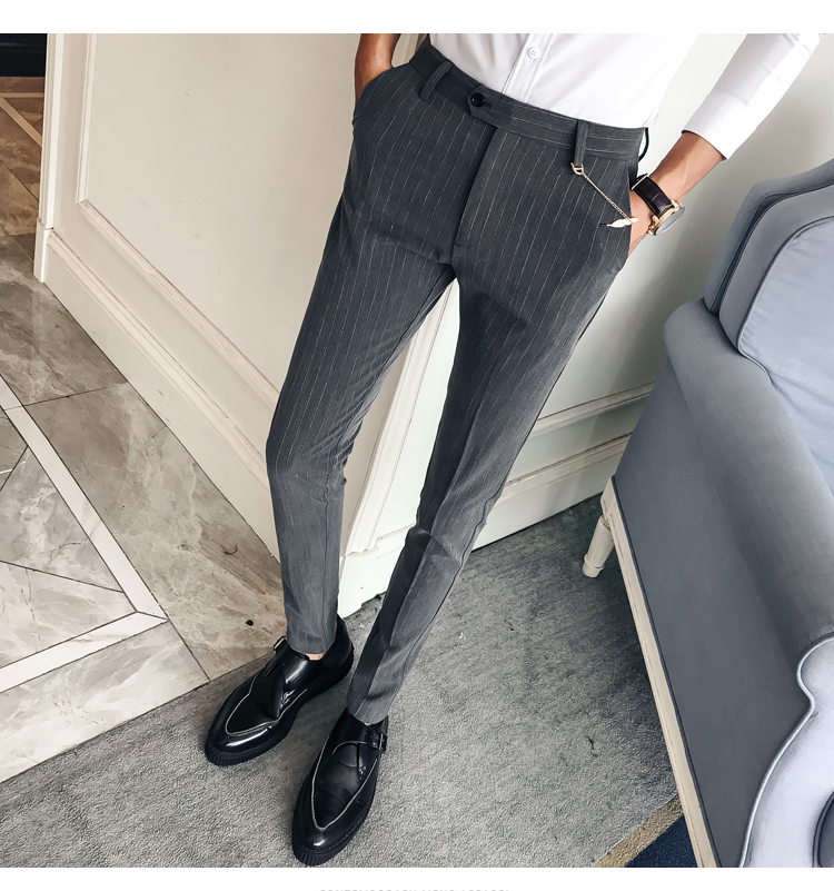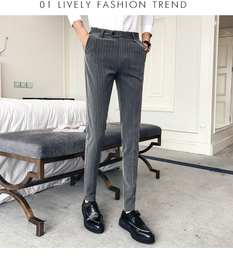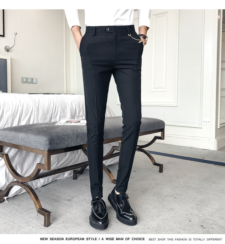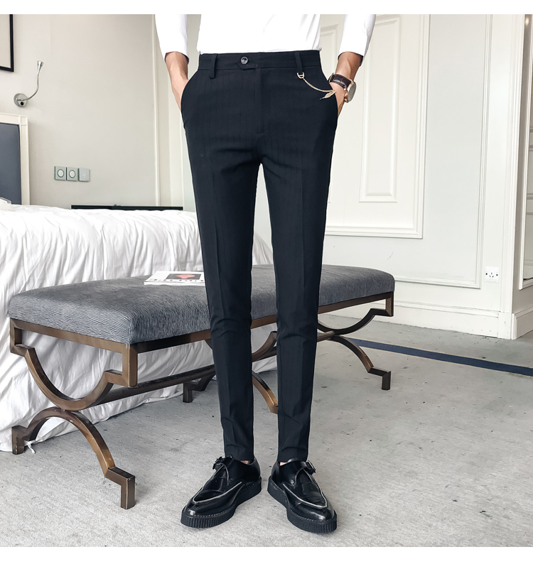 2019秋季英倫商務條紋休閑褲男士韓版修身西褲青年發型師小腳褲潮1入