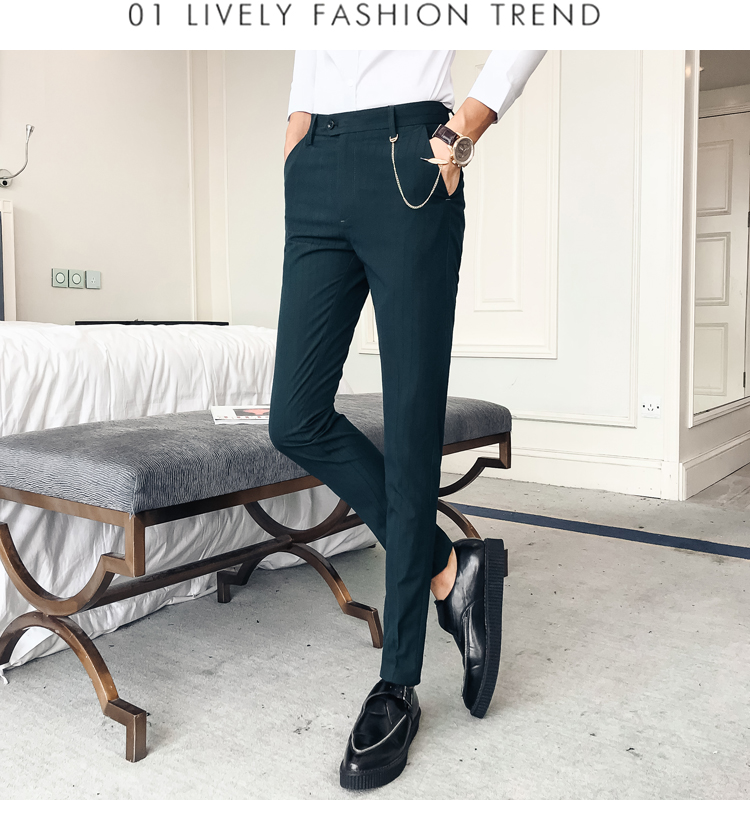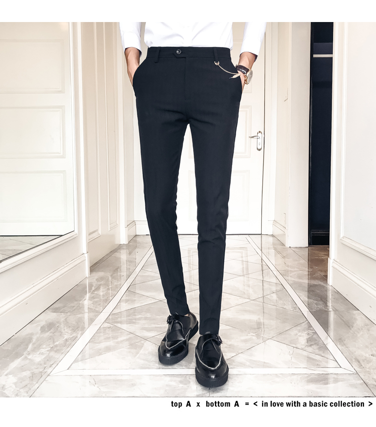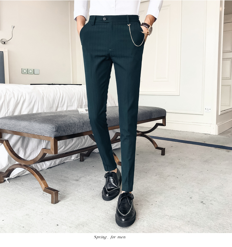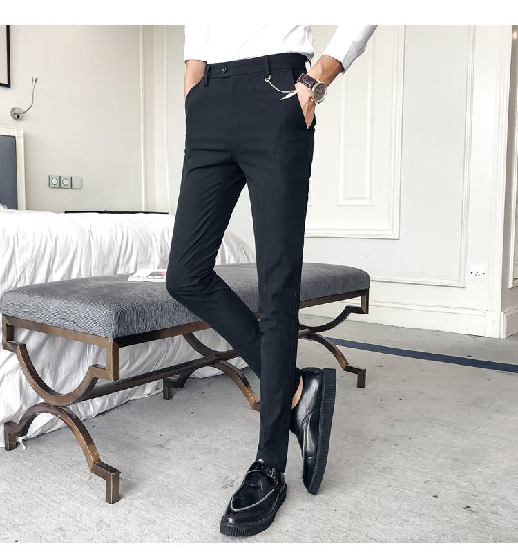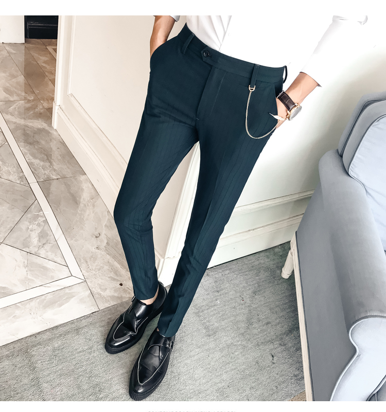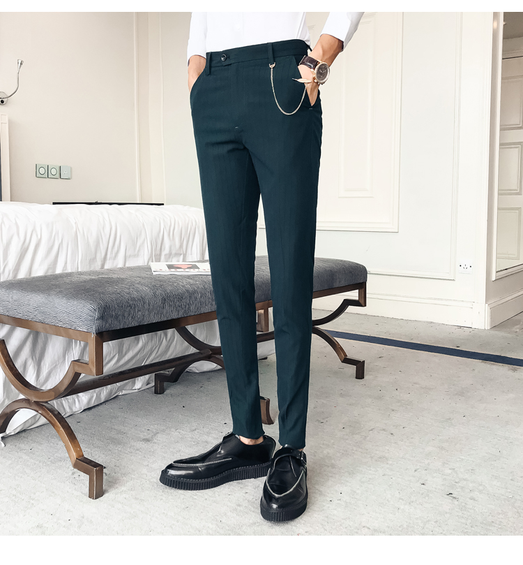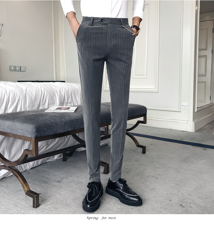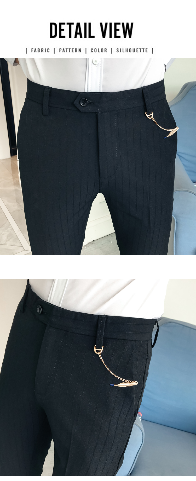 2019秋季英倫商務條紋休閑褲男士韓版修身西褲青年發型師小腳褲潮1入