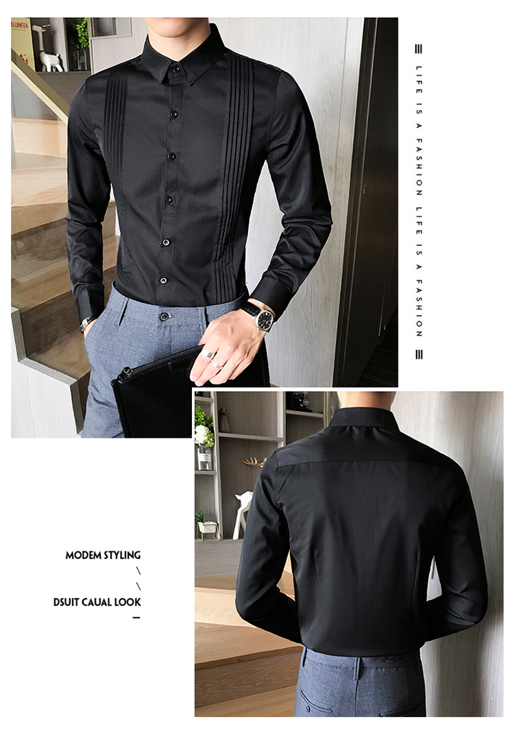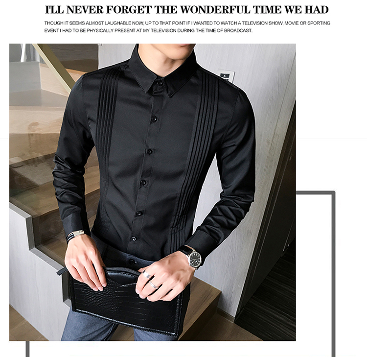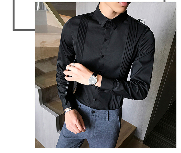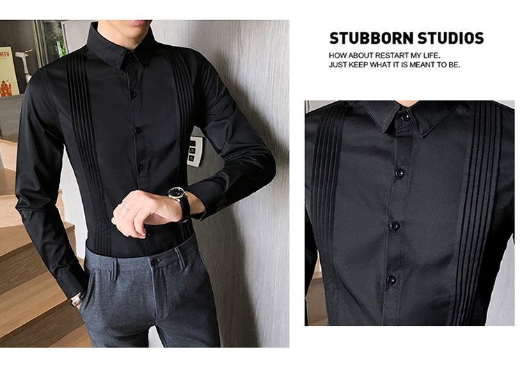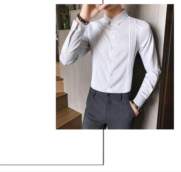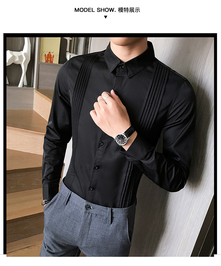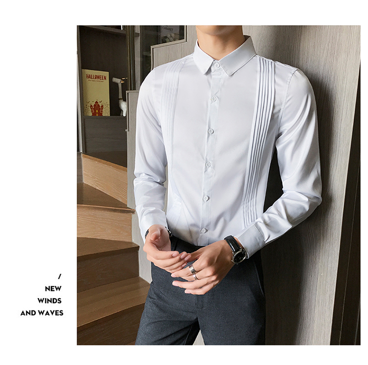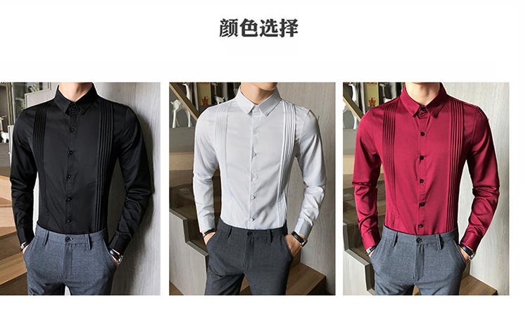 2019春秋男純色襯衫胸前褶皺修身長袖襯衫男青年休閑襯衣婚禮dama1入