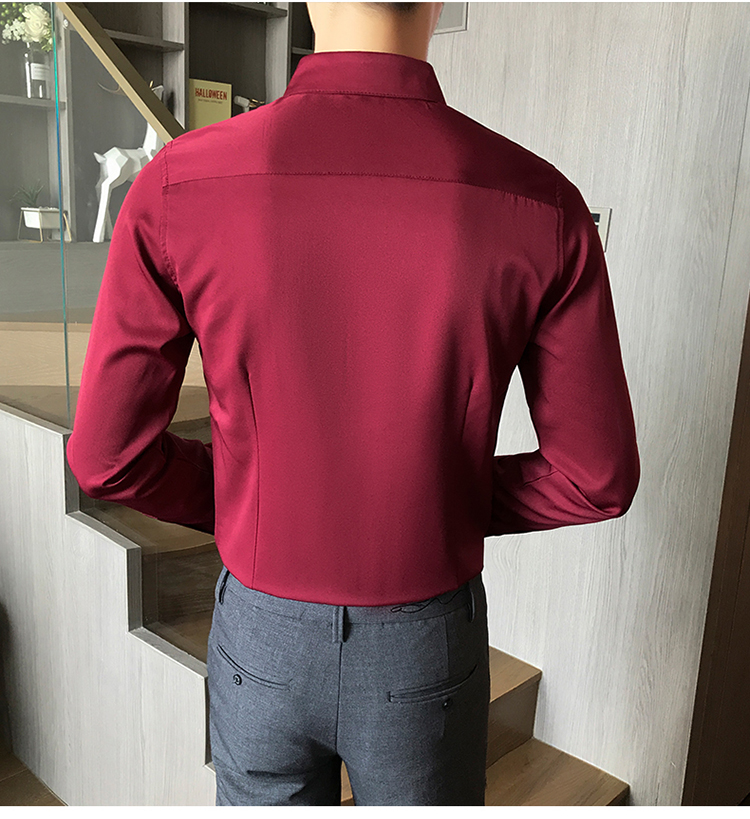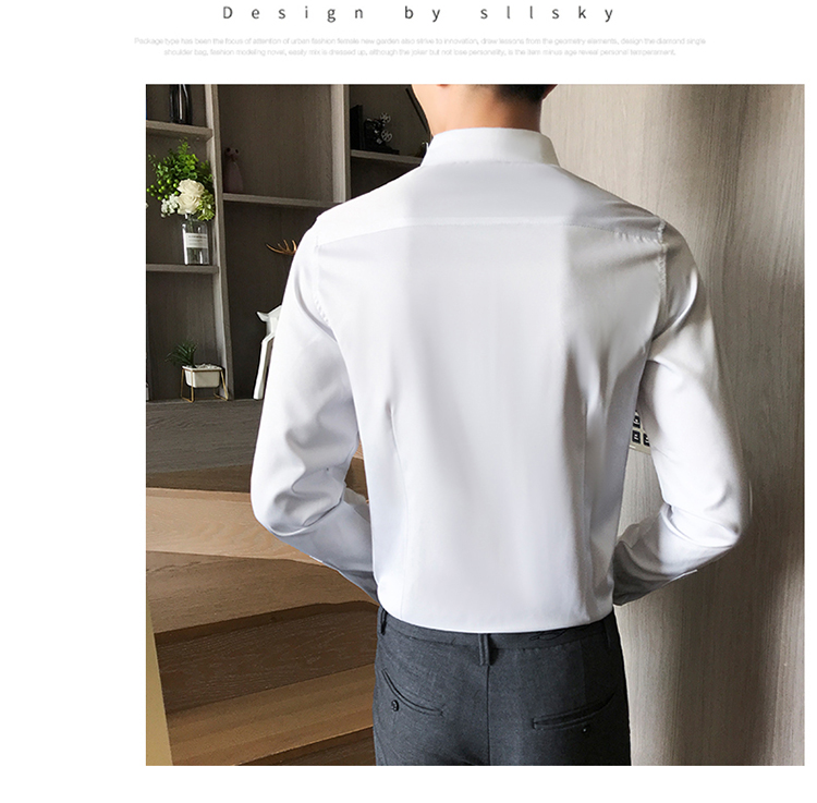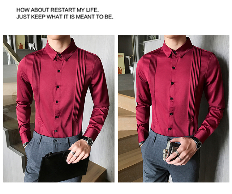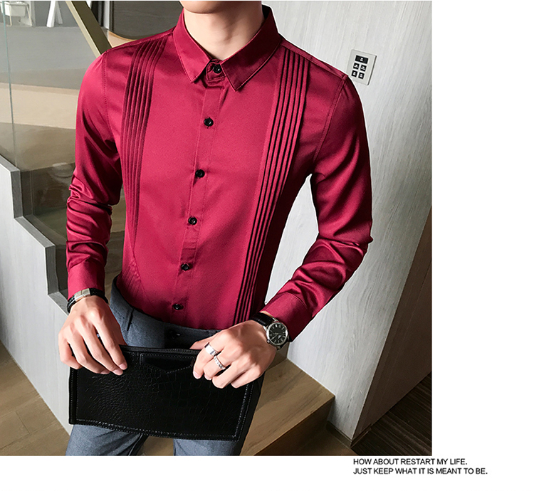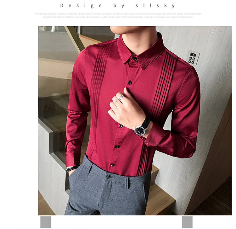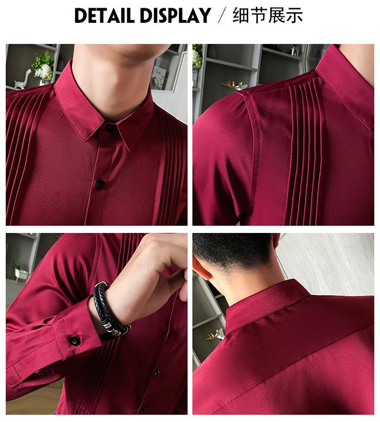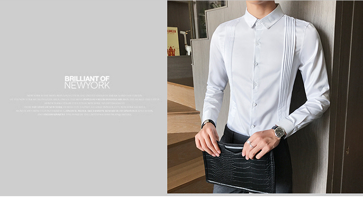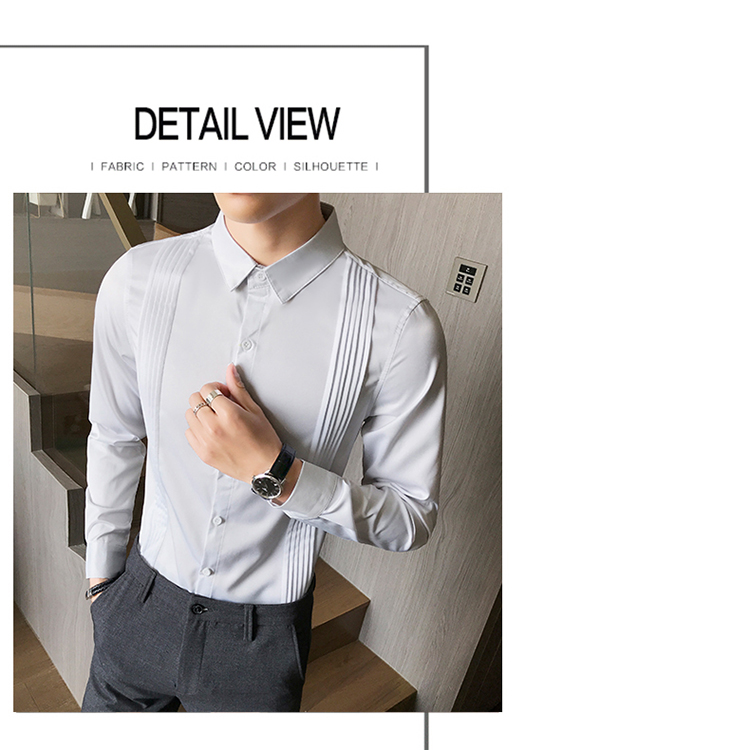 2019春秋男純色襯衫胸前褶皺修身長袖襯衫男青年休閑襯衣婚禮dama1入