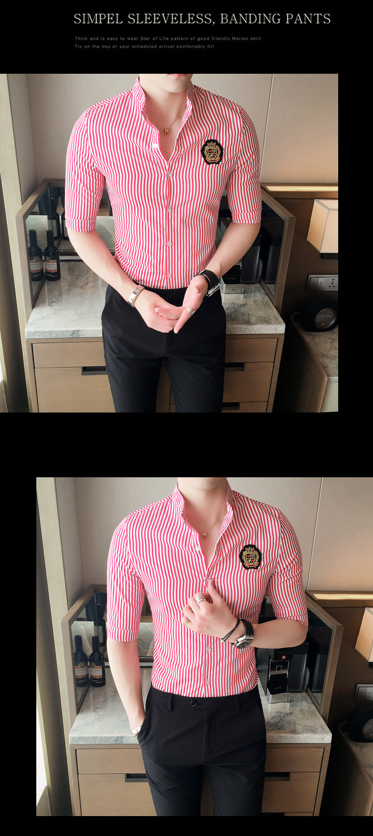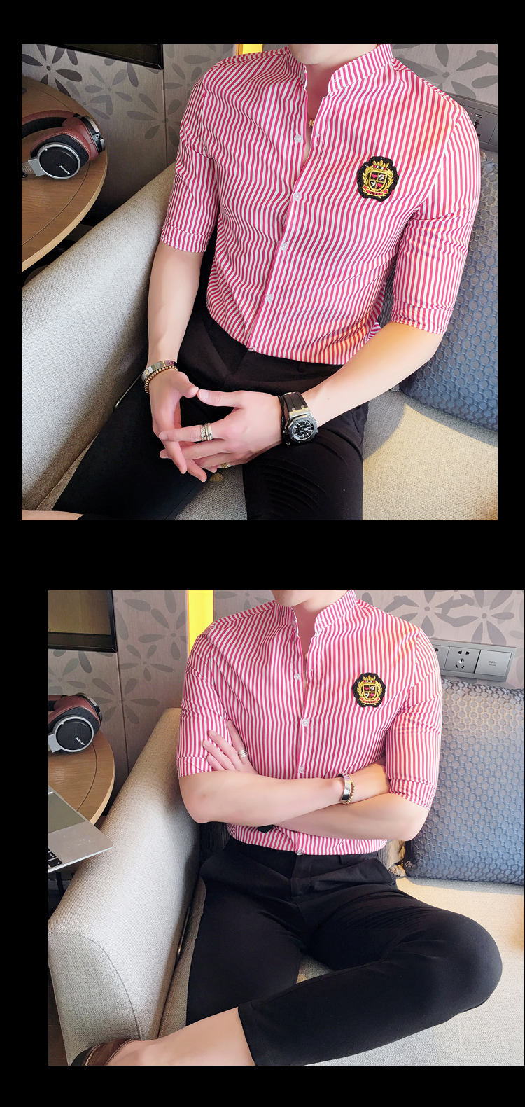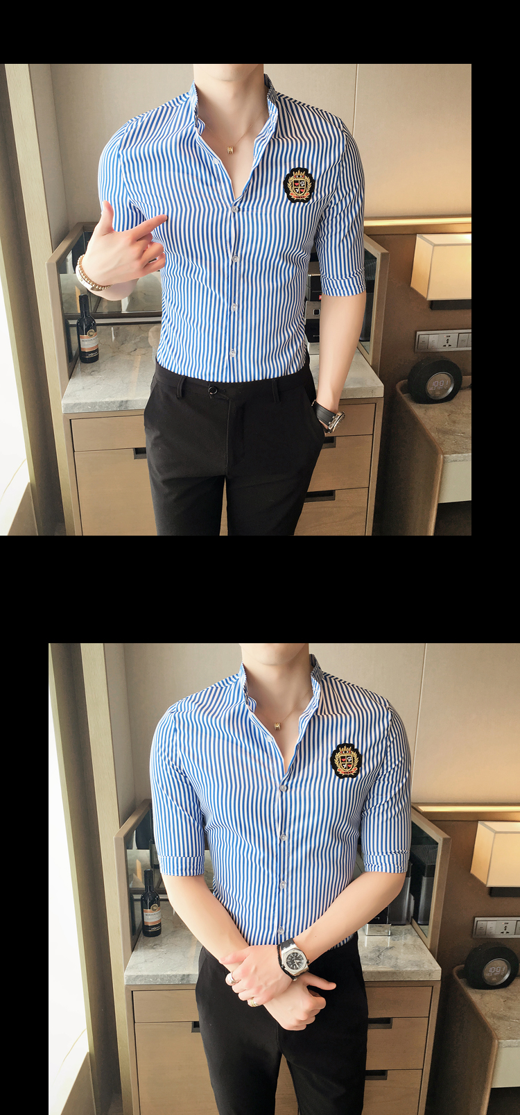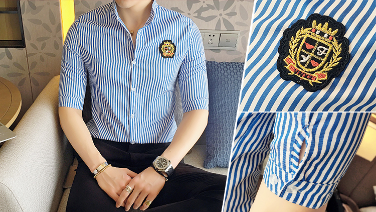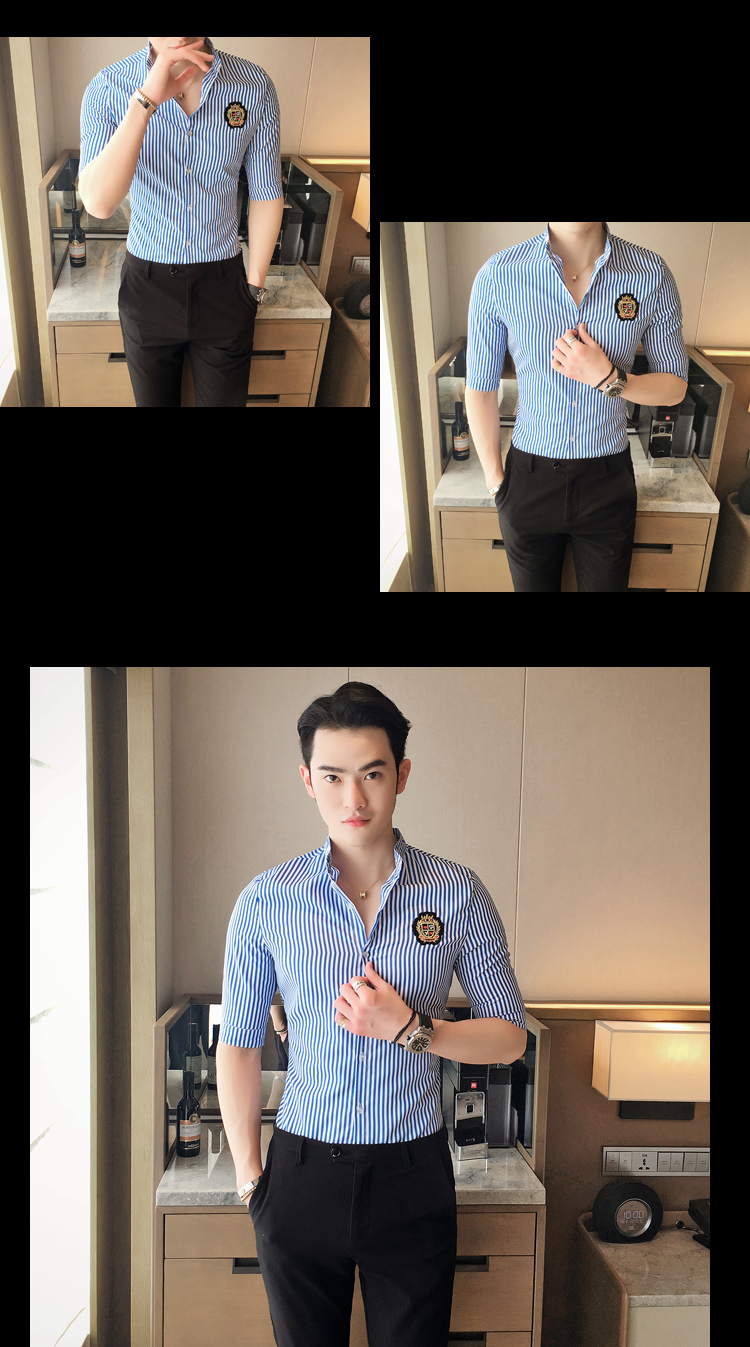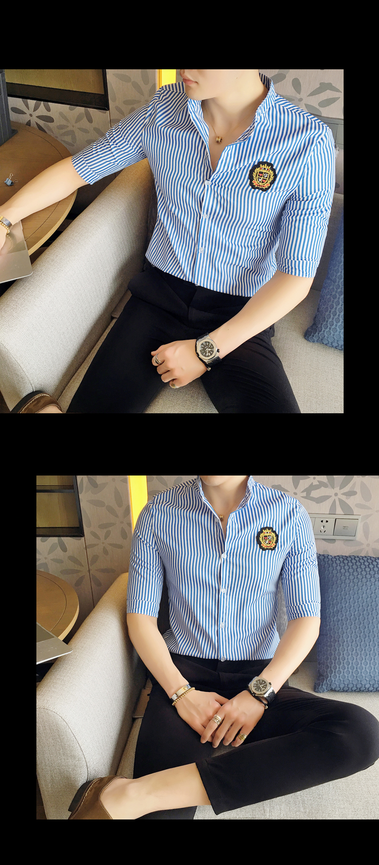 2017夏季男士條紋中袖襯衫青年韓版修身七分袖襯衣發型師立領短袖1入