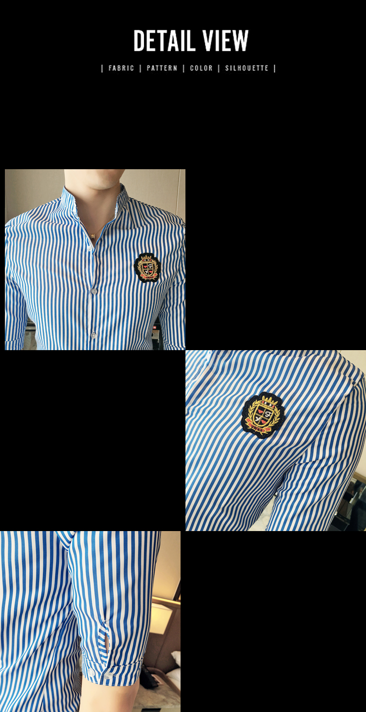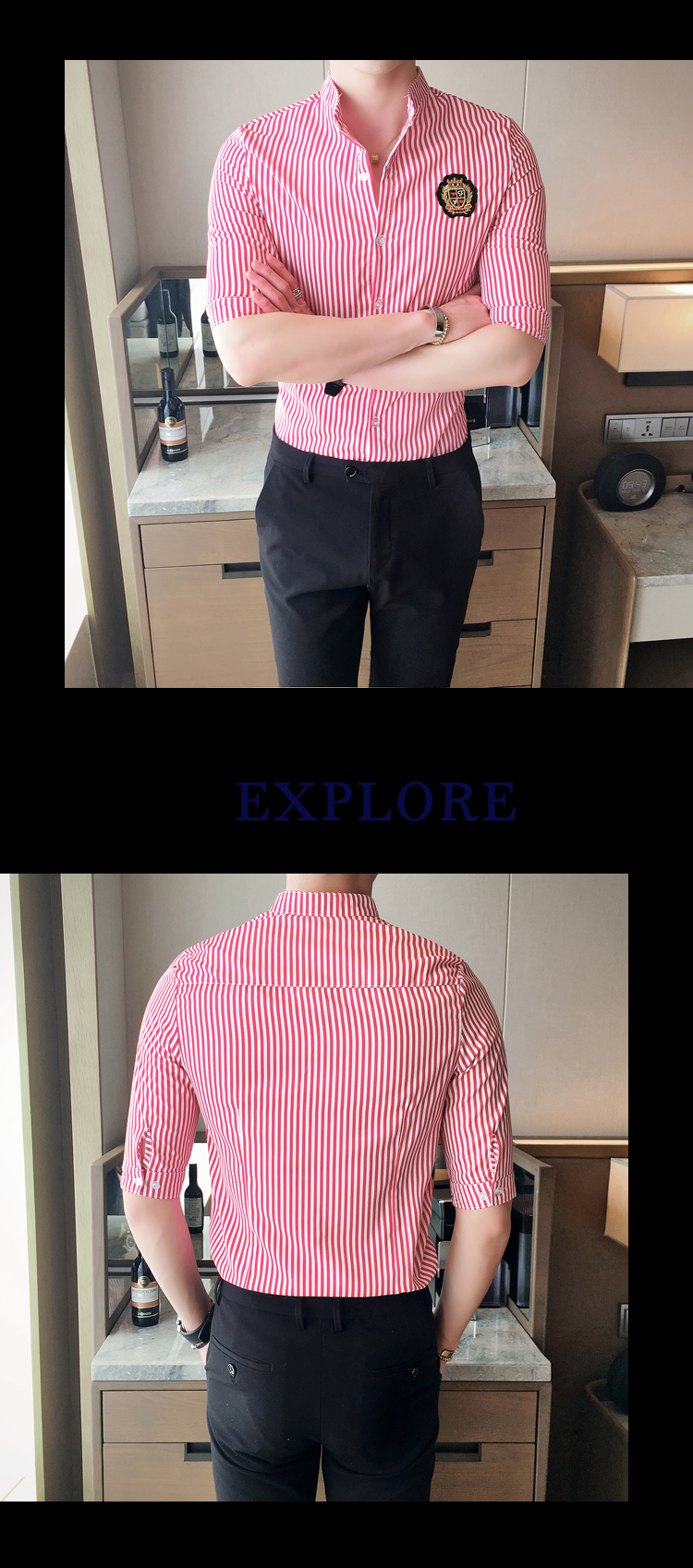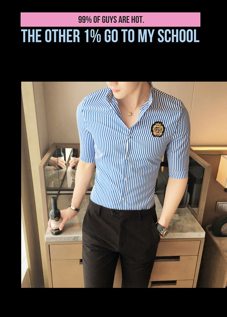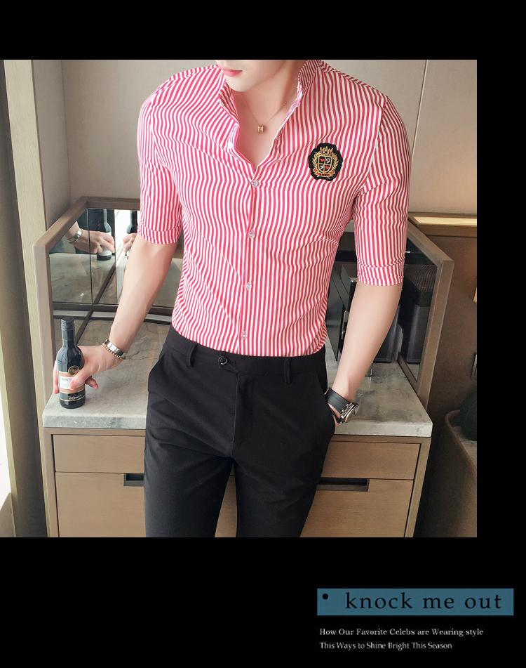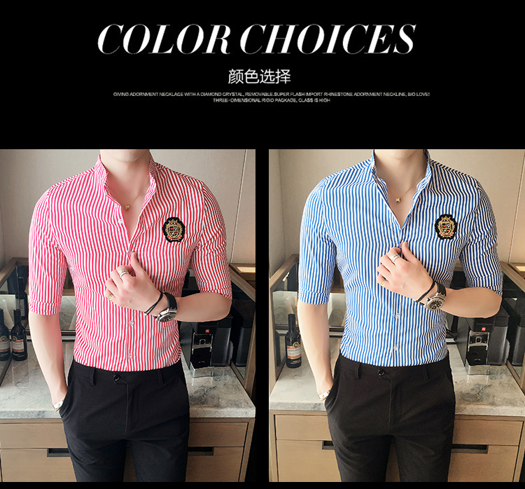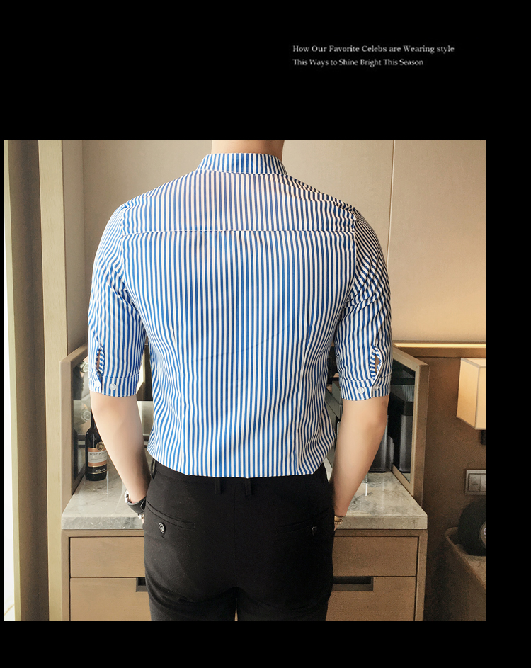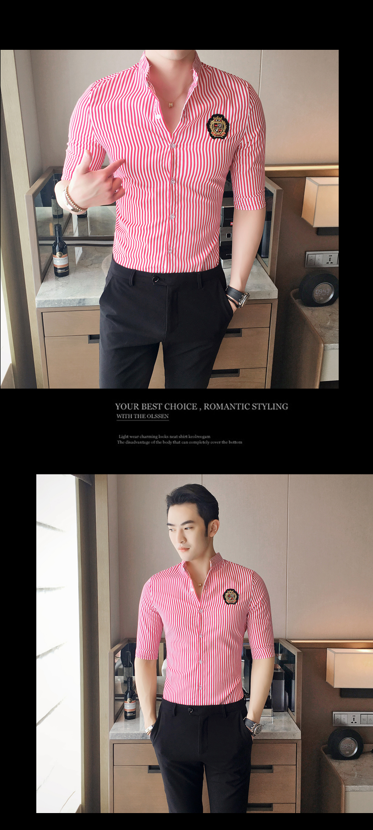 2017夏季男士條紋中袖襯衫青年韓版修身七分袖襯衣發型師立領短袖1入