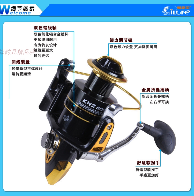 舒適的橡膠手柄鈕手感更好,CNC鋁搖臂 雙色氧化鋁合金線杯,超大容量,更加牢固耐用,專為釣友設計,纏線量更大拋的更遠!