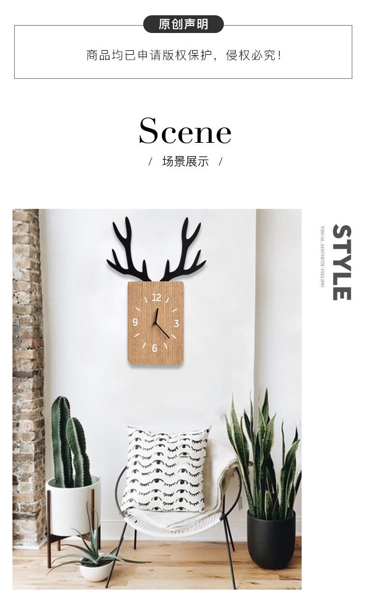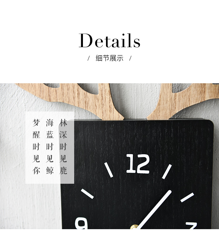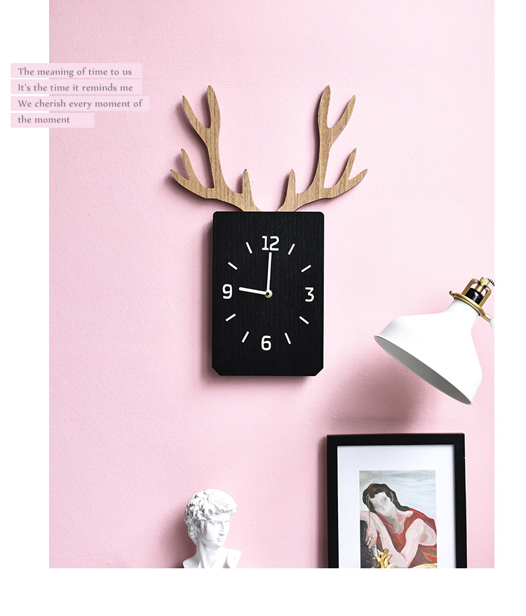 北歐裝飾創意INS鹿角鐘表客廳壁掛墻面臥室靜音時鐘木質方形掛表1入