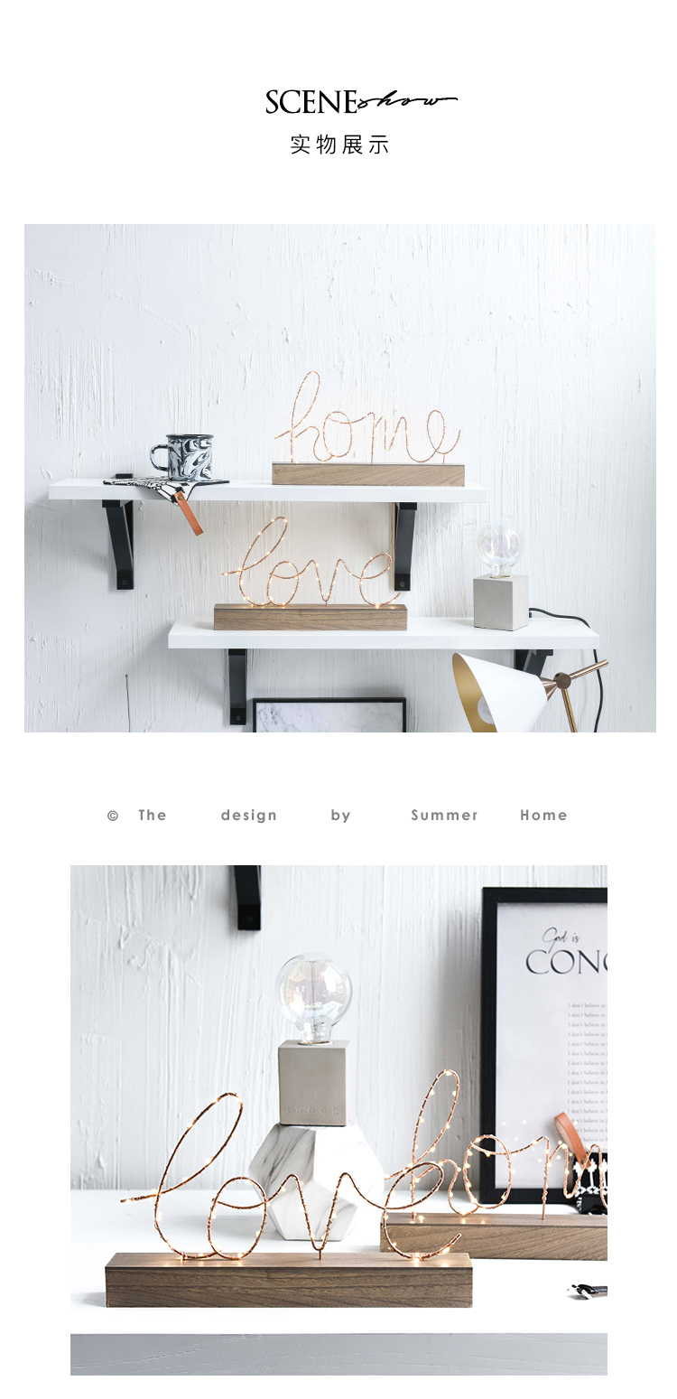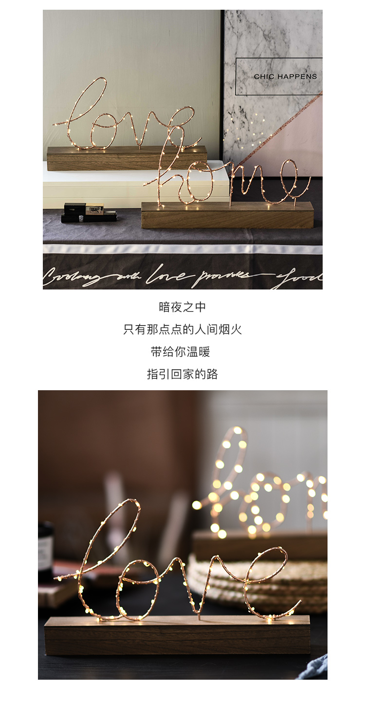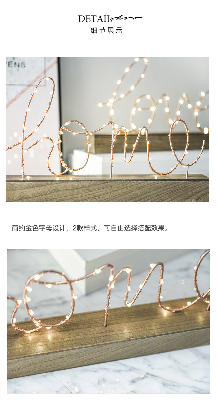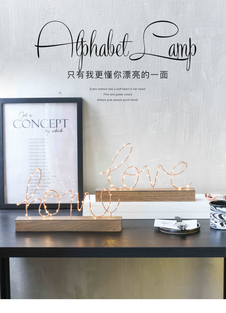 北歐INS創意家居擺件臥室床頭鐵藝木底字母小夜燈圣誕節生日禮物1入