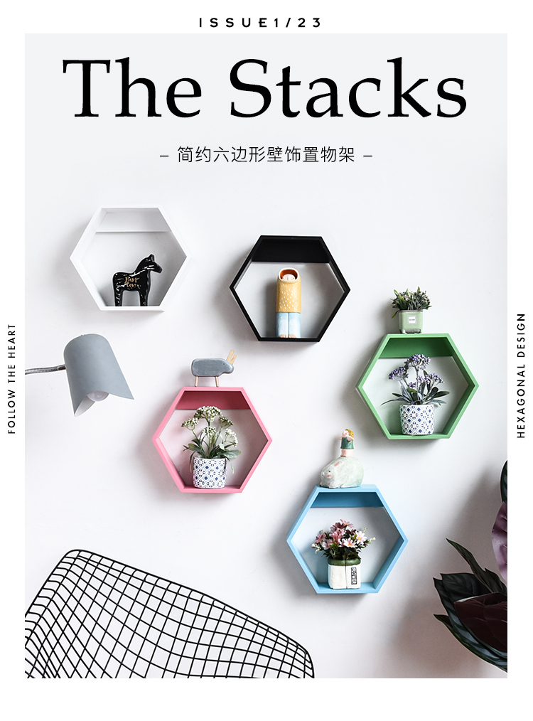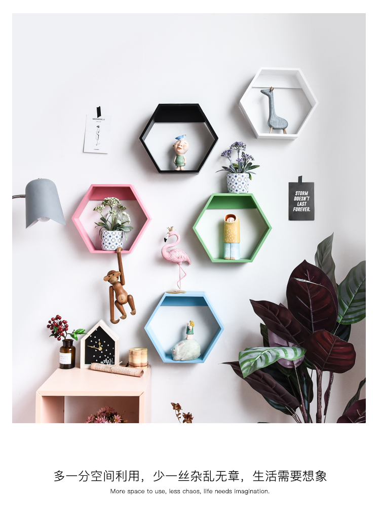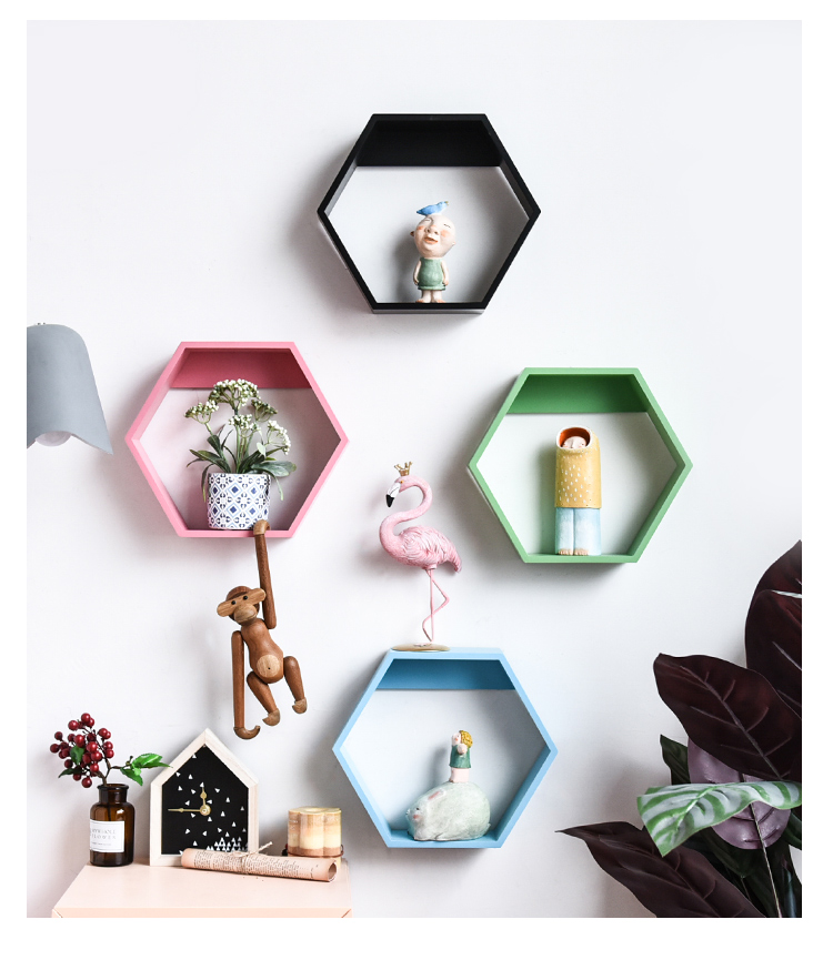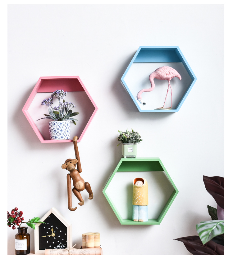 北歐創意木質六邊形客廳櫥窗背景墻面裝飾壁掛置物架組合隔板架1入